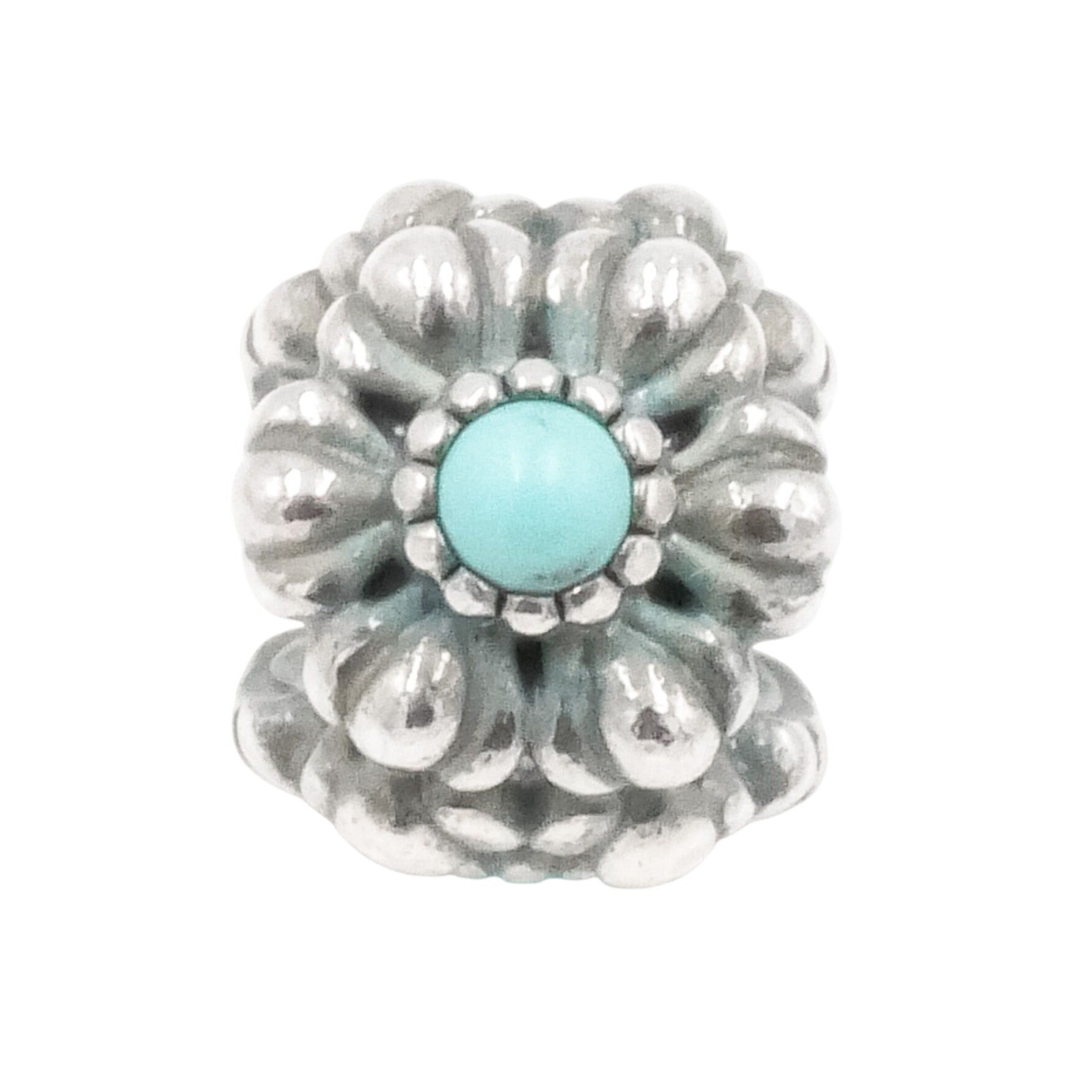Crafted in sterling silver, the charm showcases a dimensional flower motif with softly rounded petals surrounding the bright blue stone, symbolizing the December birthstone. The bold contrast between the polished silver and the vivid turquoise hue makes this piece both eye-catching and meaningful.