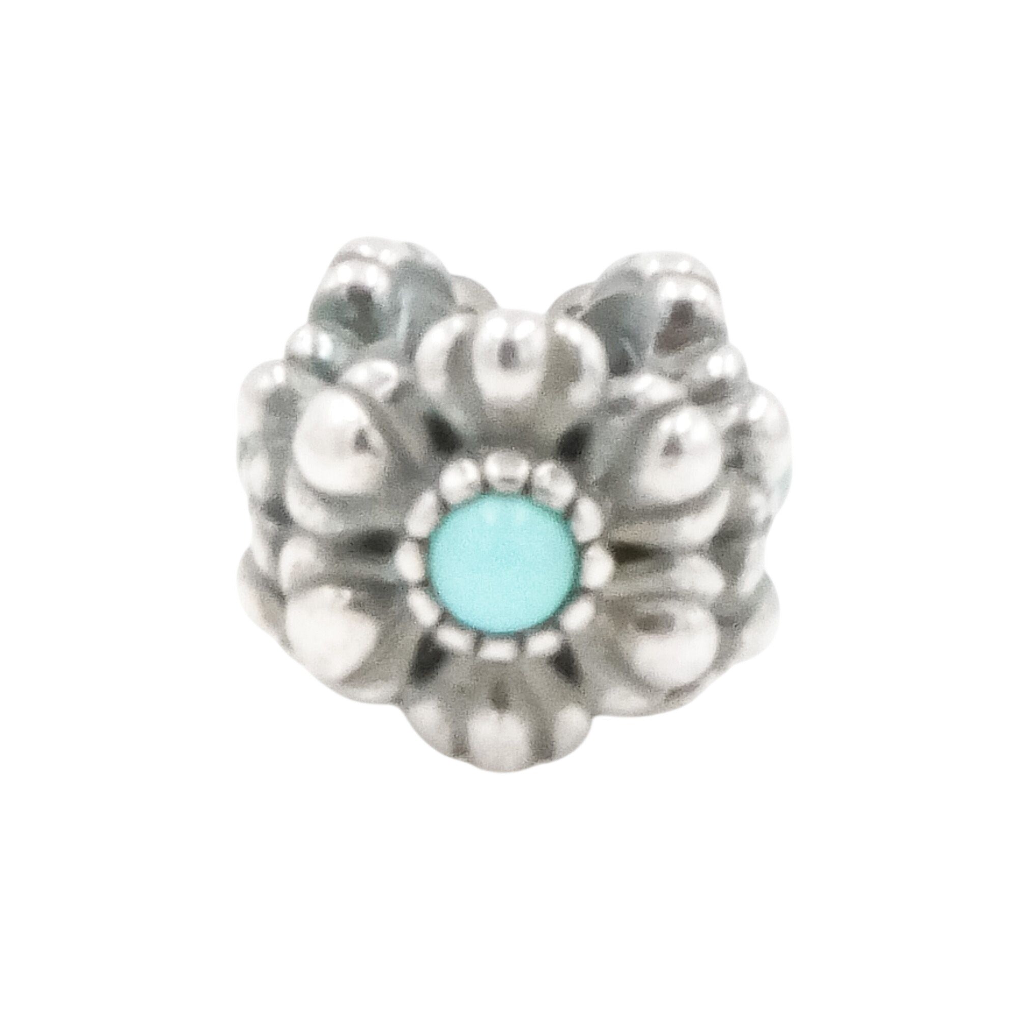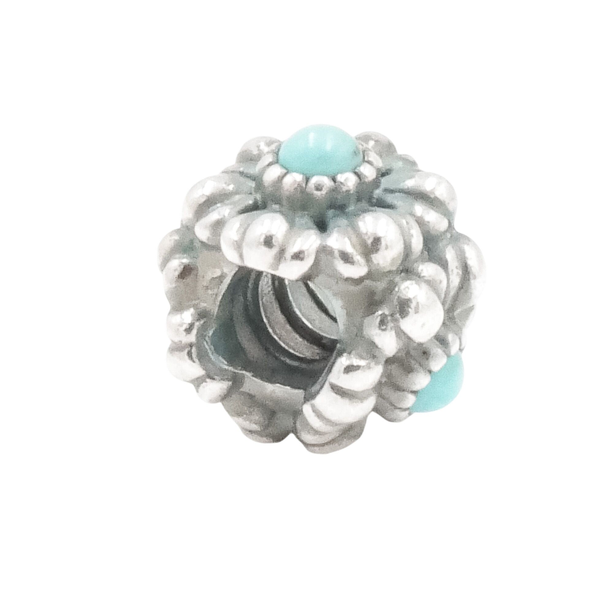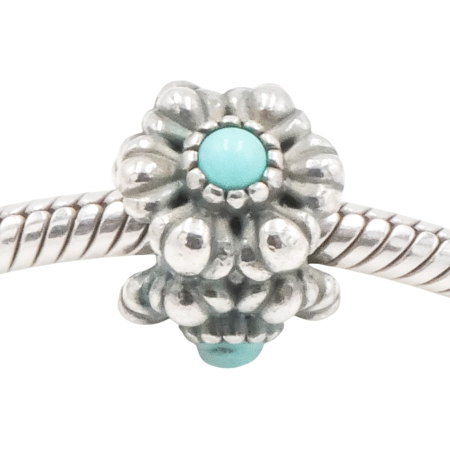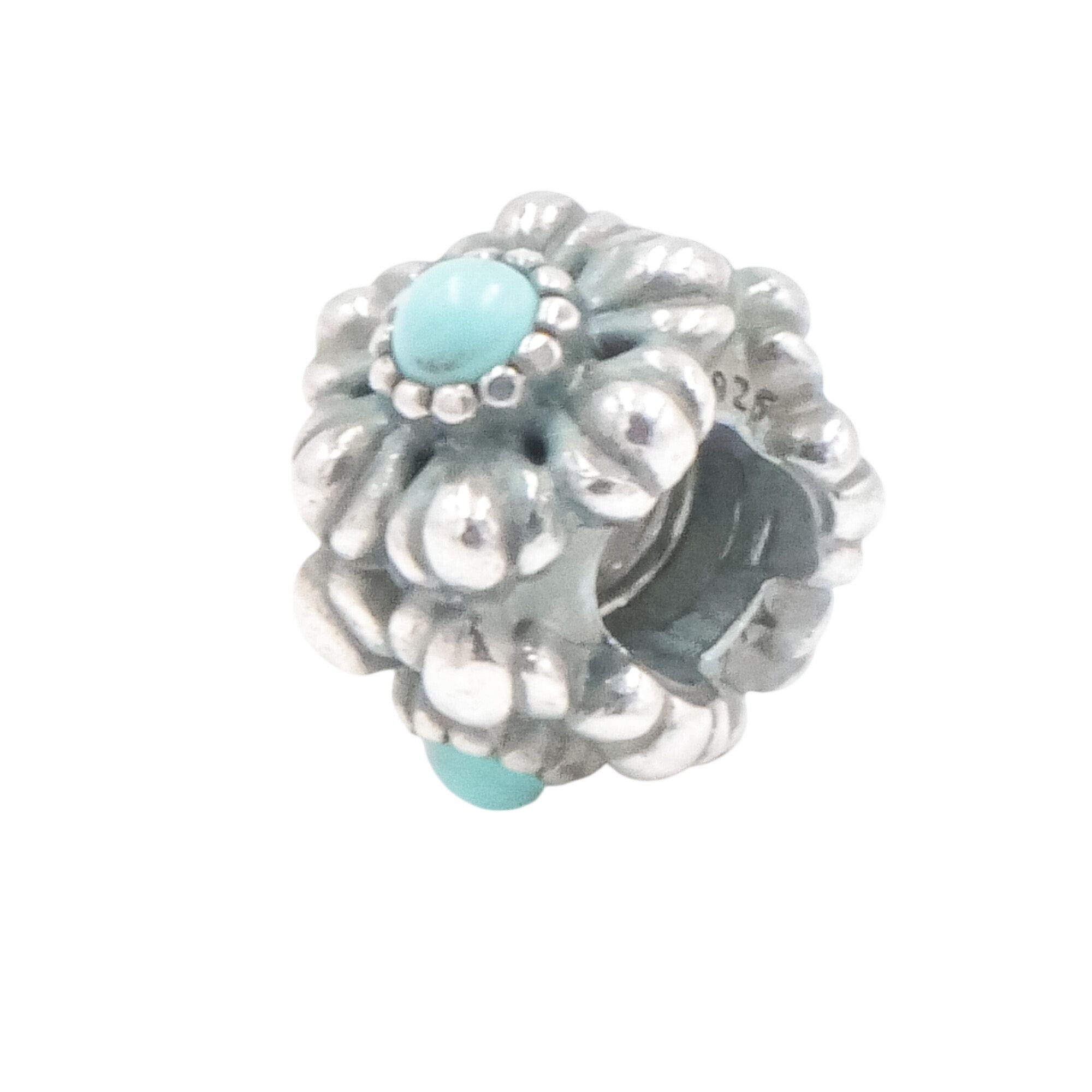 Celebrate December birthdays with this beautifully detailed Pandora Birthday Bloom charm, featuring a vibrant turquoise-colored center set within an intricate floral design.