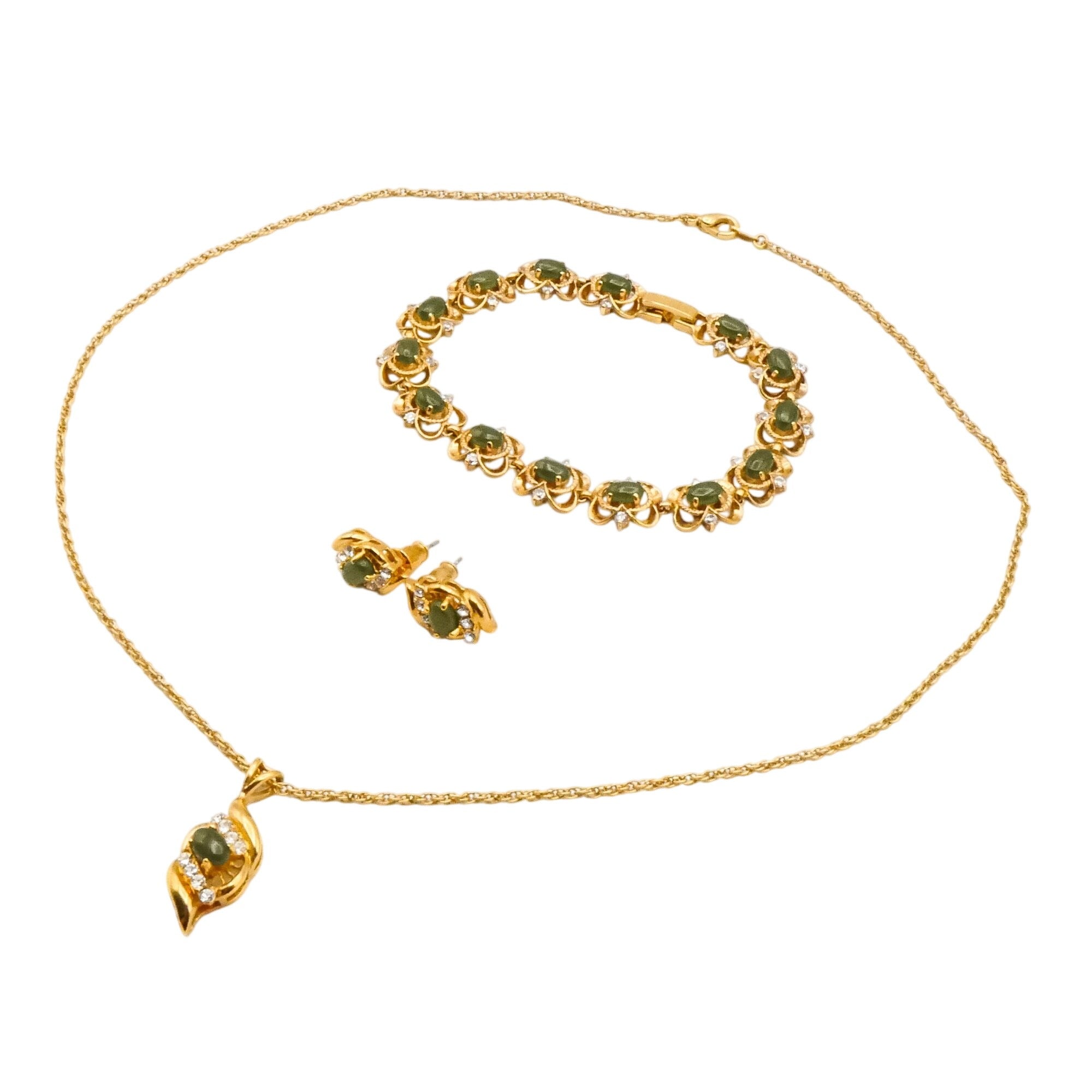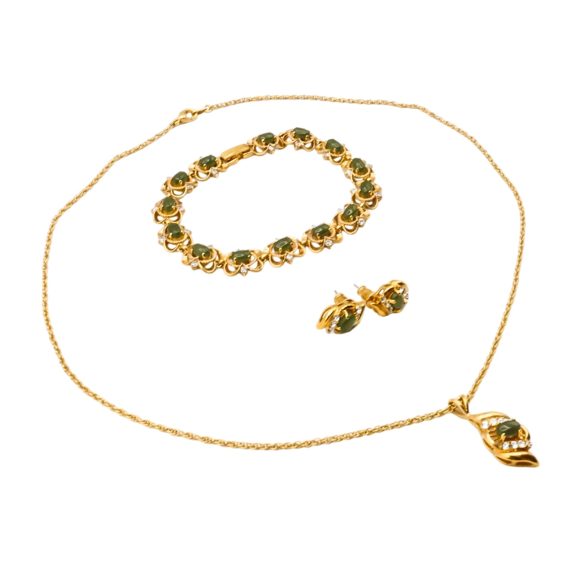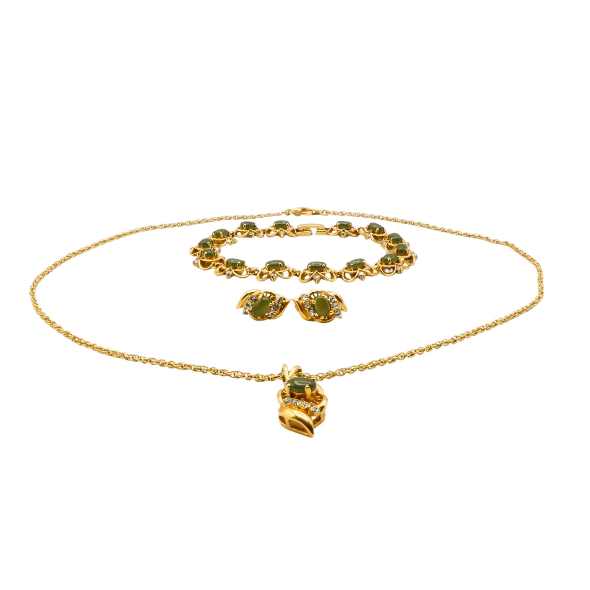 A charming vintage gold plated jewelry set featuring jade-green oval glass stones accented with sparkling clear rhinestones in an elegant floral-inspired design.