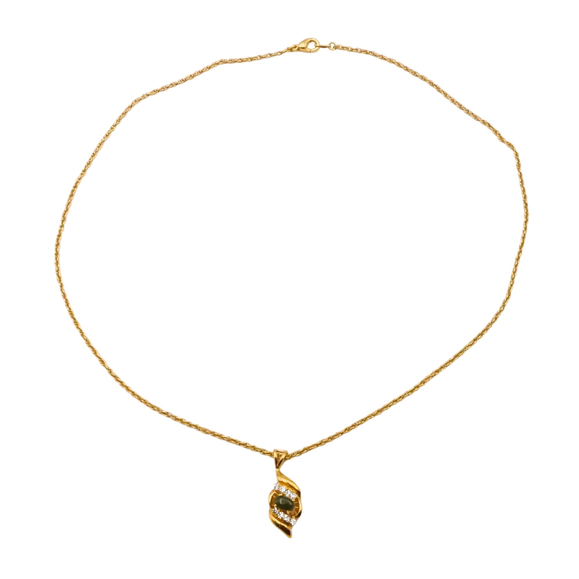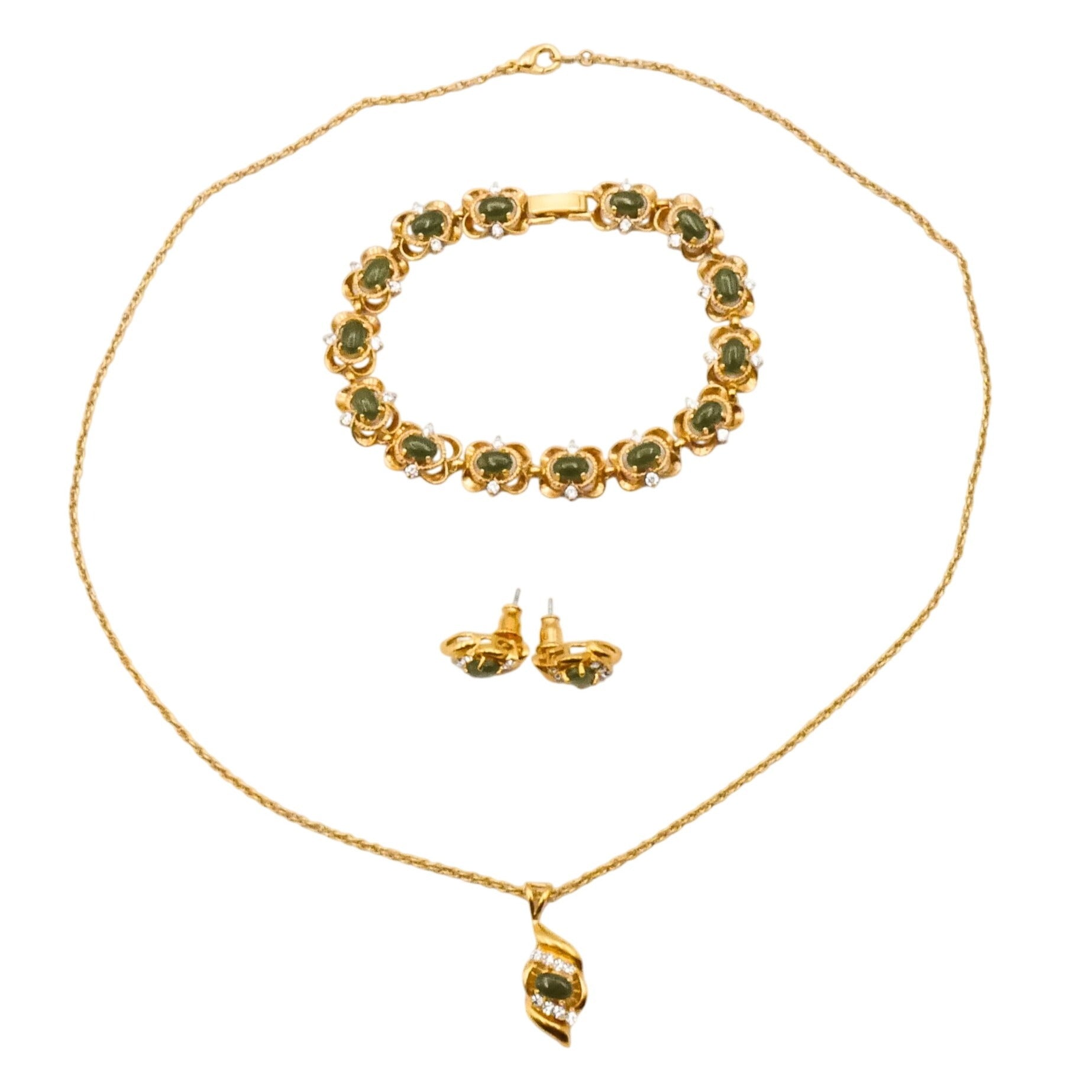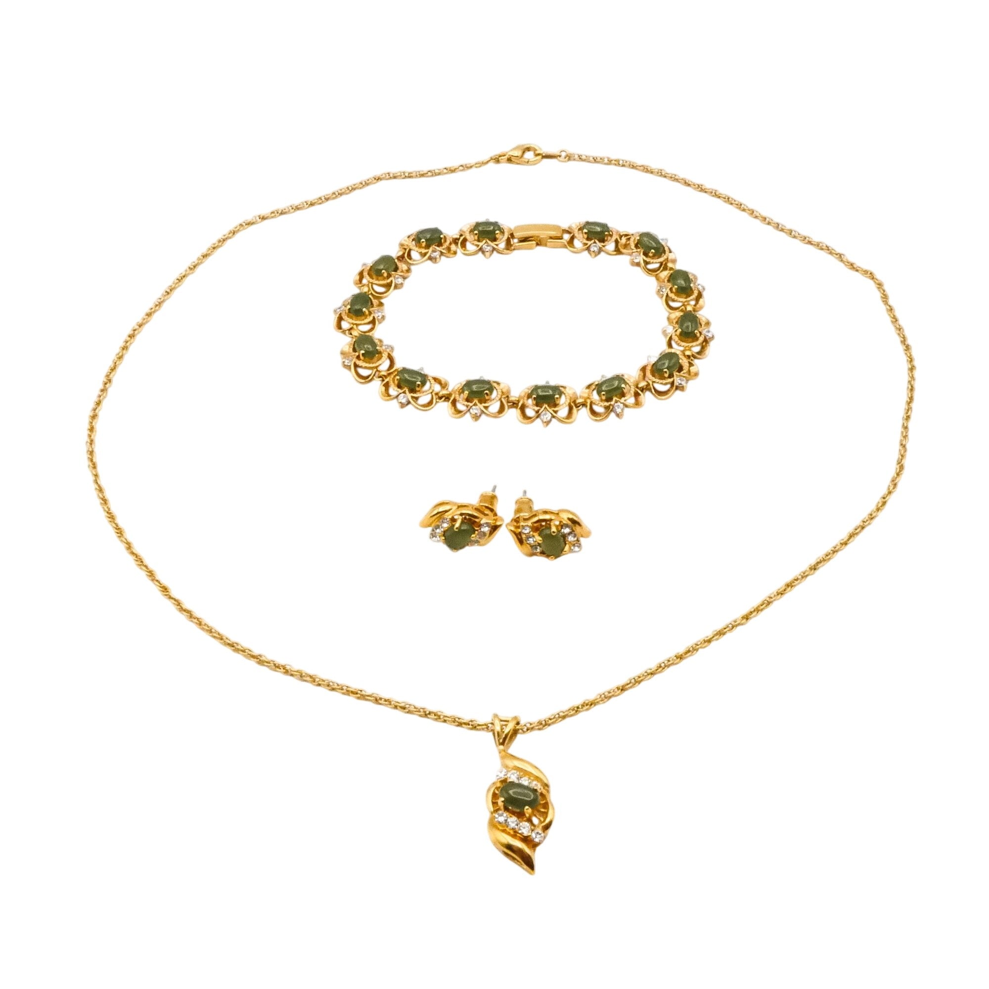 A charming vintage gold plated jewelry set featuring jade-green oval glass stones accented with sparkling clear rhinestones in an elegant floral-inspired design.