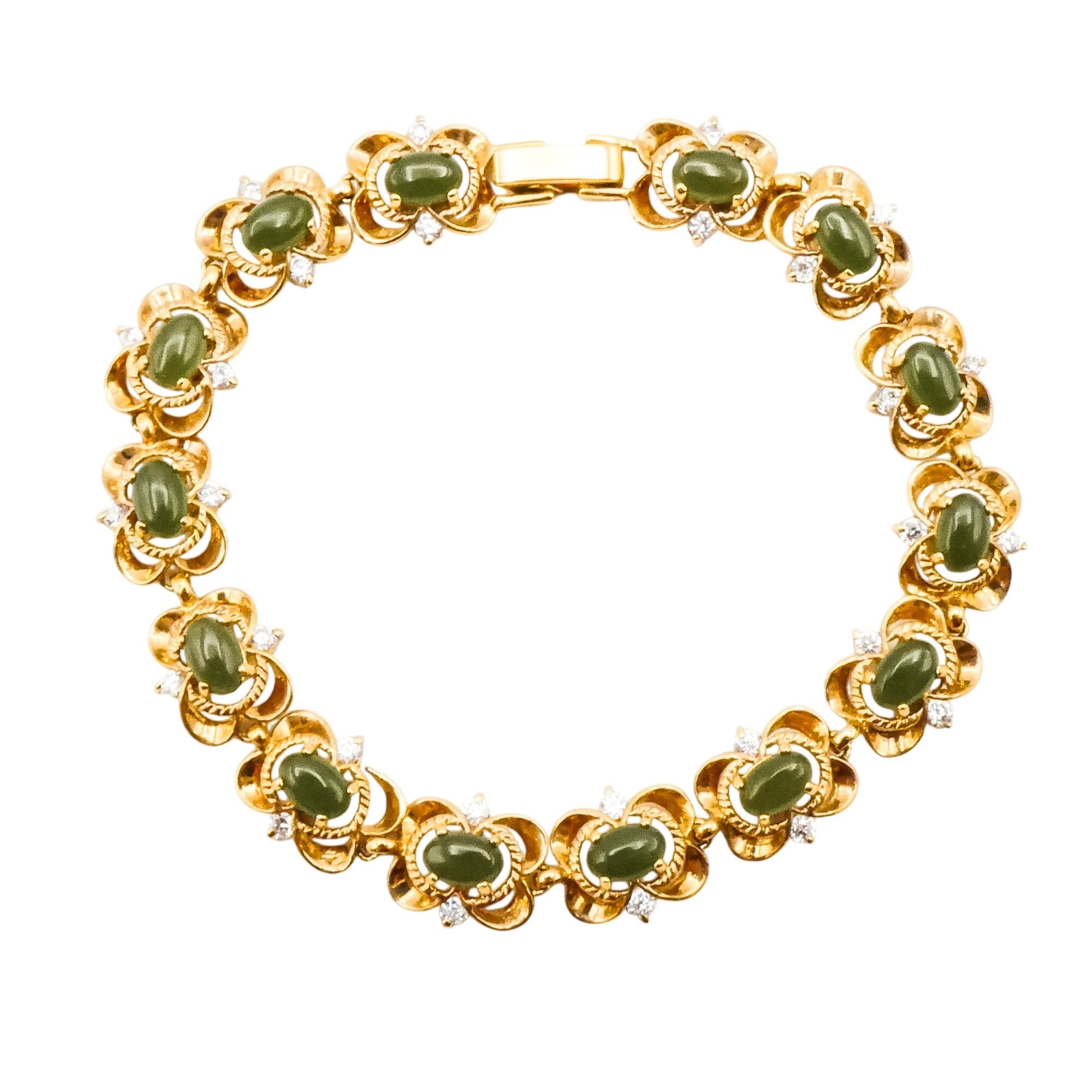 The bracelet is composed of 14 articulated links, each designed as softly curving gold-tone petals surrounding a prong-set jade-green glass center. Clear rhinestones add subtle brilliance, creating a classic mid-century inspired aesthetic.