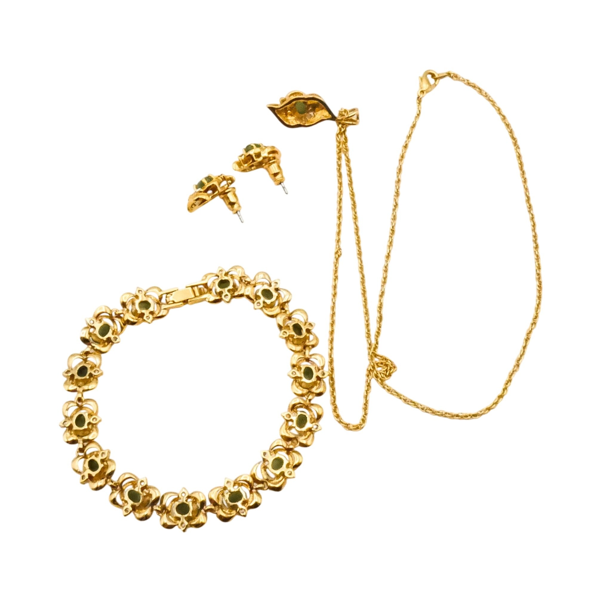A coordinated vintage statement set that captures classic elegance with warm gold tones and rich green accents.