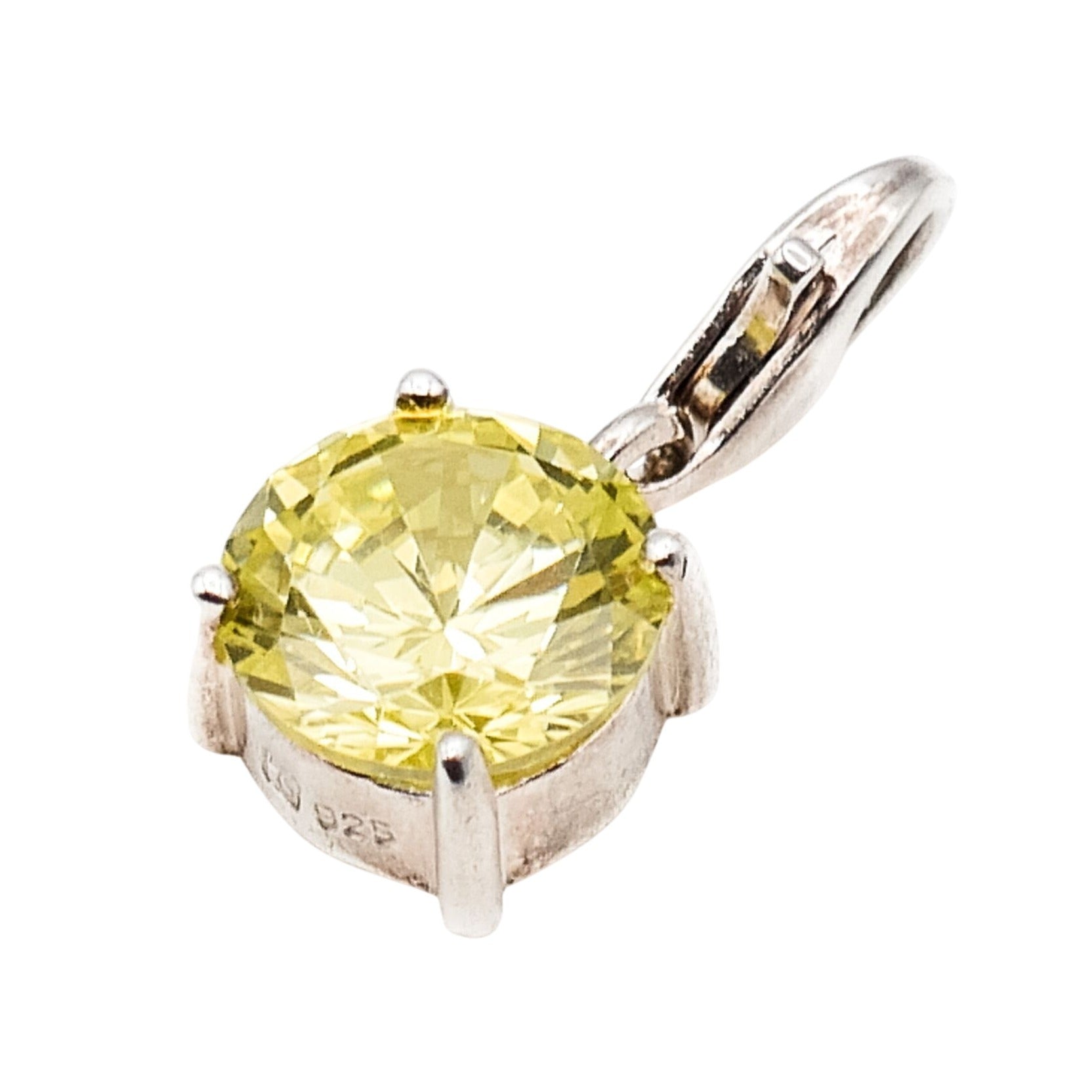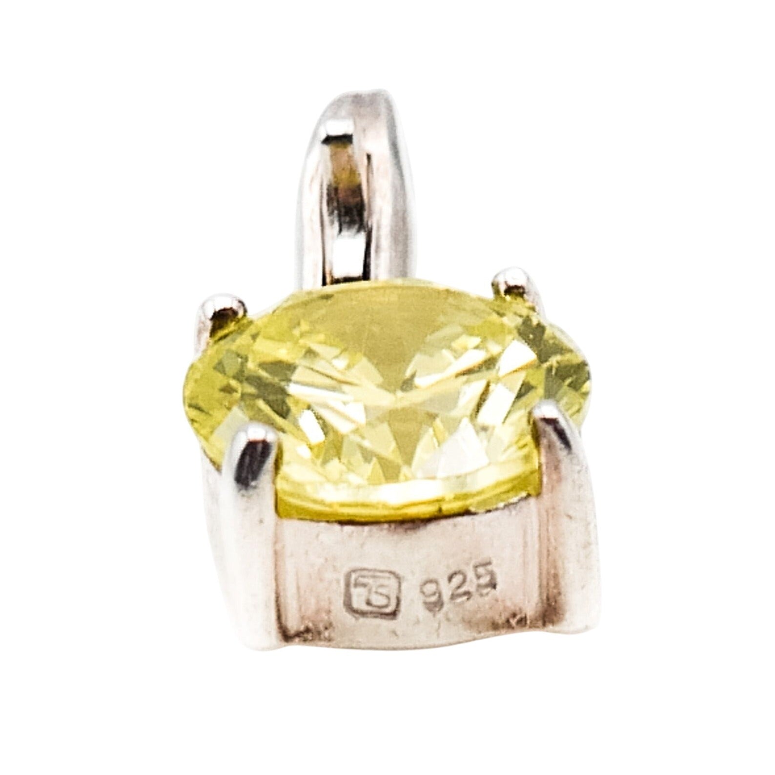 • Features a faceted round peridot-colored stone (glass/zirconia) in a bezel setting
