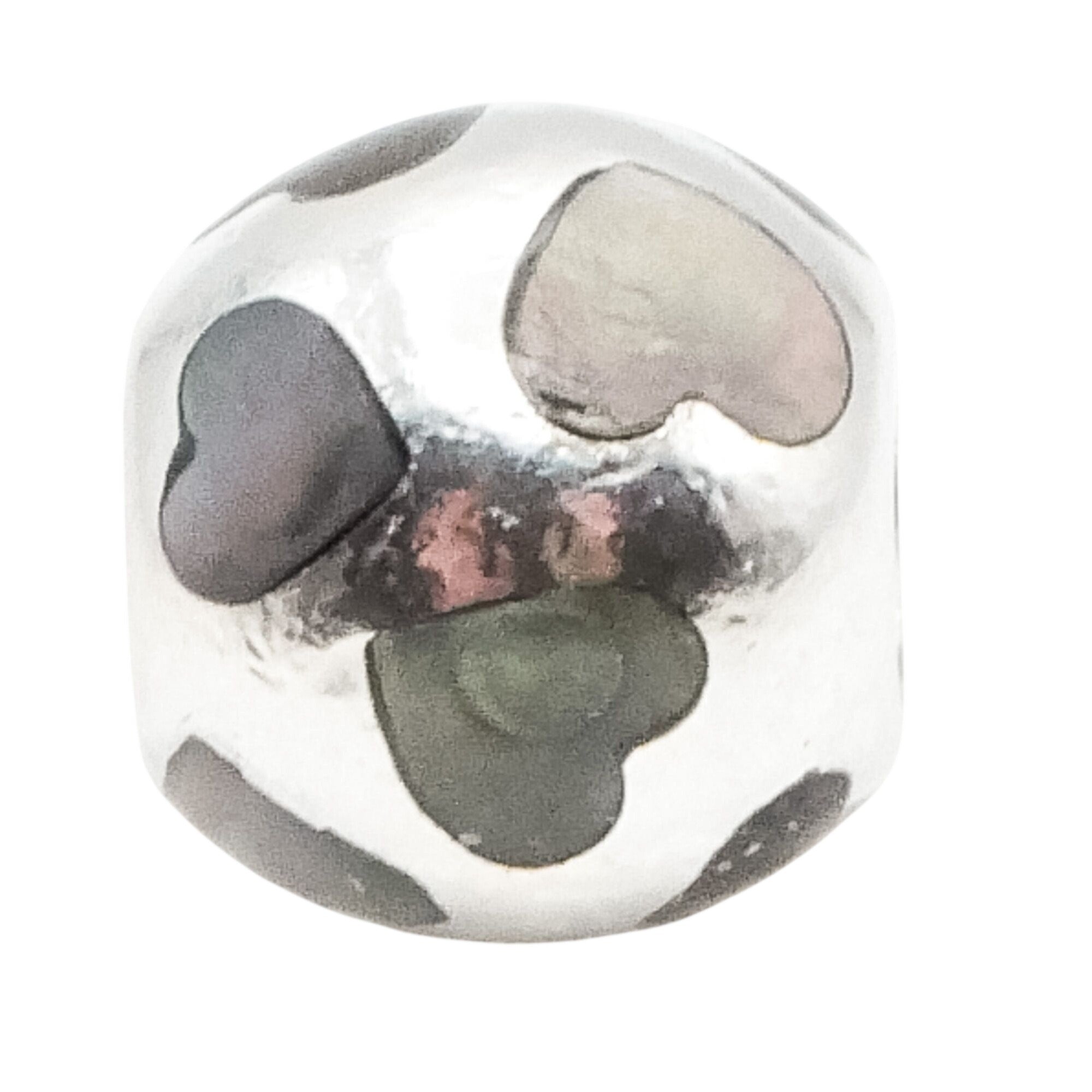 This elegant Pandora Love Me charm is crafted in sterling silver and accented with a luminous black mother of pearl inlay. The soft iridescence of the pearl contrasts beautifully with the polished silver, creating a refined and romantic design with timeless appeal.