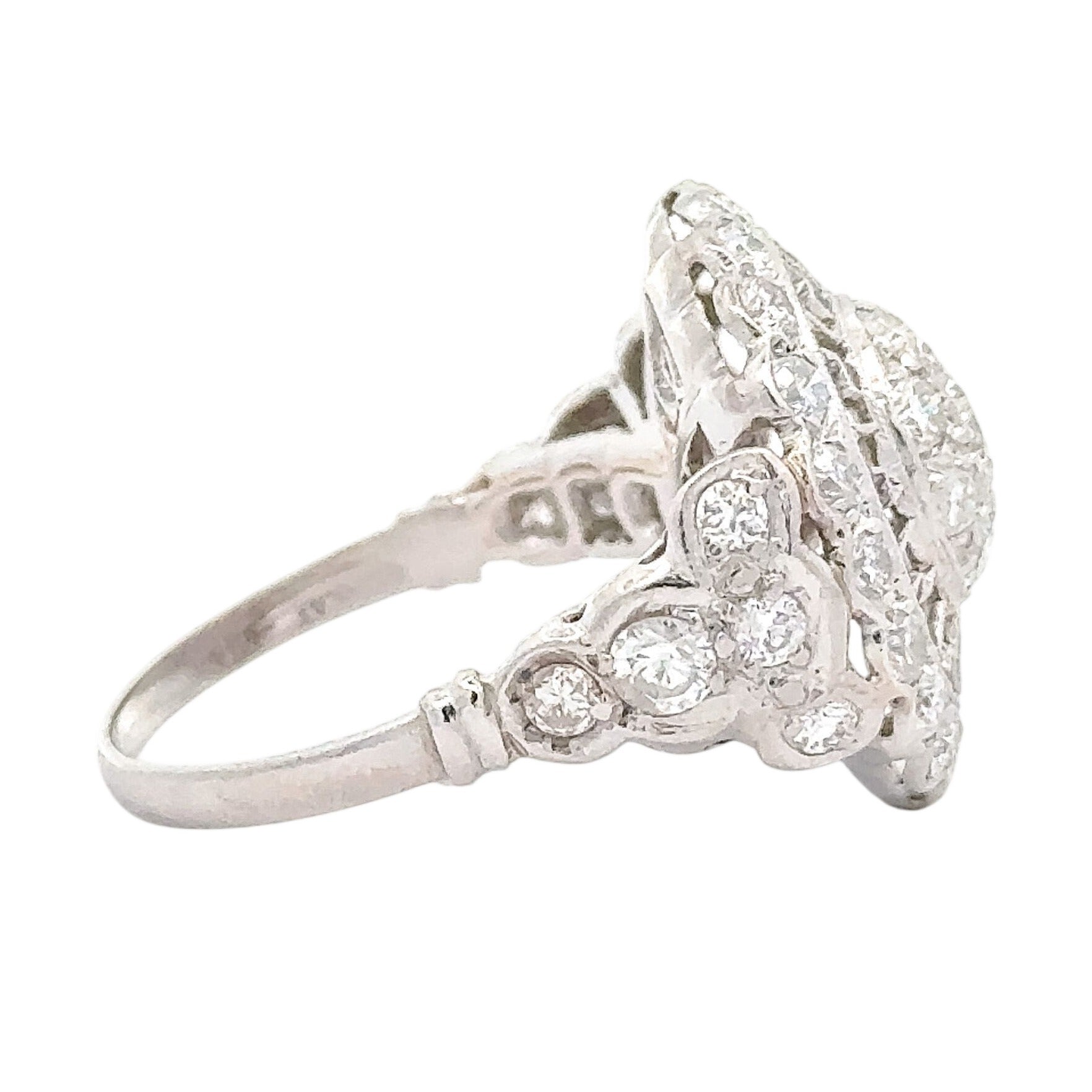 All diamonds in the ring have a clarity of SI and a color grade of G to H, with an estimated total diamond weight of 1.57 carats. The finely detailed openwork gallery and vintage filigree setting elevate this piece to a true work of art.