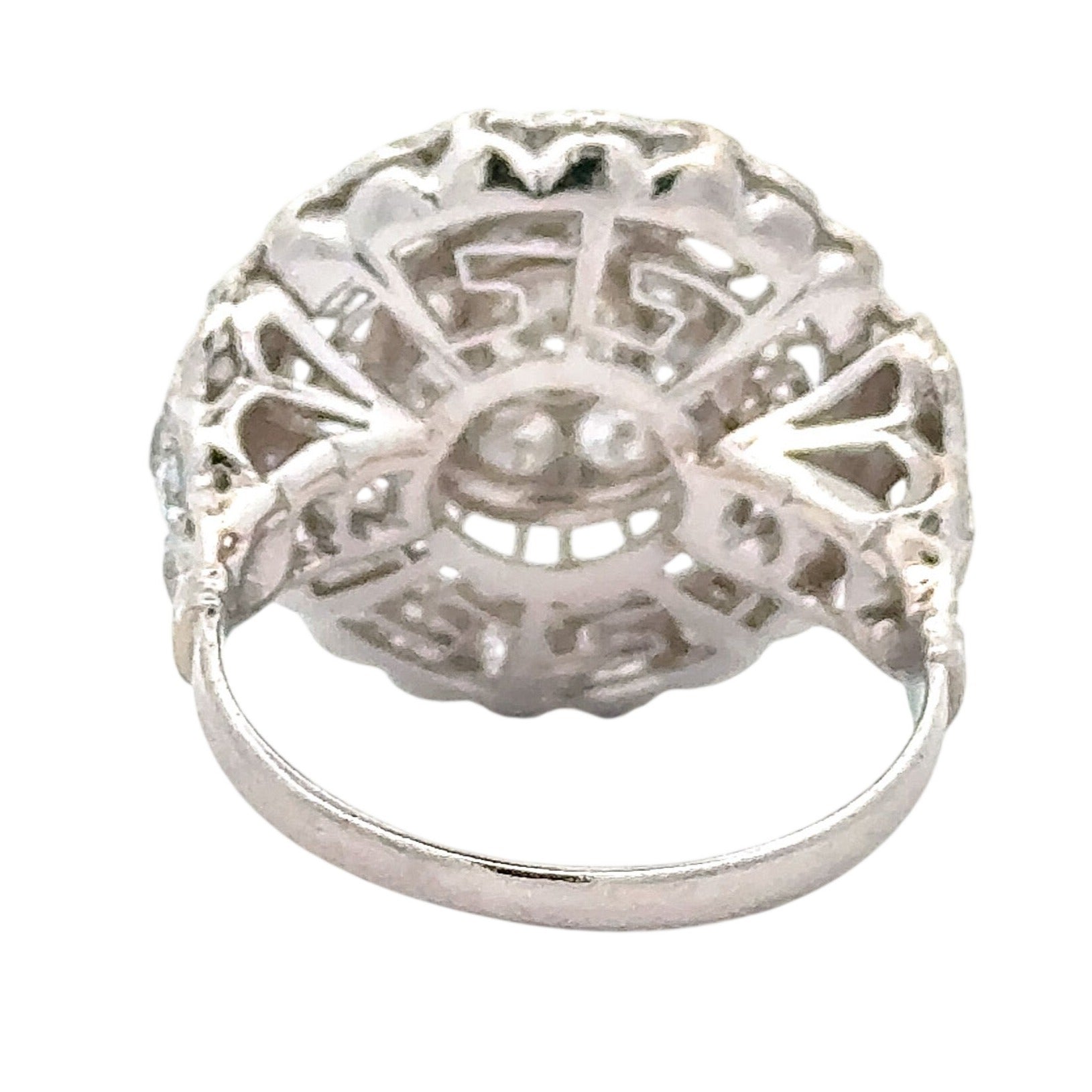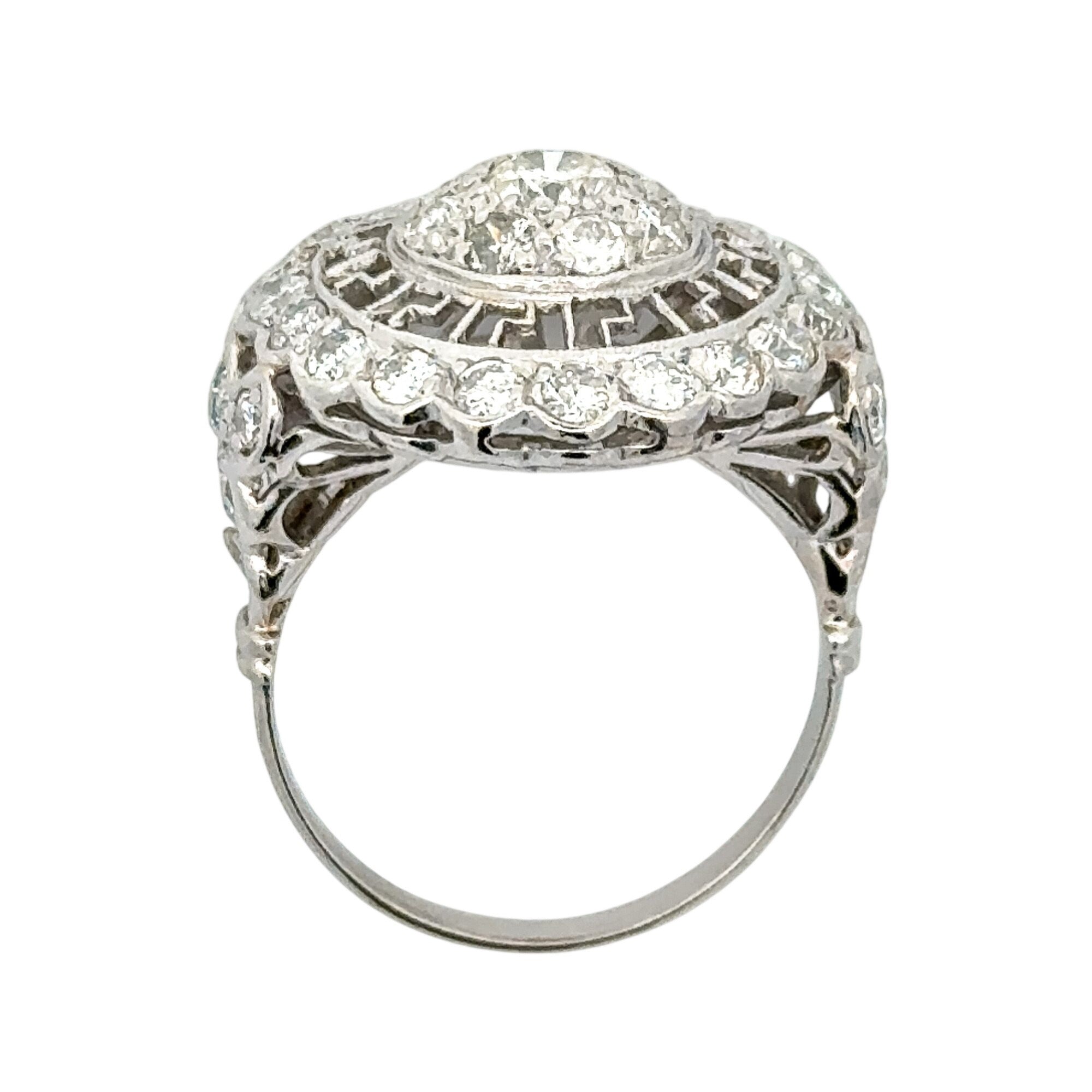 This breathtaking vintage Art Deco engagement ring is a timeless masterpiece of fine craftsmanship and elegant design. Crafted in 18K white gold and weighing 7.2 grams, the ring showcases a stunning geometric Greek Key motif framing a dazzling diamond cluster.