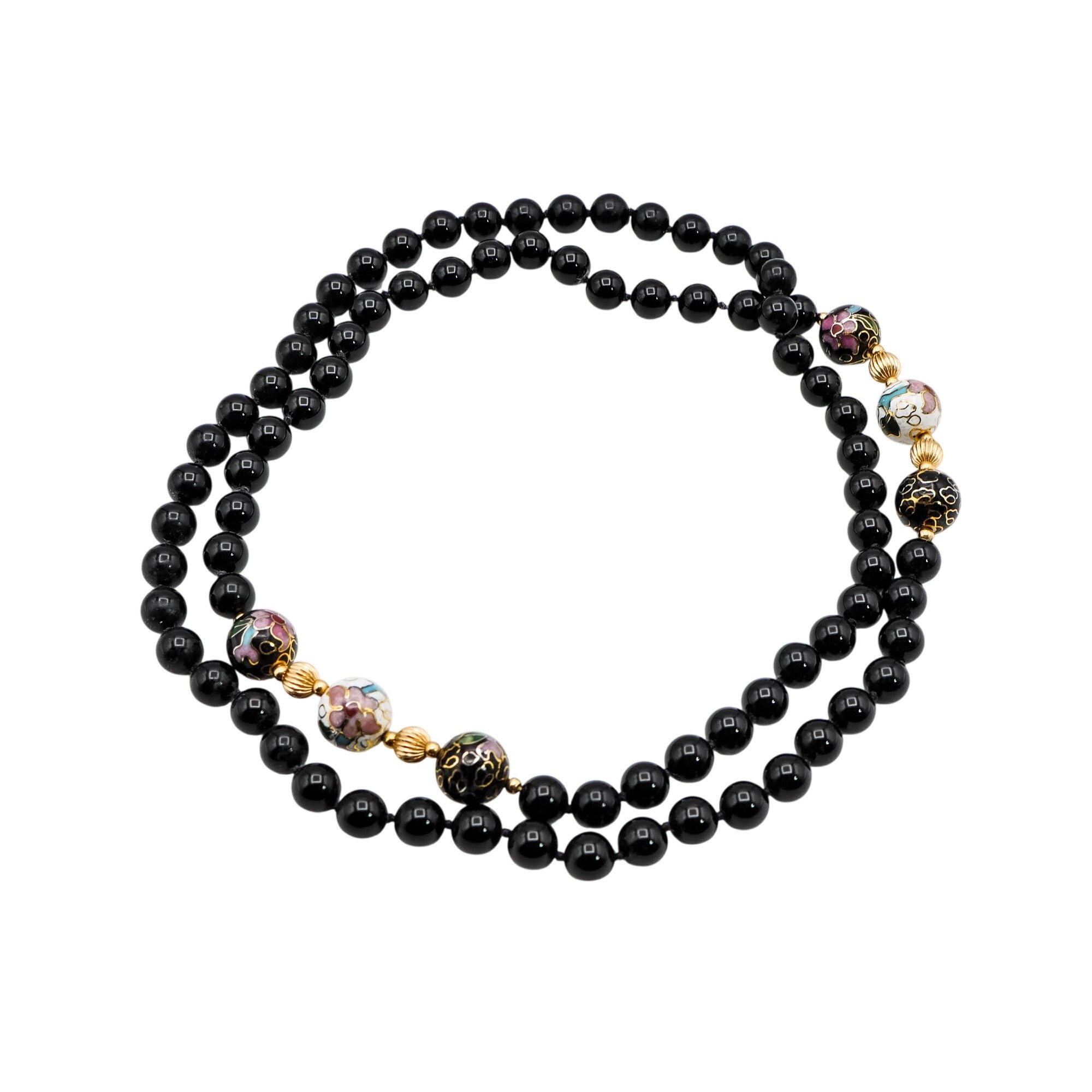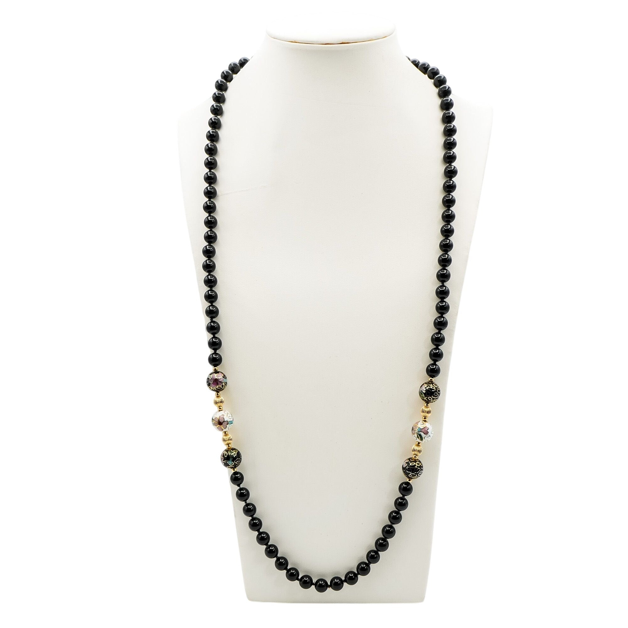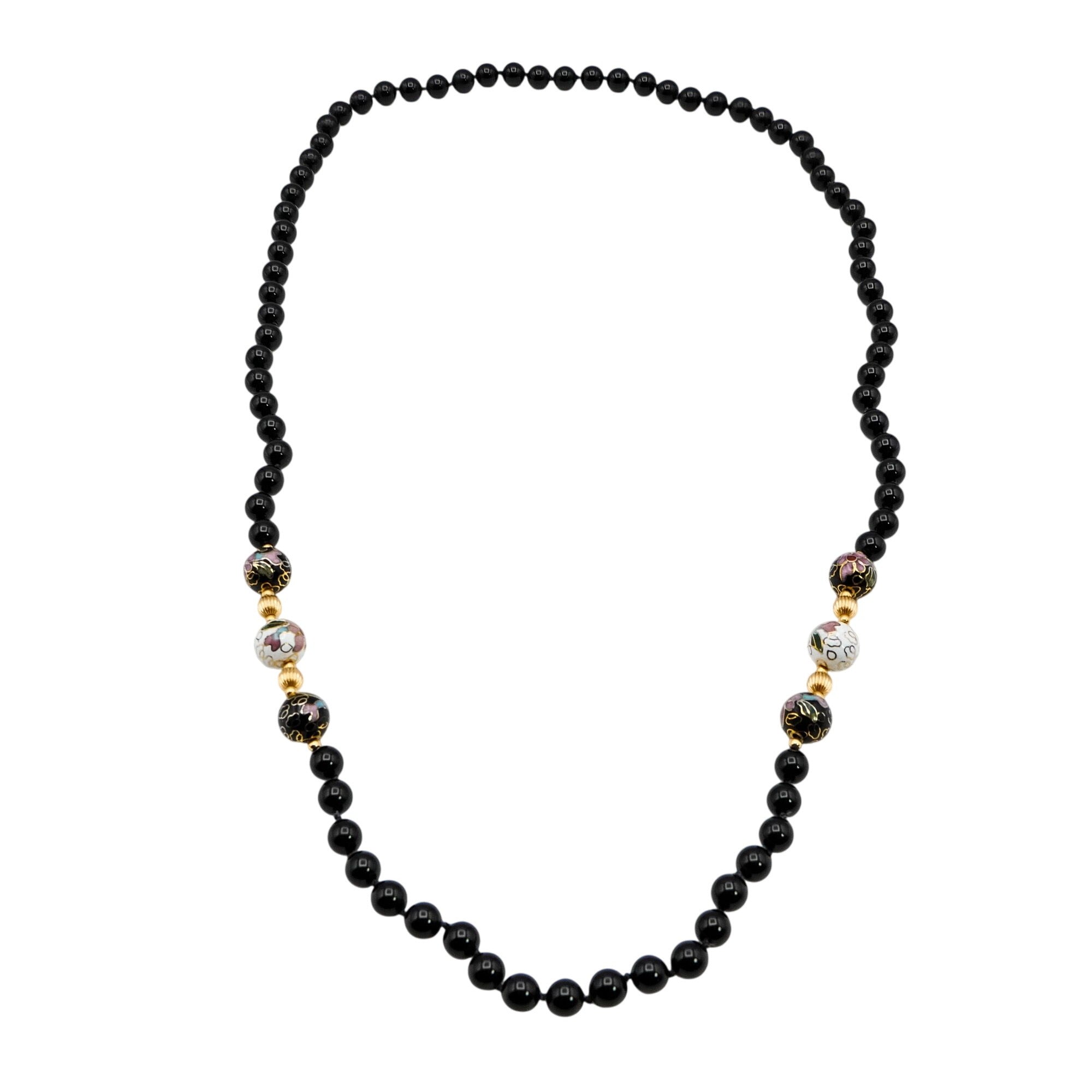 Elevate your jewelry collection with this elegant 31-inch necklace, thoughtfully hand-knotted with polished black onyx beads, ornate cloisonné enamel beads, and delicate 12K yellow gold accents. Designed without a clasp, this strand slips over the head with ease and grace.
