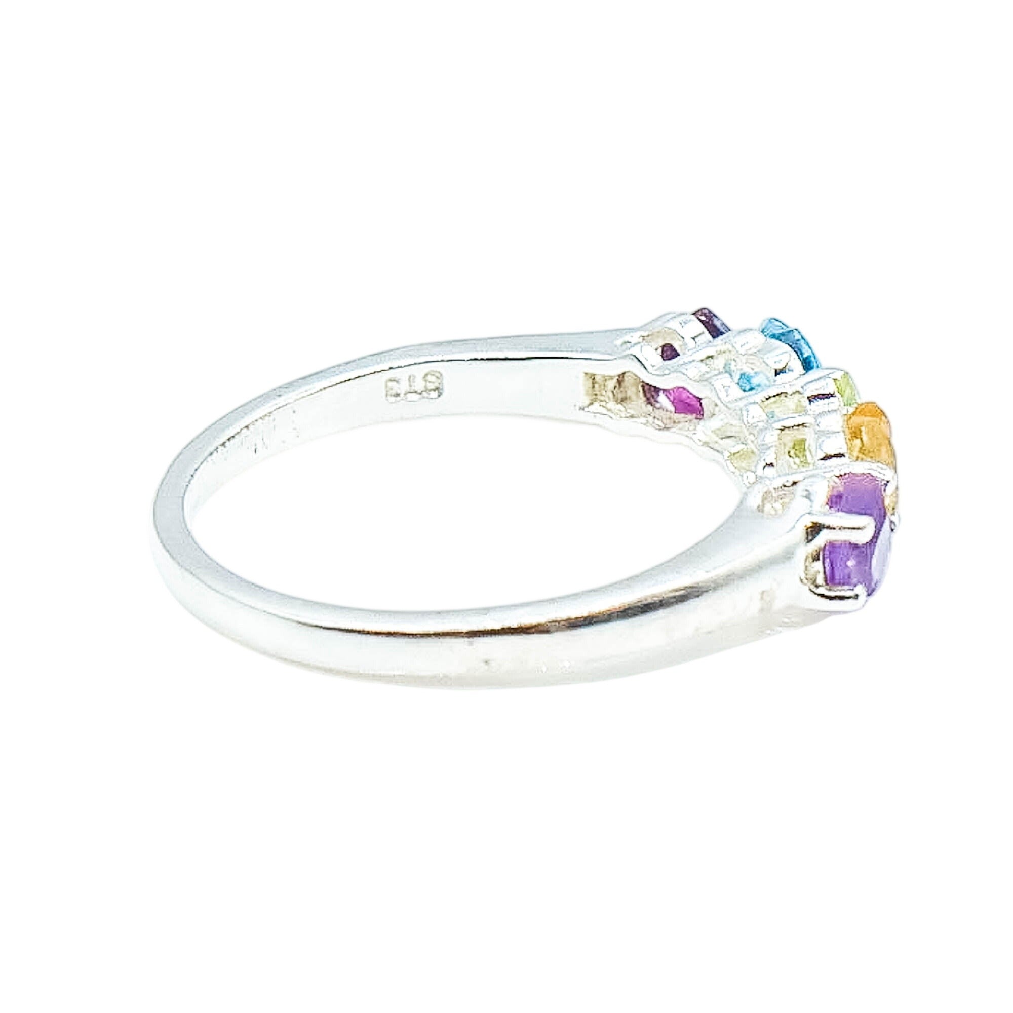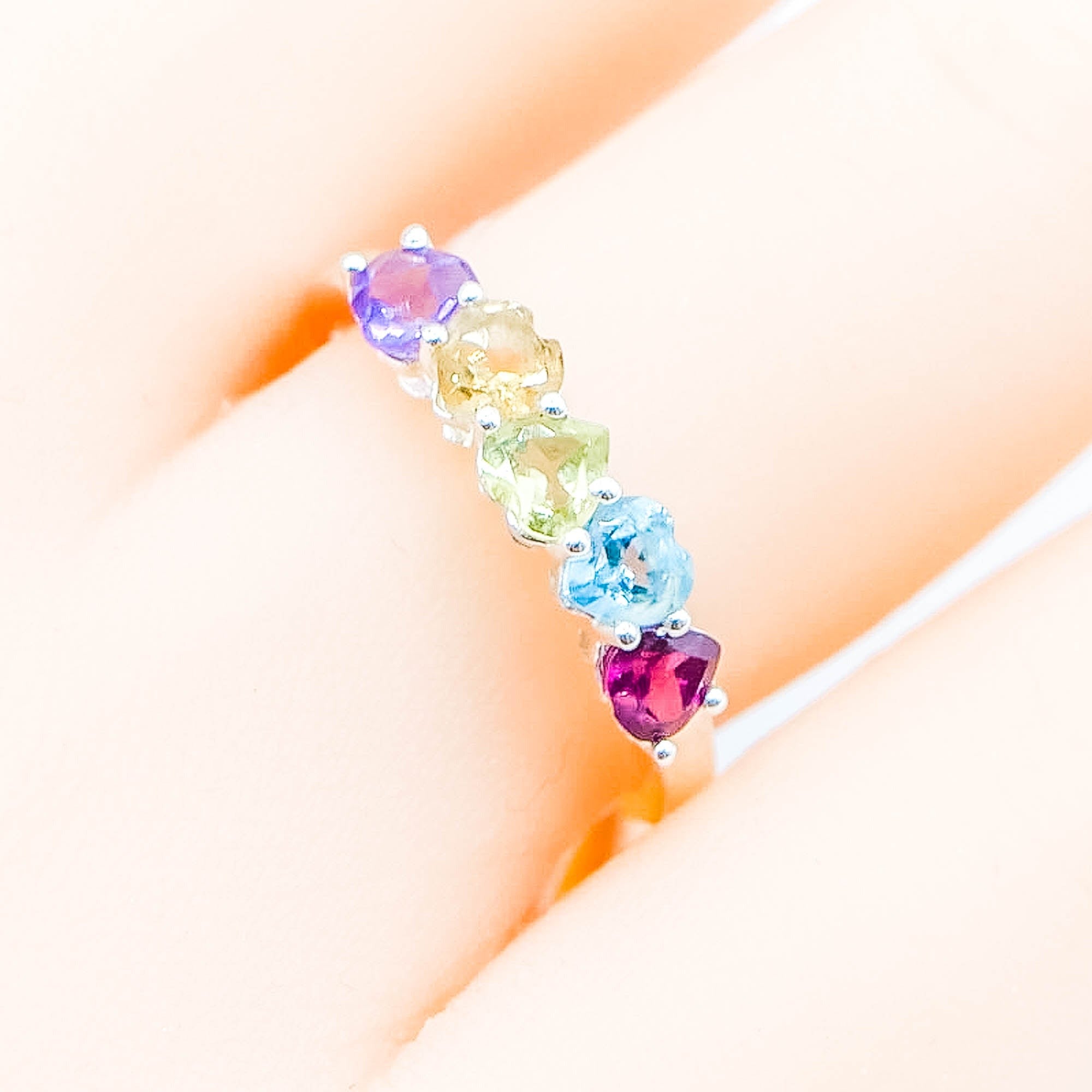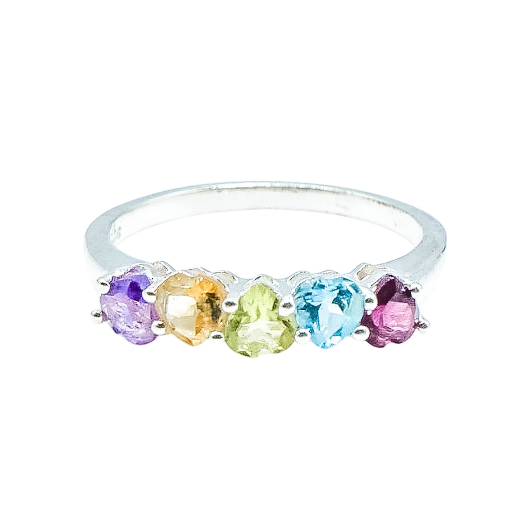 Color your world with this charming Sterling Silver Multi-Gemstone Ring featuring five heart-shaped natural gemstones in a stunning rainbow palette. Each stone represents a different energy and personality, making this ring the perfect expression of love, joy, and balance.