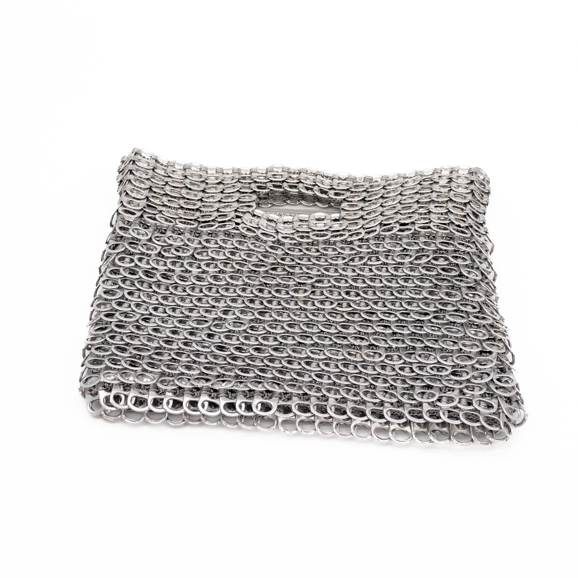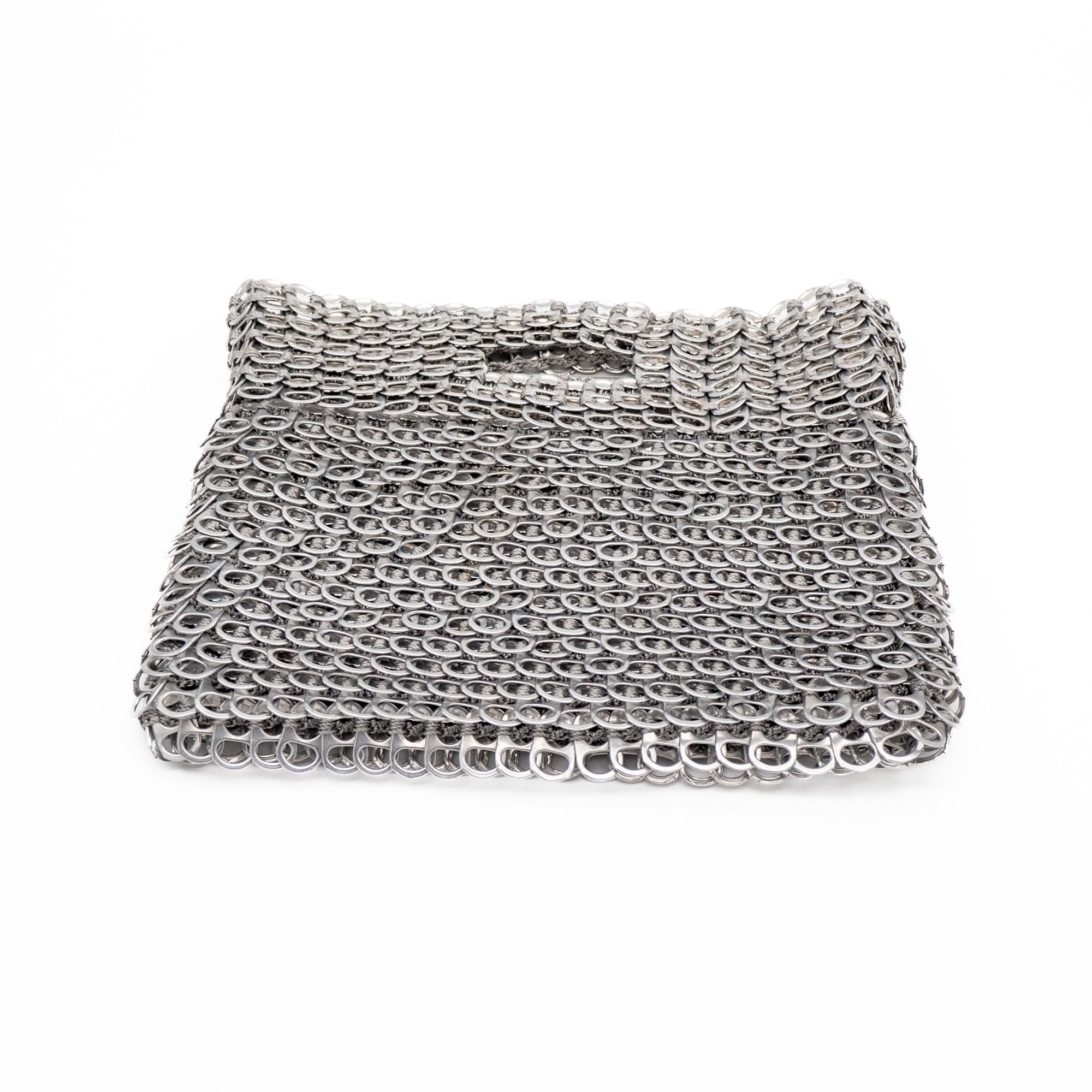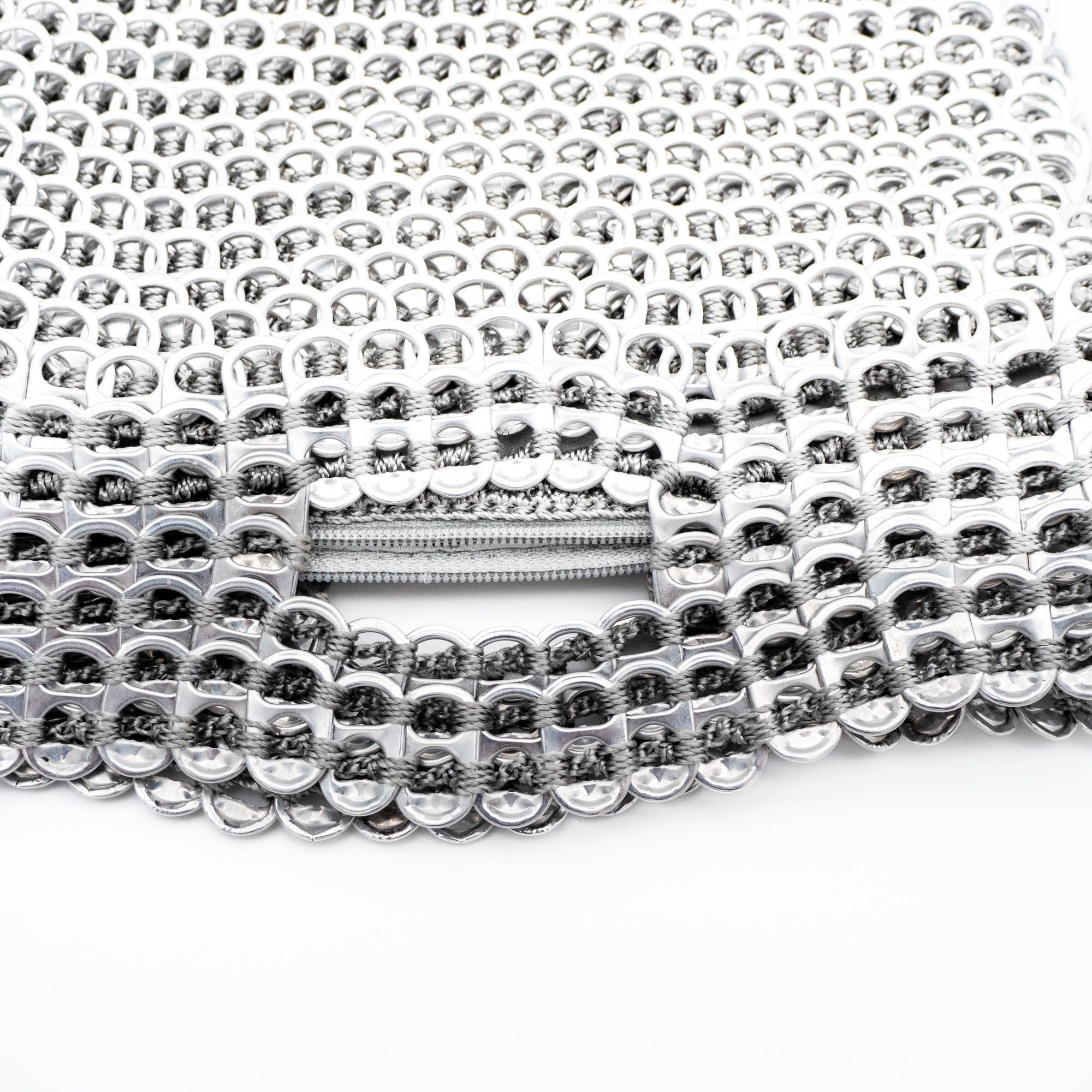 This clutch bag by Escama Studio is crafted from recycled pop-tops, offering a blend of sustainability and style. Its unique design and silver tone provide a modern aesthetic, making it suitable for those who value eco-friendly fashion. The bag includes a zippered interior pocket for practical storage.