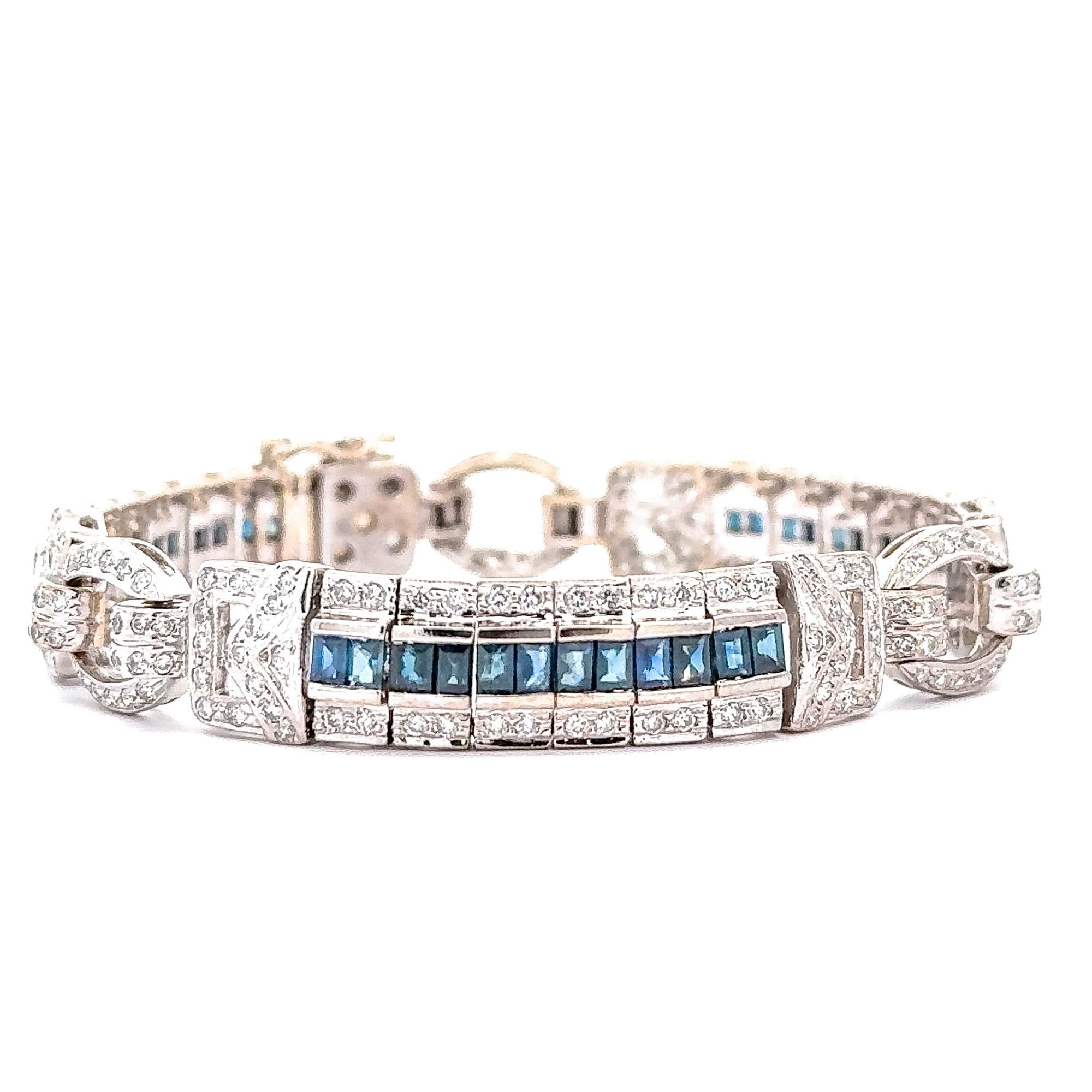 Exquisite and elegant, this 18K White Gold Diamond and Sapphire Tennis Bracelet is a showstopping piece of fine estate jewelry. Weighing a substantial 42 grams and measuring 7.5 inches long by 11mm wide, this statement bracelet features a seamless blend of rich blue sapphires and dazzling white diamonds in a timeless design.