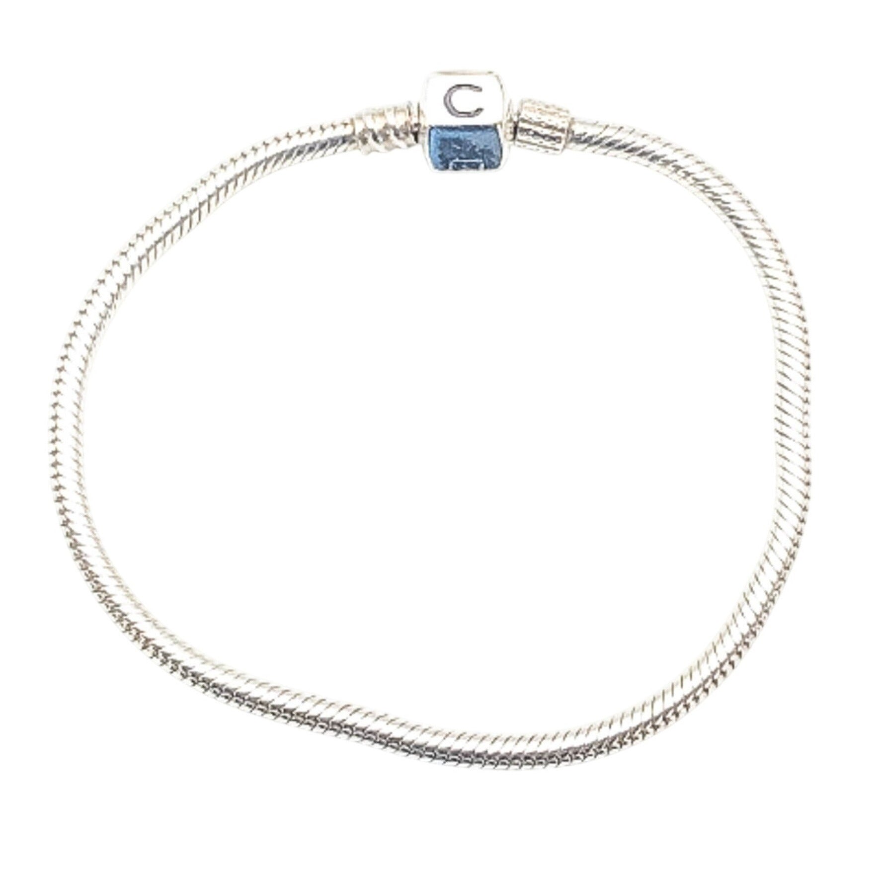 Authentic 7.5-Inch CHAMILIA Sterling Silver Snake Chain Bracelet With Chamilia Logo Snap Clasp. Simple and classic in design, the classic Sterling Silver bracelet from Chamilia offers a modern look. Compatible with Pandora and other European brands.
