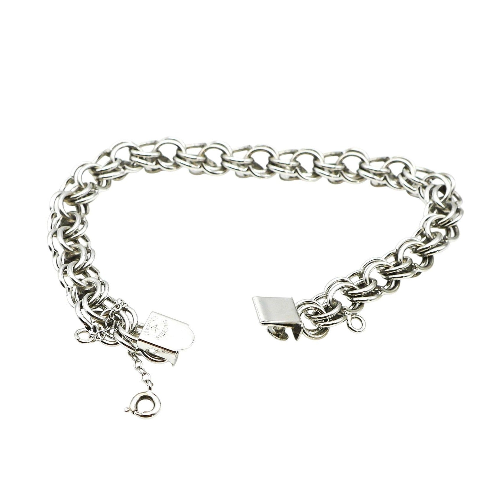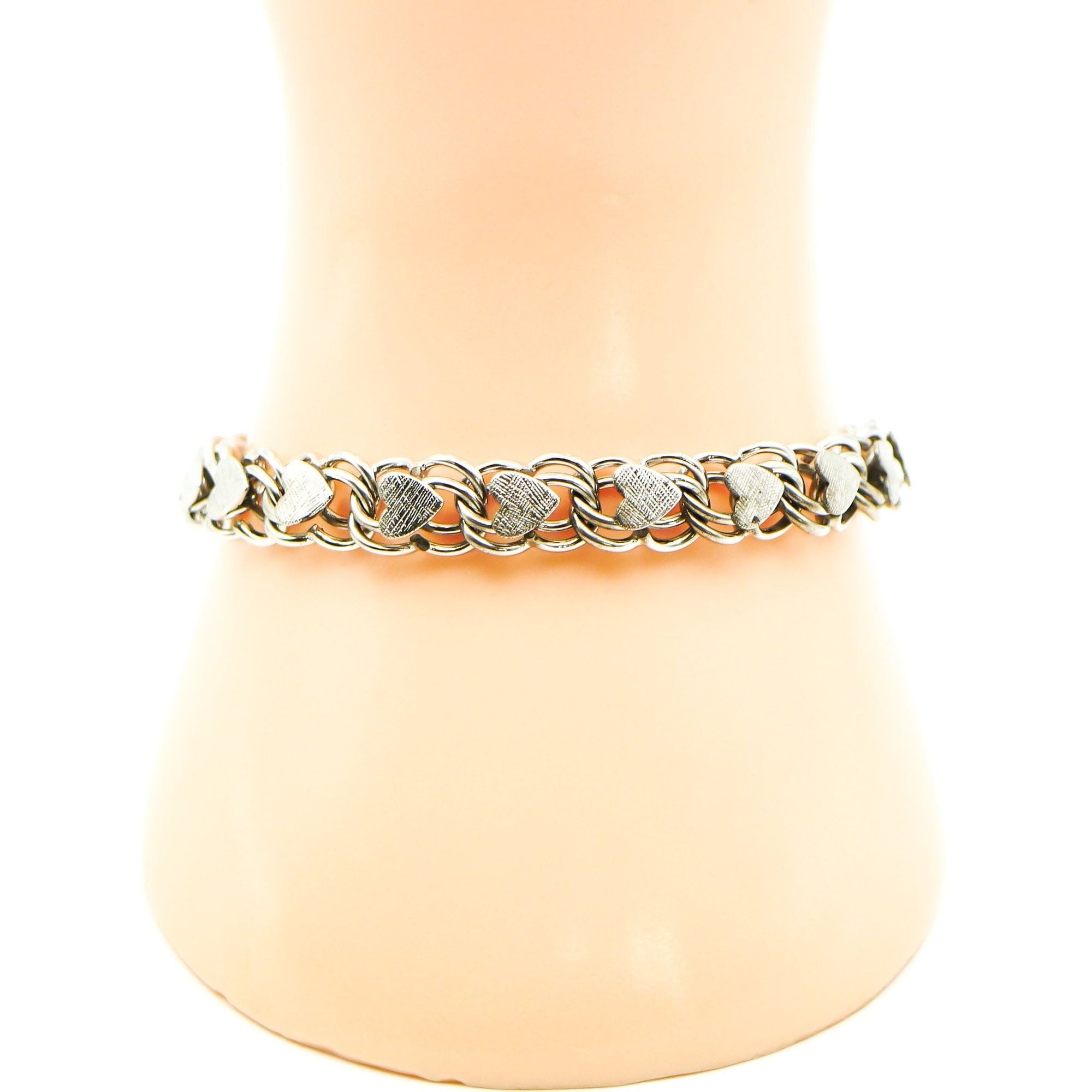 This vintage bracelet showcases a delicate double-link design adorned with charming heart-shaped accents. Crafted from sterling silver, it offers an elegant and timeless appeal. Measuring 7.5 inches, it includes a safety chain for added security, making it a practical yet sophisticated accessory for daily wear or special occasions.