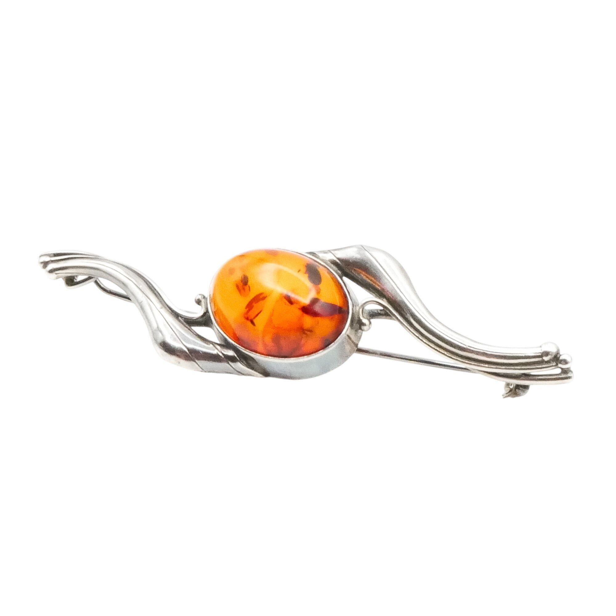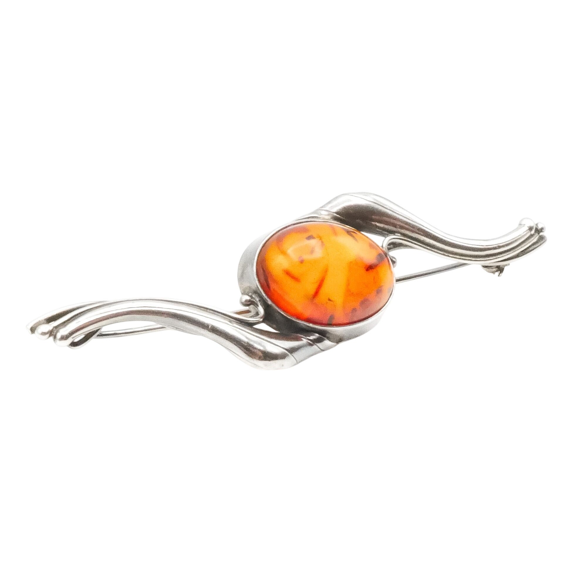 An elegant vintage sterling silver brooch featuring a glowing oval amber cabochon framed by graceful, sculptural silver curves.