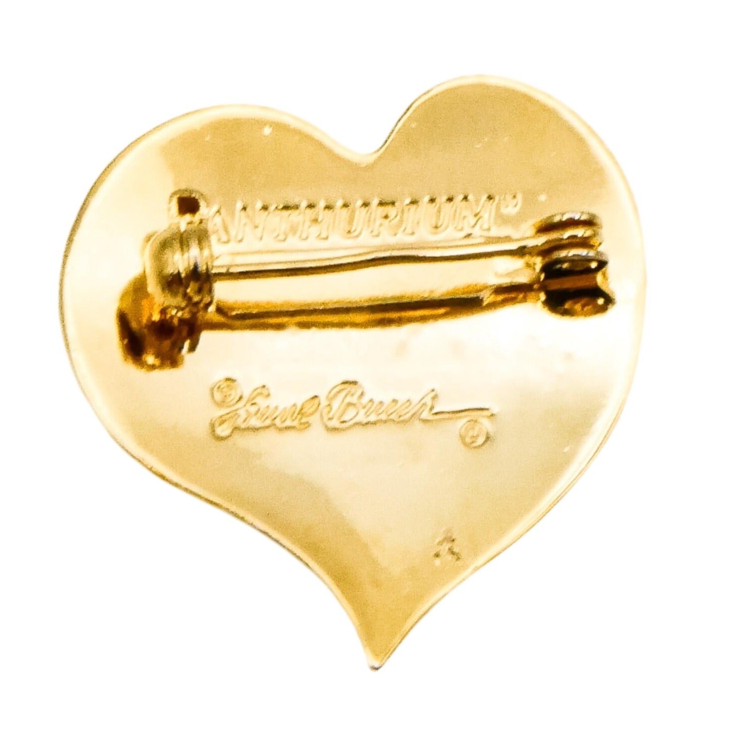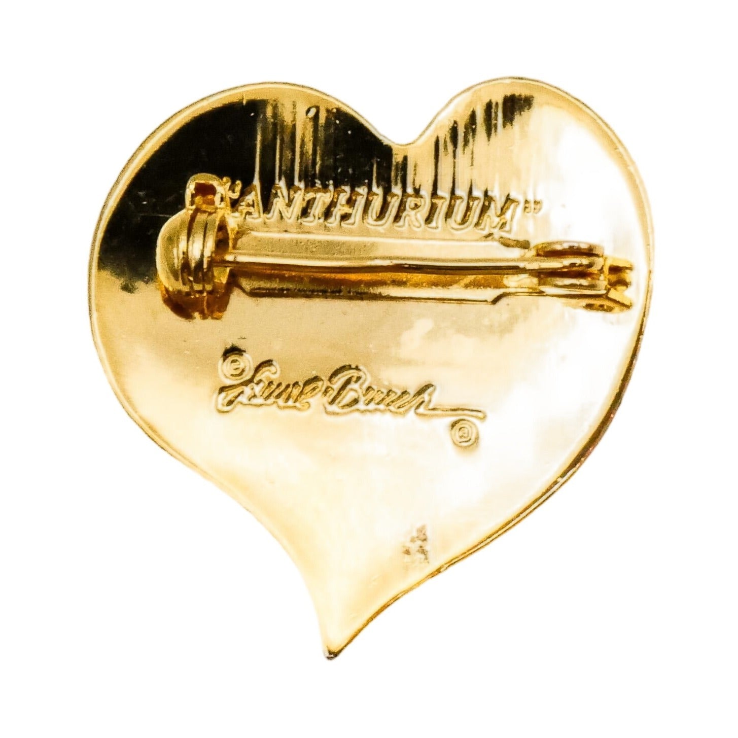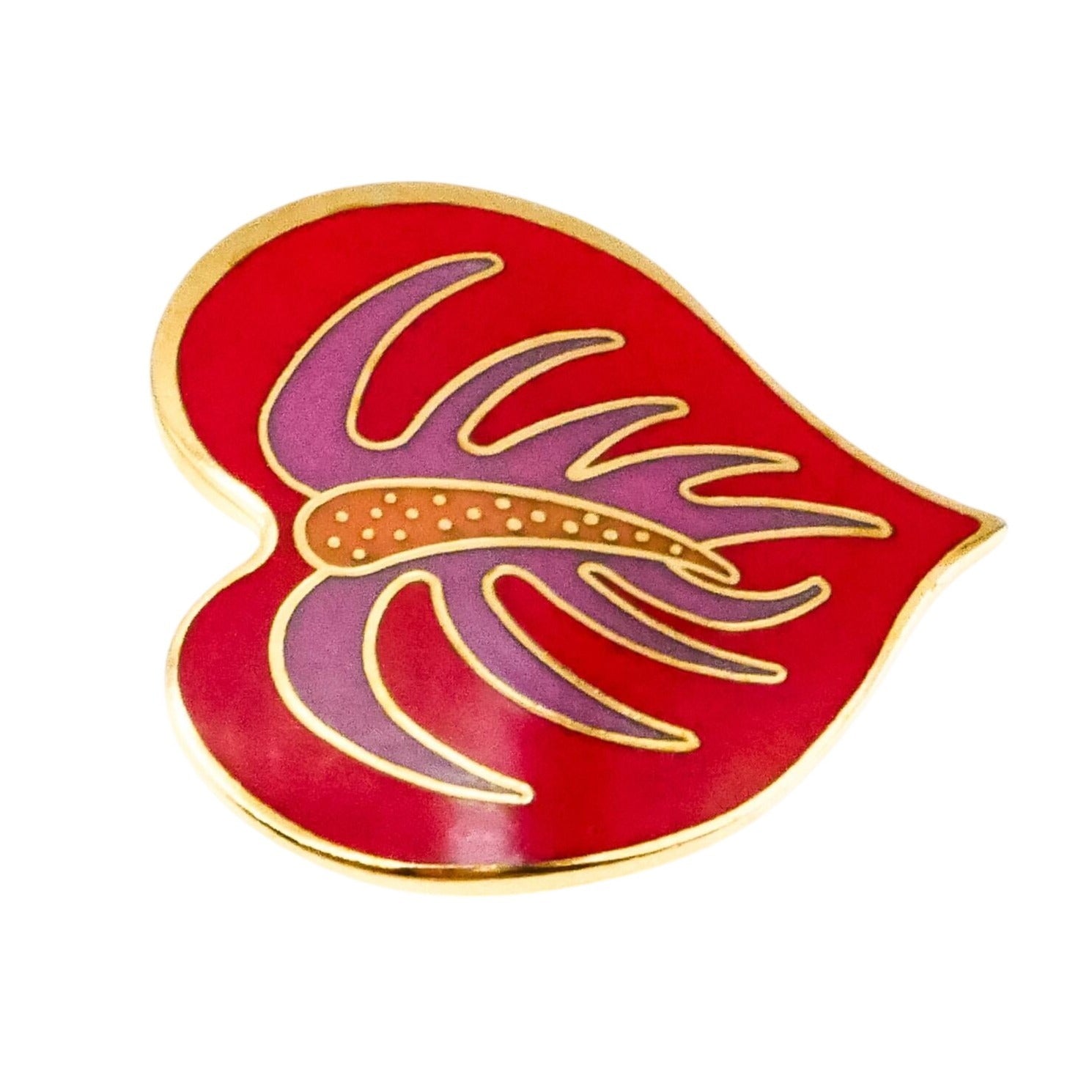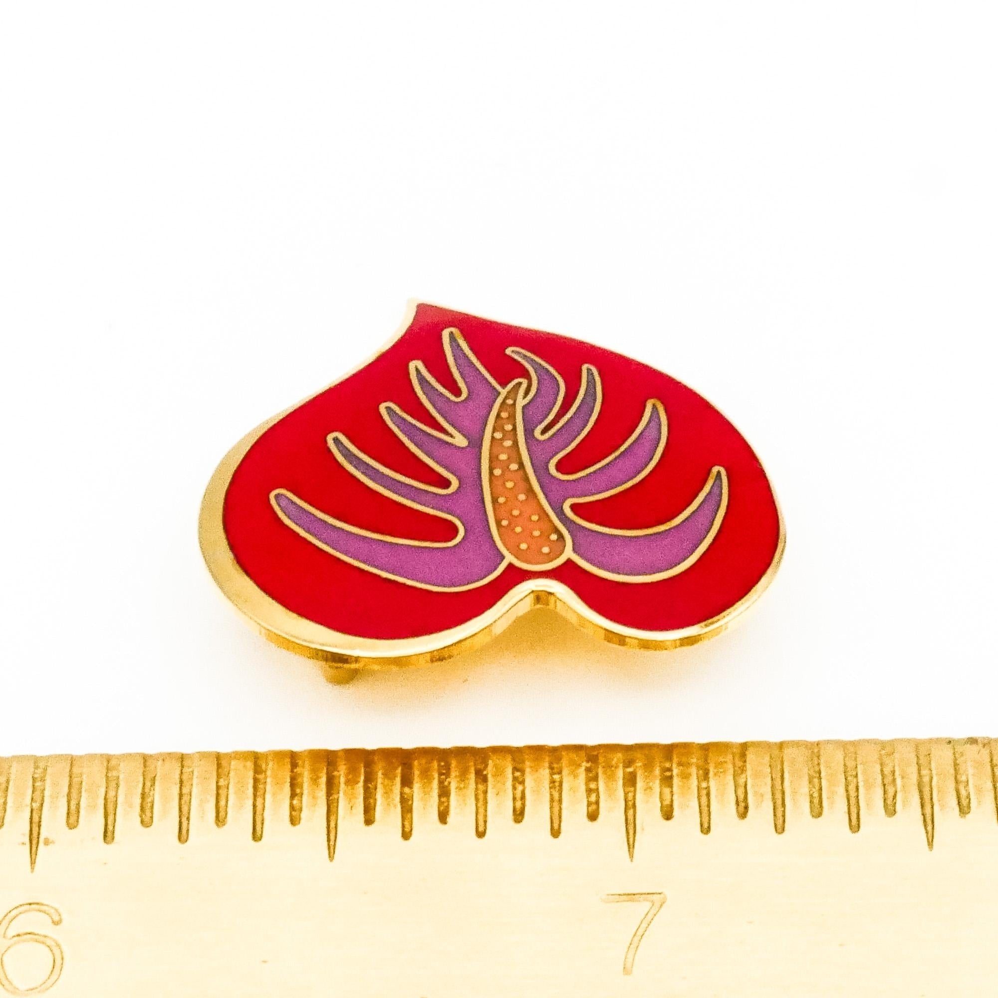 This beautiful vintage 1980s Laurel Burch “Anthurium Flower” heart brooch showcases her signature use of bold color and symbolic design. Crafted in gold-plated metal, the heart-shaped brooch features a striking cloisonné enamel pattern in rich shades of red and purple, accented with warm gold tones.