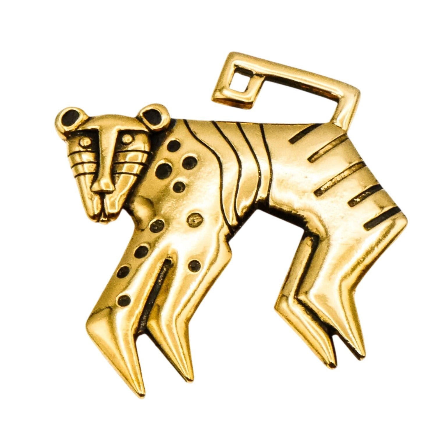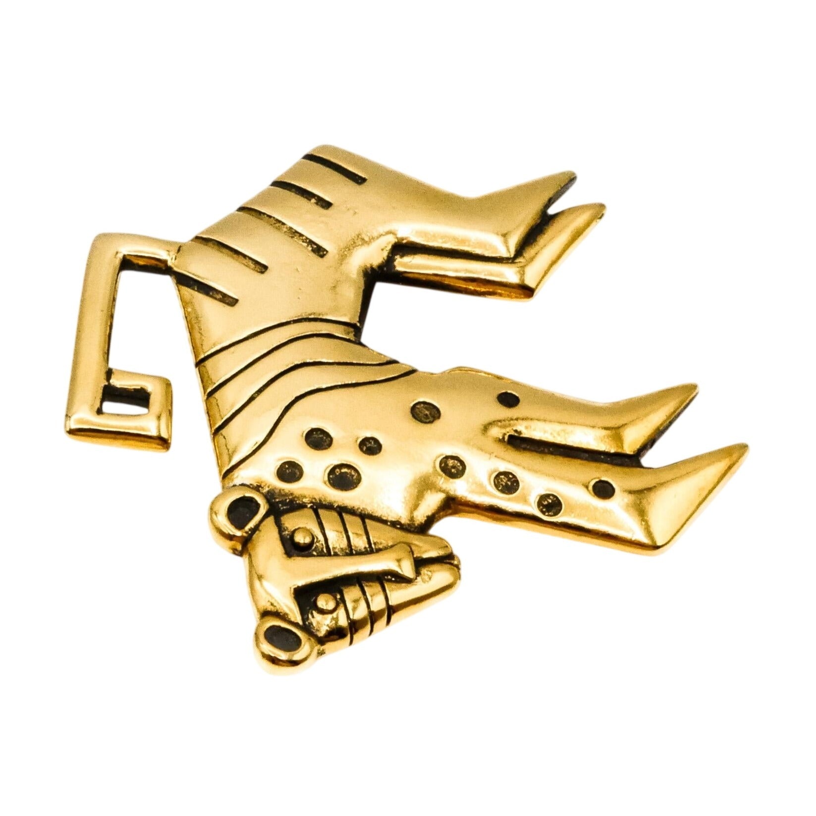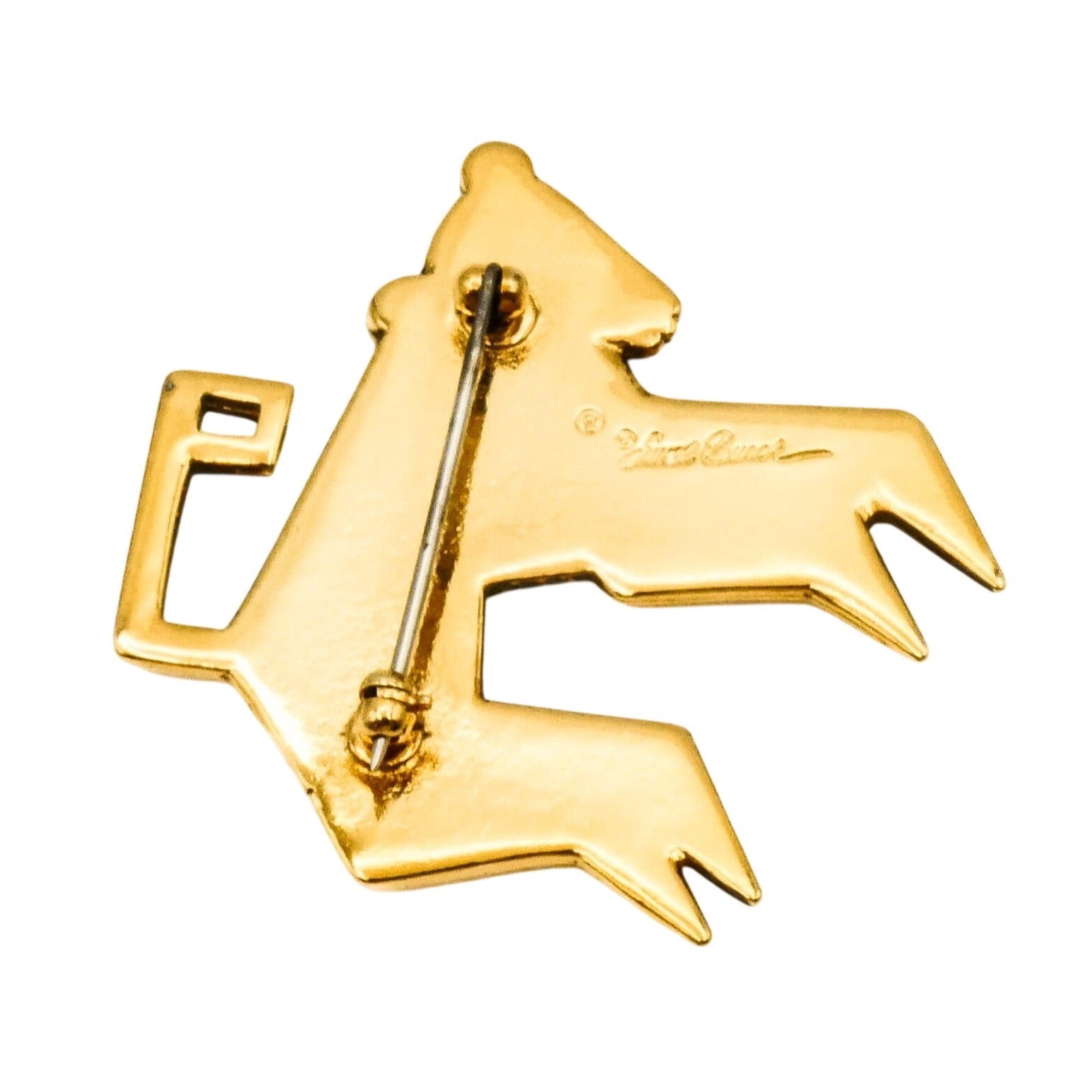 This vintage rare 1980s Laurel Burch Mythical Monkey brooch is a whimsical and collectible example of Laurel Burch’s playful animal symbolism. Crafted in gold-plated metal, the brooch features a standing monkey gazing outward, with a distinctive tail ending in a square, adding a touch of surreal charm.