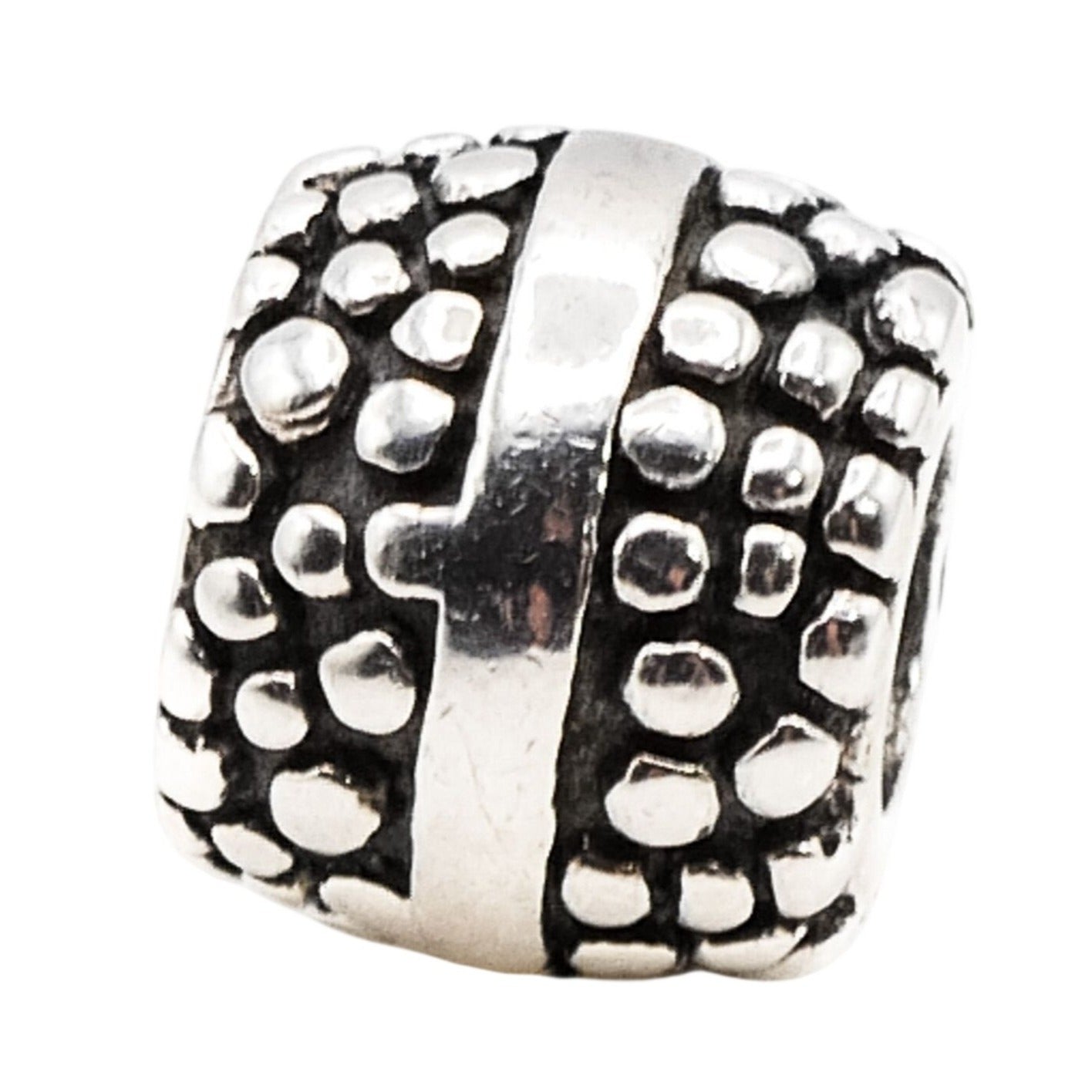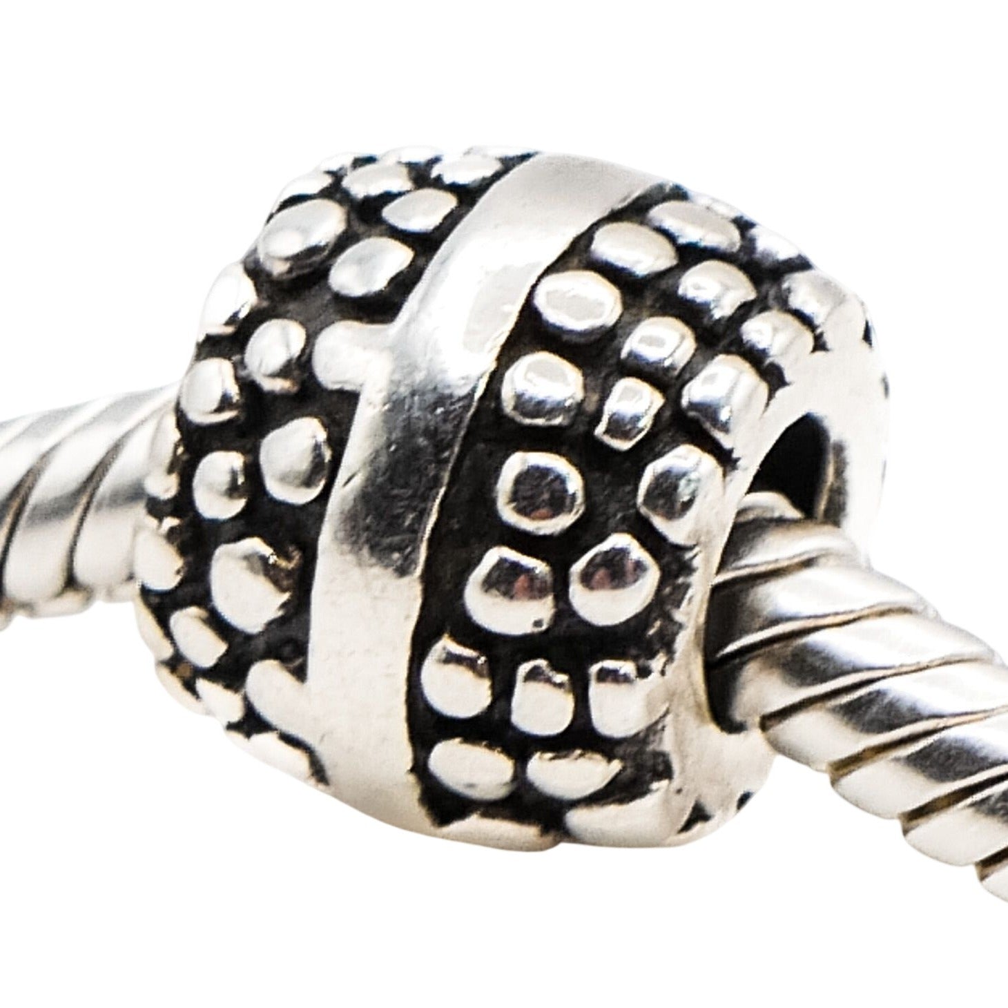 This authentic Chamilia Dots and Lines charm is crafted in sterling silver and features a clean, modern pattern that adds texture and dimension to any charm bracelet. The minimalist dot-and-line design makes it an ideal spacer or accent charm, blending effortlessly with both decorative and sentimental pieces.