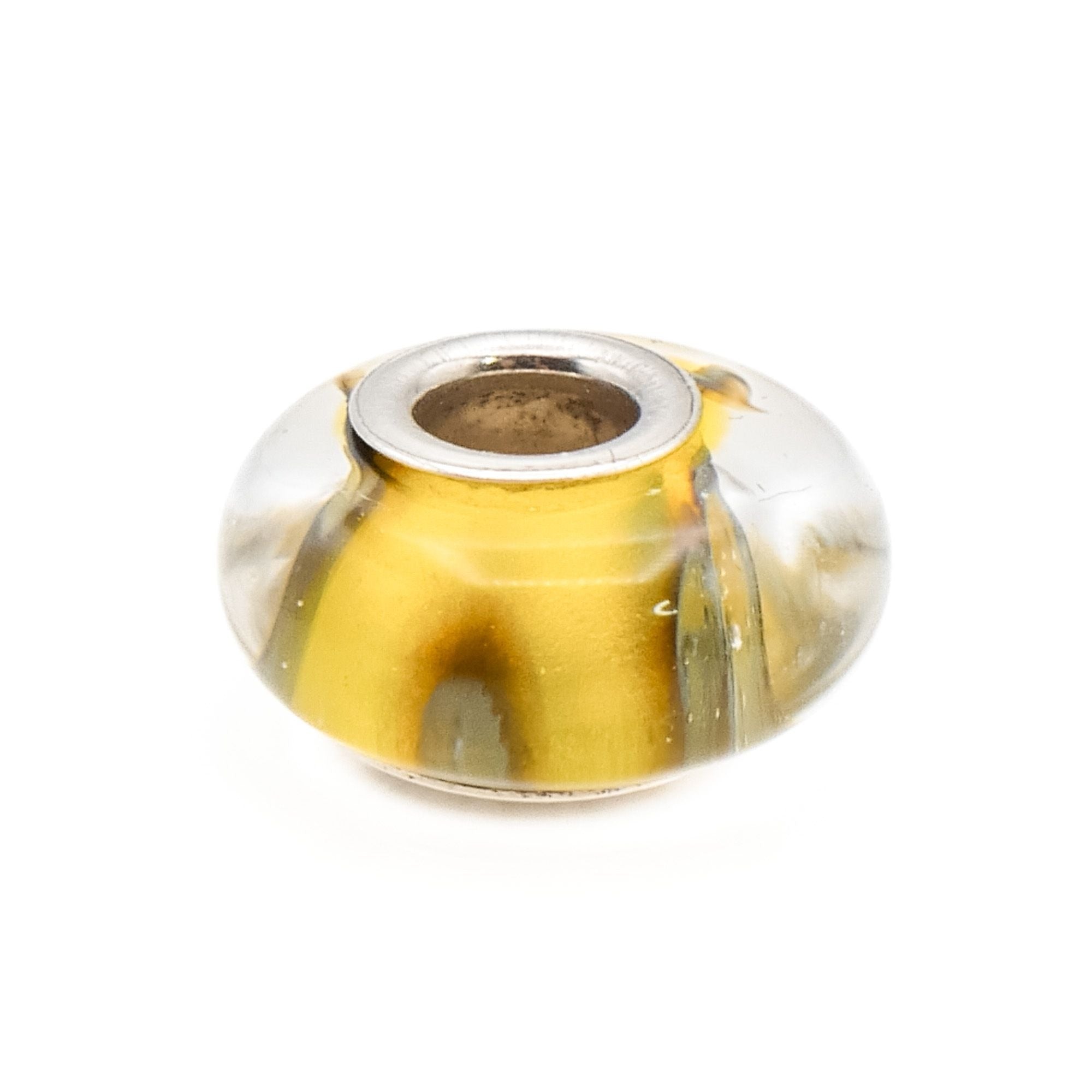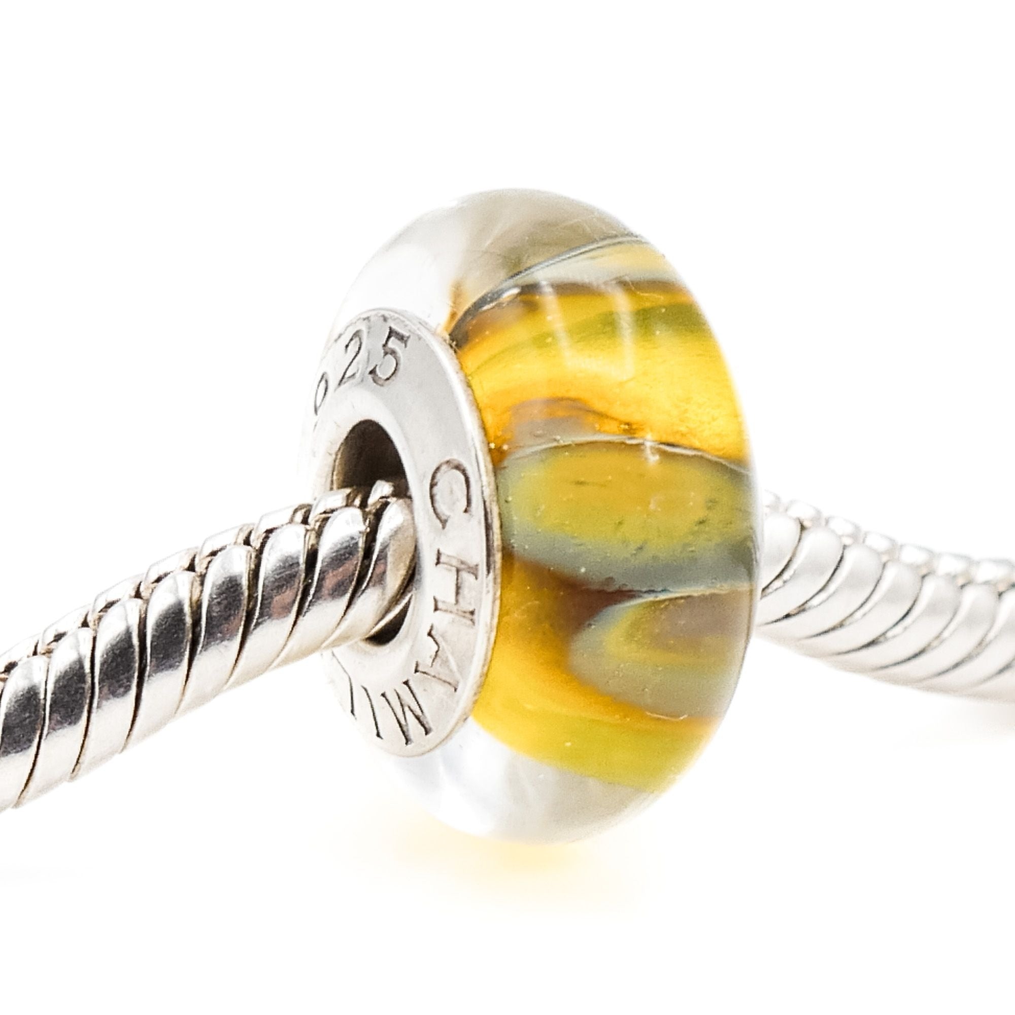 Add a vibrant splash of color to your charm bracelet with this genuine Chamilia Murano glass charm, beautifully named Sunrise Sunset. Featuring hues of orange, beige and warm gold, this European-style charm evokes the magical glow of a summer sky. The charm is encased in artisan-crafted Murano glass and set on a solid sterling silver core engraved with the Chamilia brand mark.