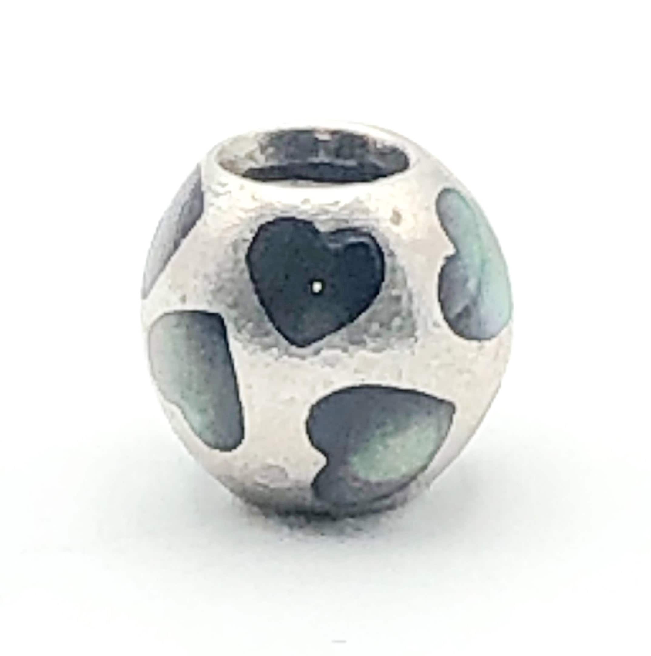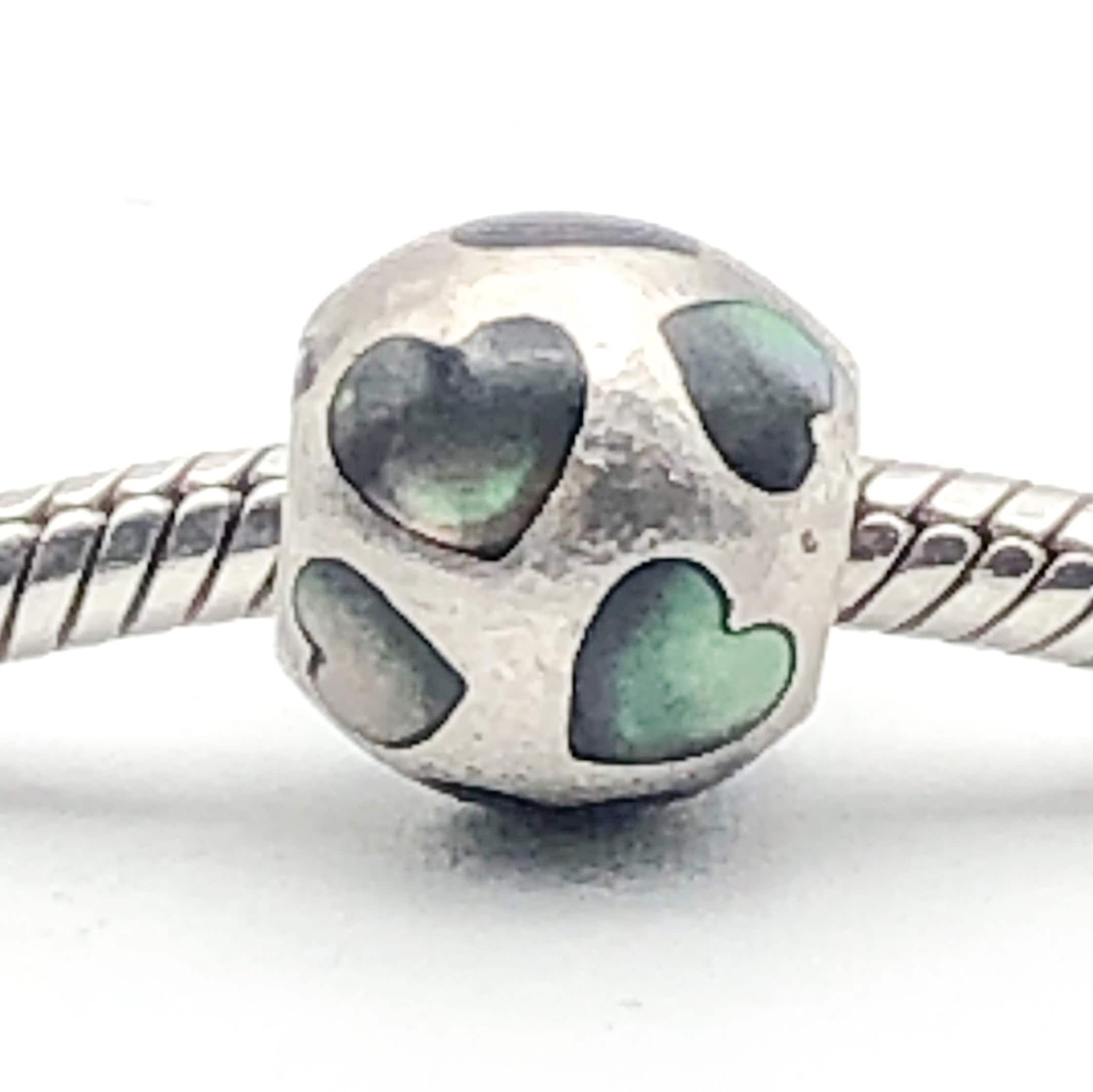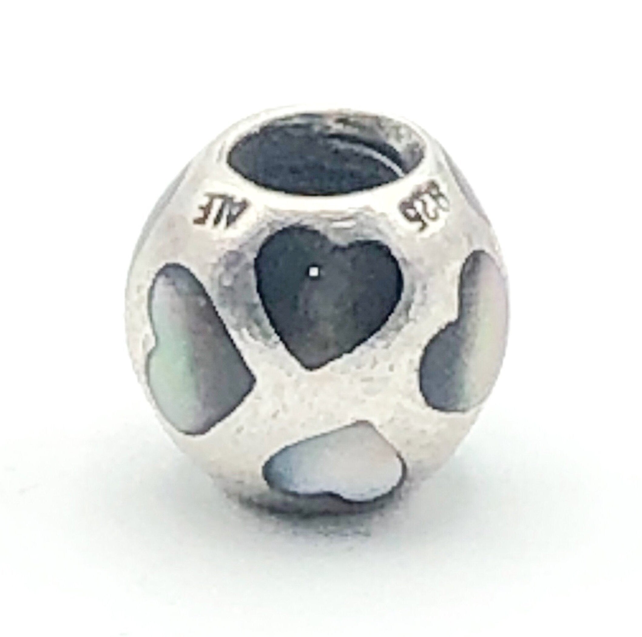 Authentic PANDORA Love Me Sterling Silver Charm With Black Mother of Pearl 790398MPB - Retired. This round Sterling Silver charm is embedded with black mother-of-pearl hearts that glisten in the light in many different shades. A beautiful way to say "I Love You!"