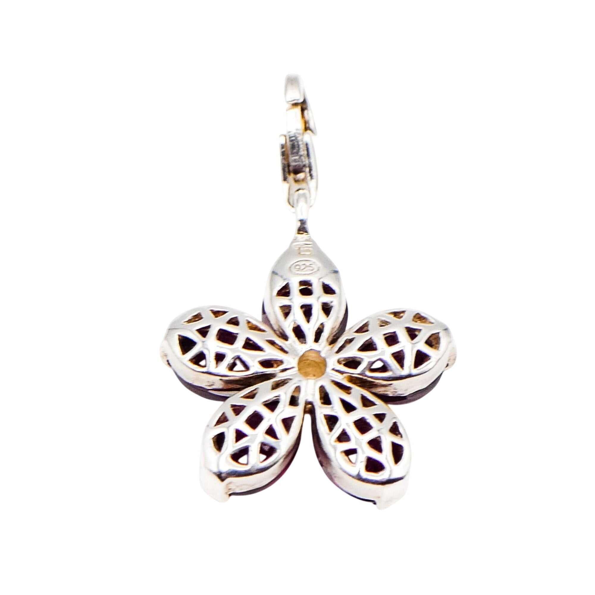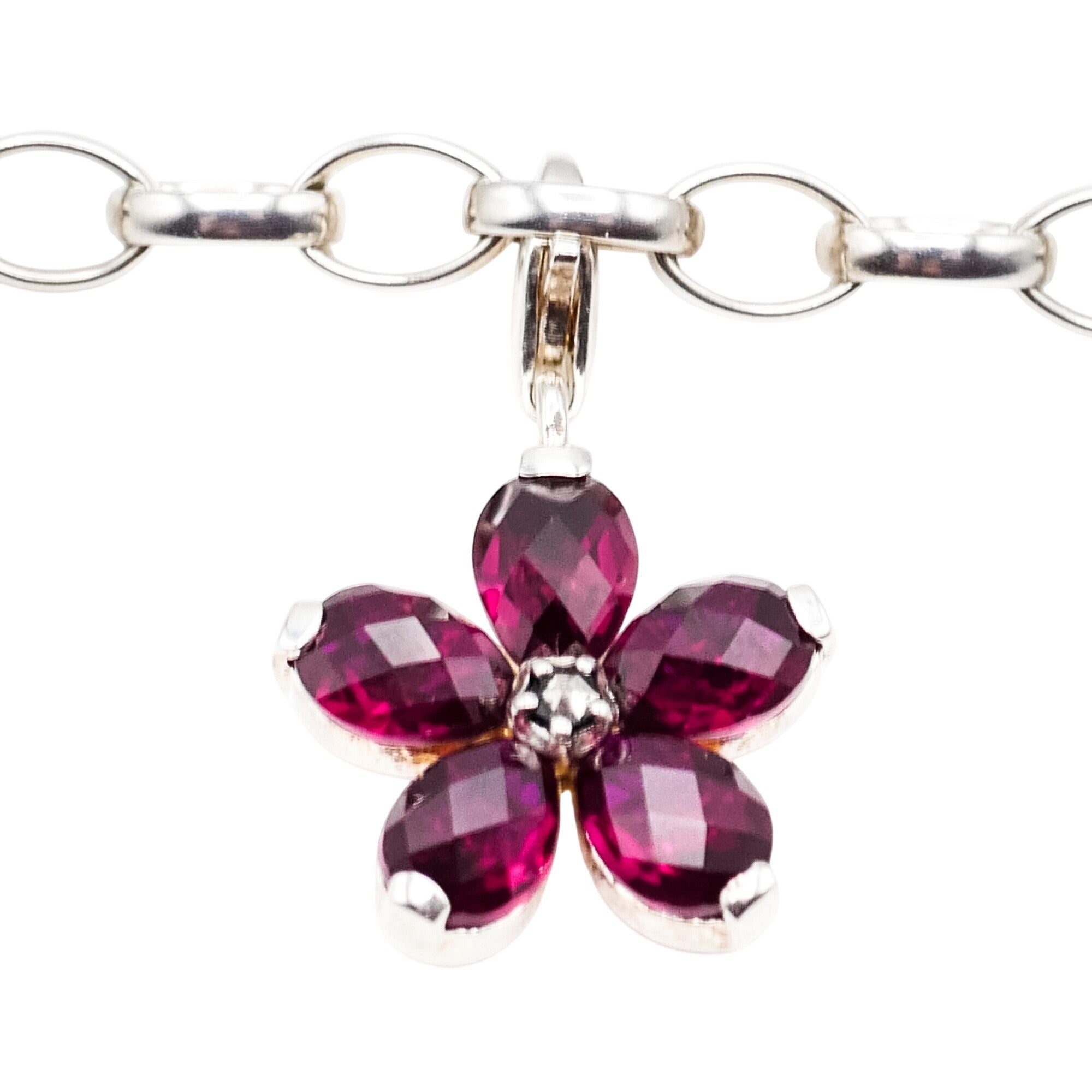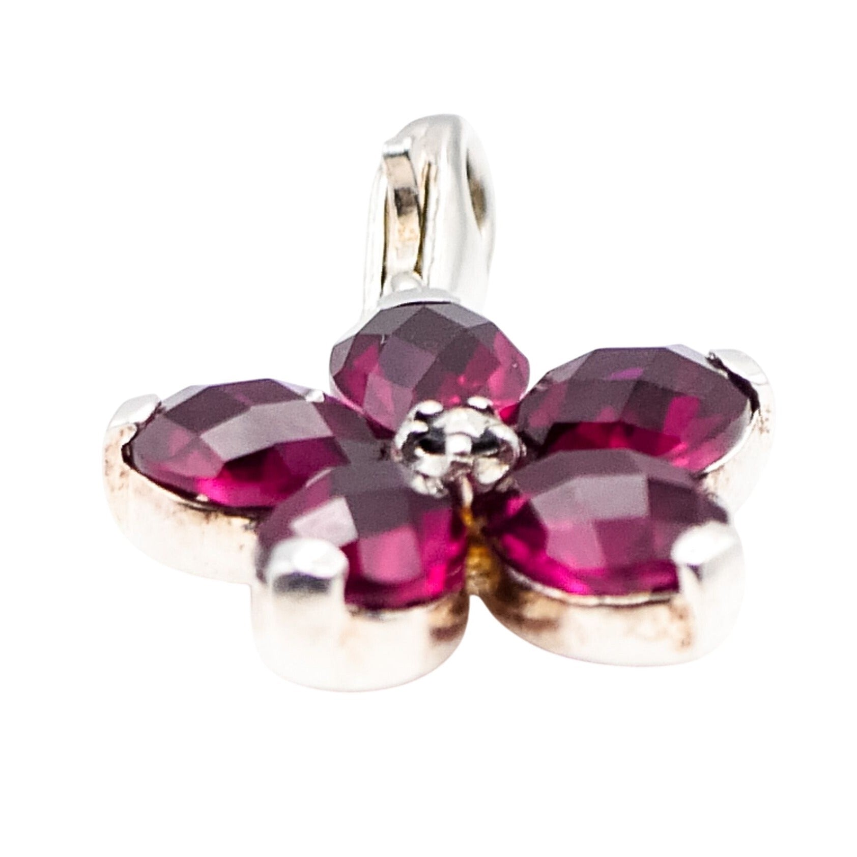 This very rare Thomas Sabo flower charm pendant is an exquisite example of fine gemstone design — featuring five genuine pear-shaped faceted rubies arranged as delicate flower petals with a shimmering marcasite accent at the center. Crafted in .925 sterling silver, it’s a standout collectible and a timeless statement of elegance.