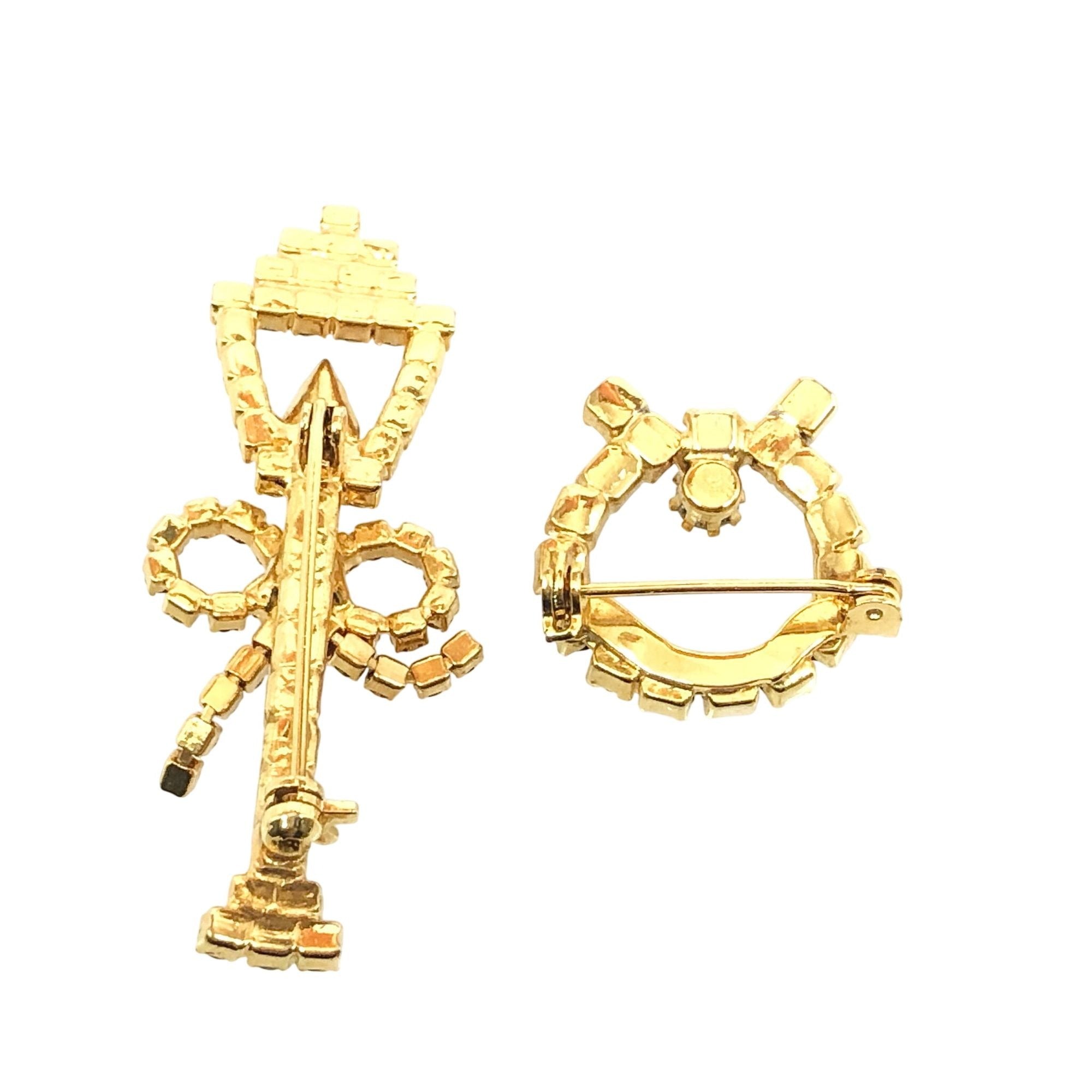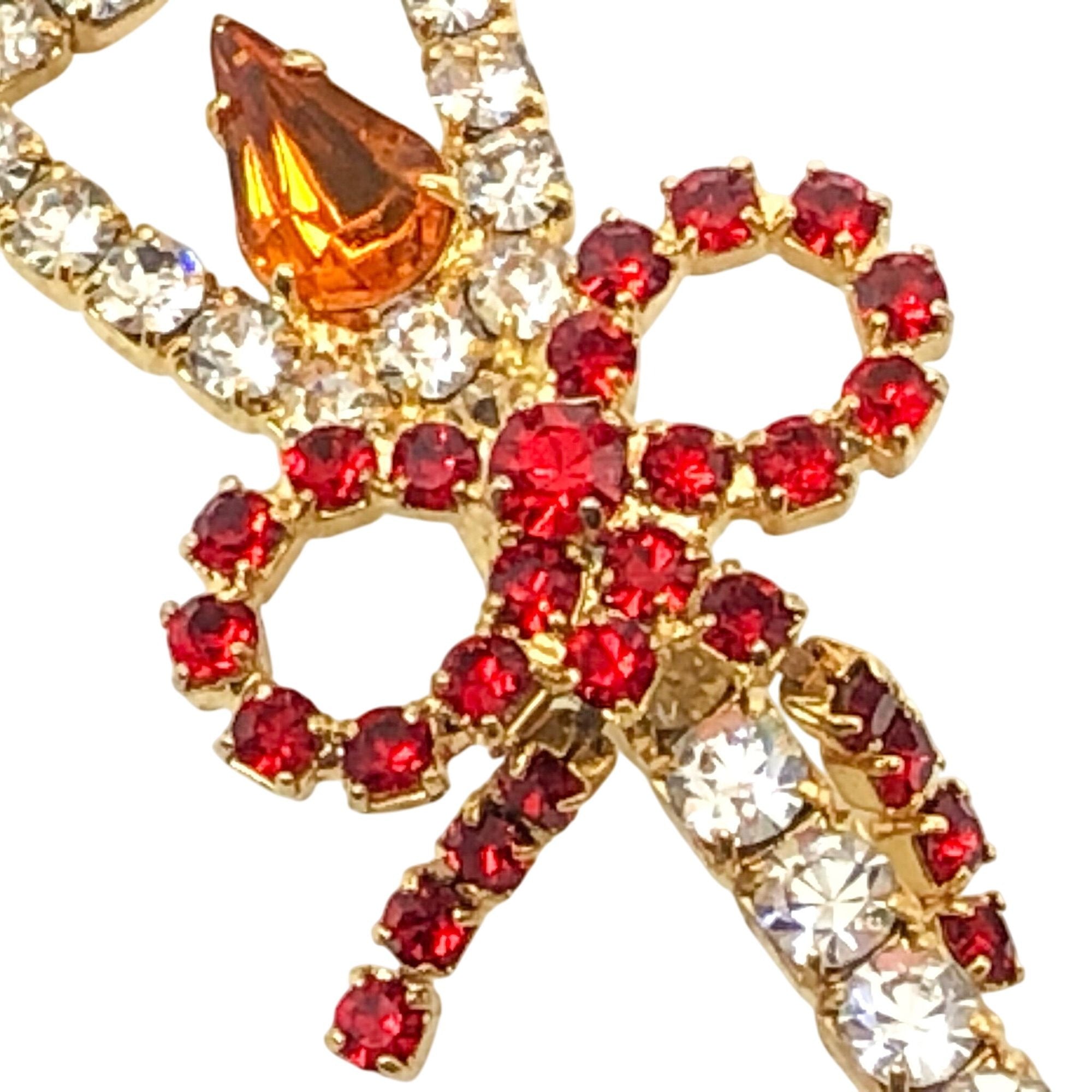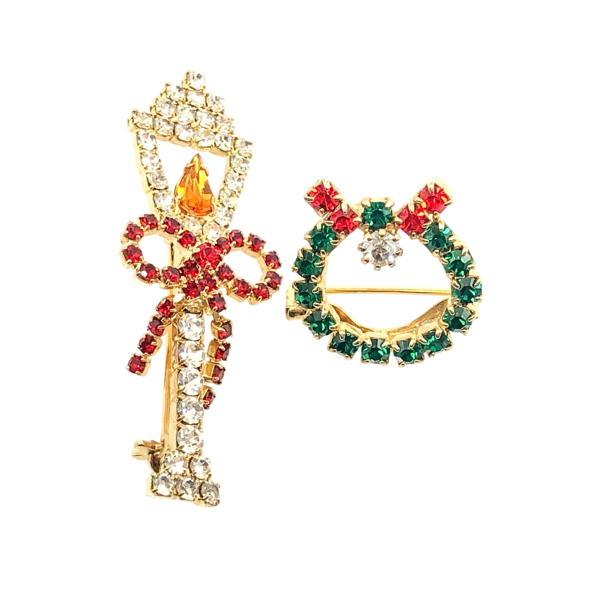 Vintage Candle And Wreath Brooches Pins With Prong Set Rhinestones. Beautiful exceptional quality pieces. All rhinestones are prong set. The candle is made of clear rhinestones with a red rhinestone bow that dangles. The candle light is a beautiful topaz color. The wreath consists of green, red and clear rhinestones. Both pieces sparkle brightly. Could be Eisenberg Ice or DeLizza & Elster.