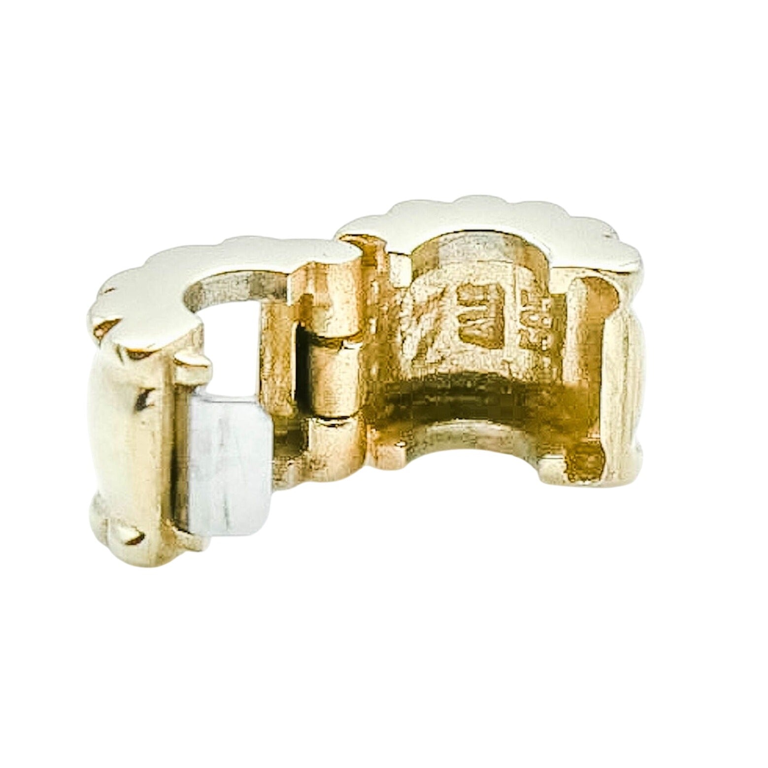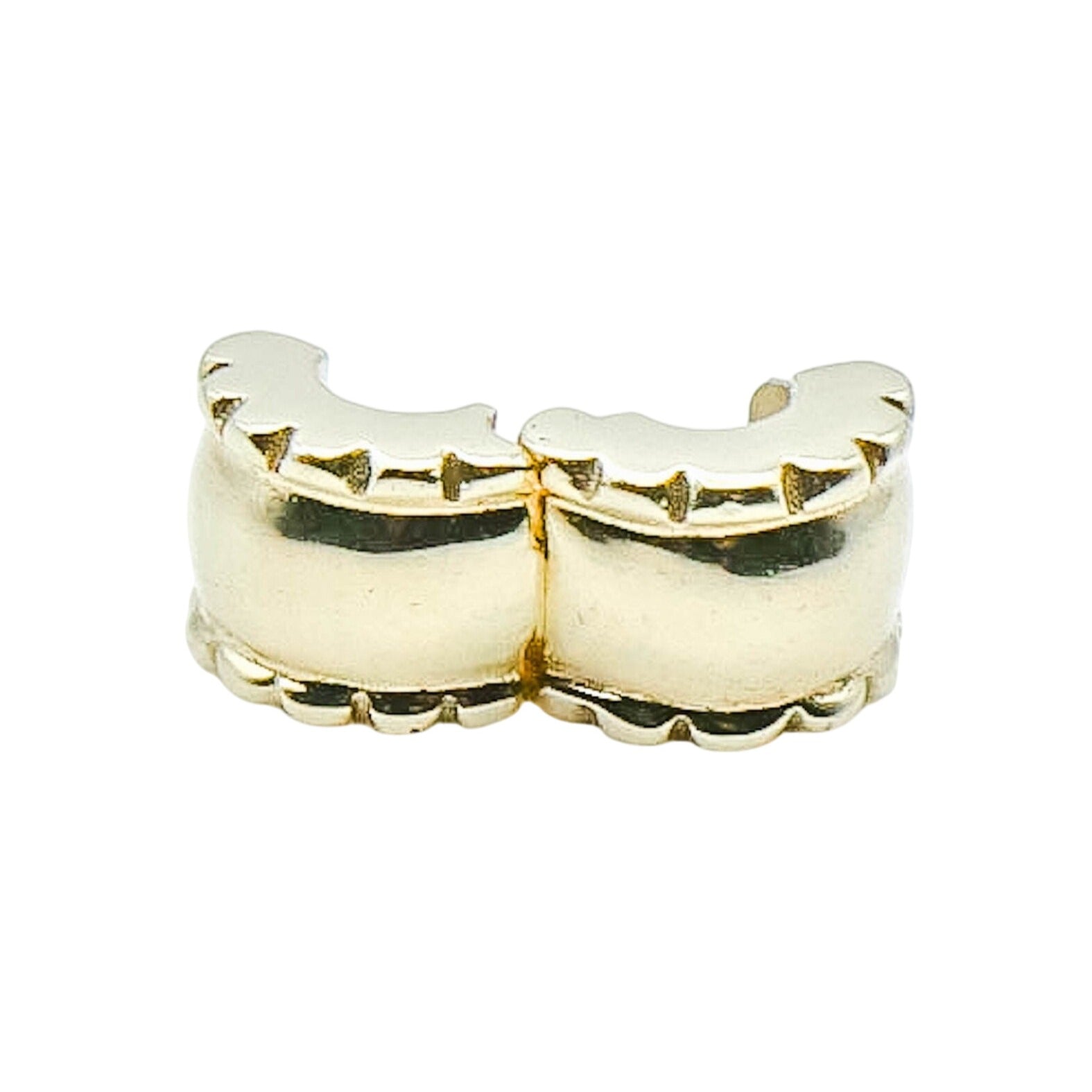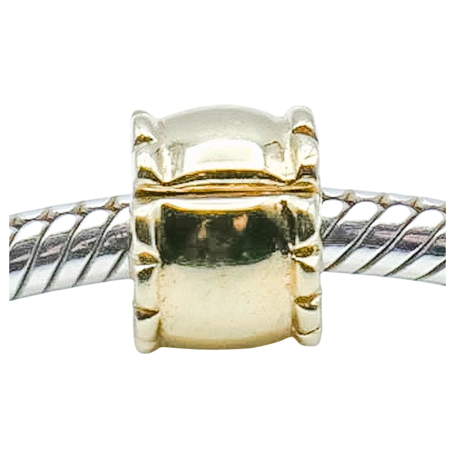 Authentic PANDORA 14K Gold Beveled Clip 750256 - Retired. Pandora's clips are an easy way for you to divide your bracelet into thirds. They're useful in bracketing whatever pattern of beads you choose. This elegant 14K gold clip features a smooth center with beveled edges.