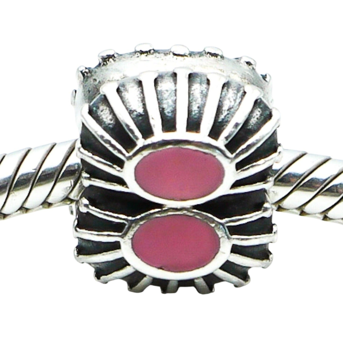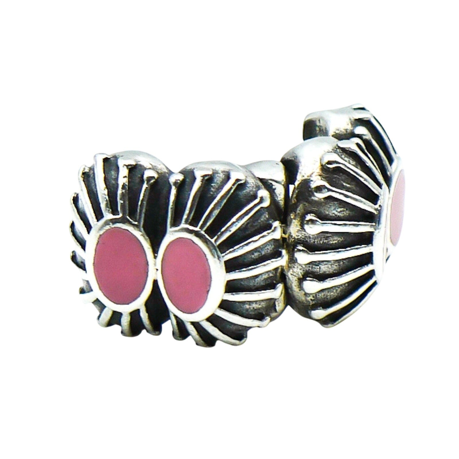 Authentic PANDORA Pink Enamel One Of A Kind Sterling Silver Clip Charm With Pink Enamel 790578EN24 - Retired. Divide your bracelet into thirds with these beautiful clips. This Sterling Silver clip has four pink enamel centers accented with silver sunbursts. A larger clip that definitely makes a statement.