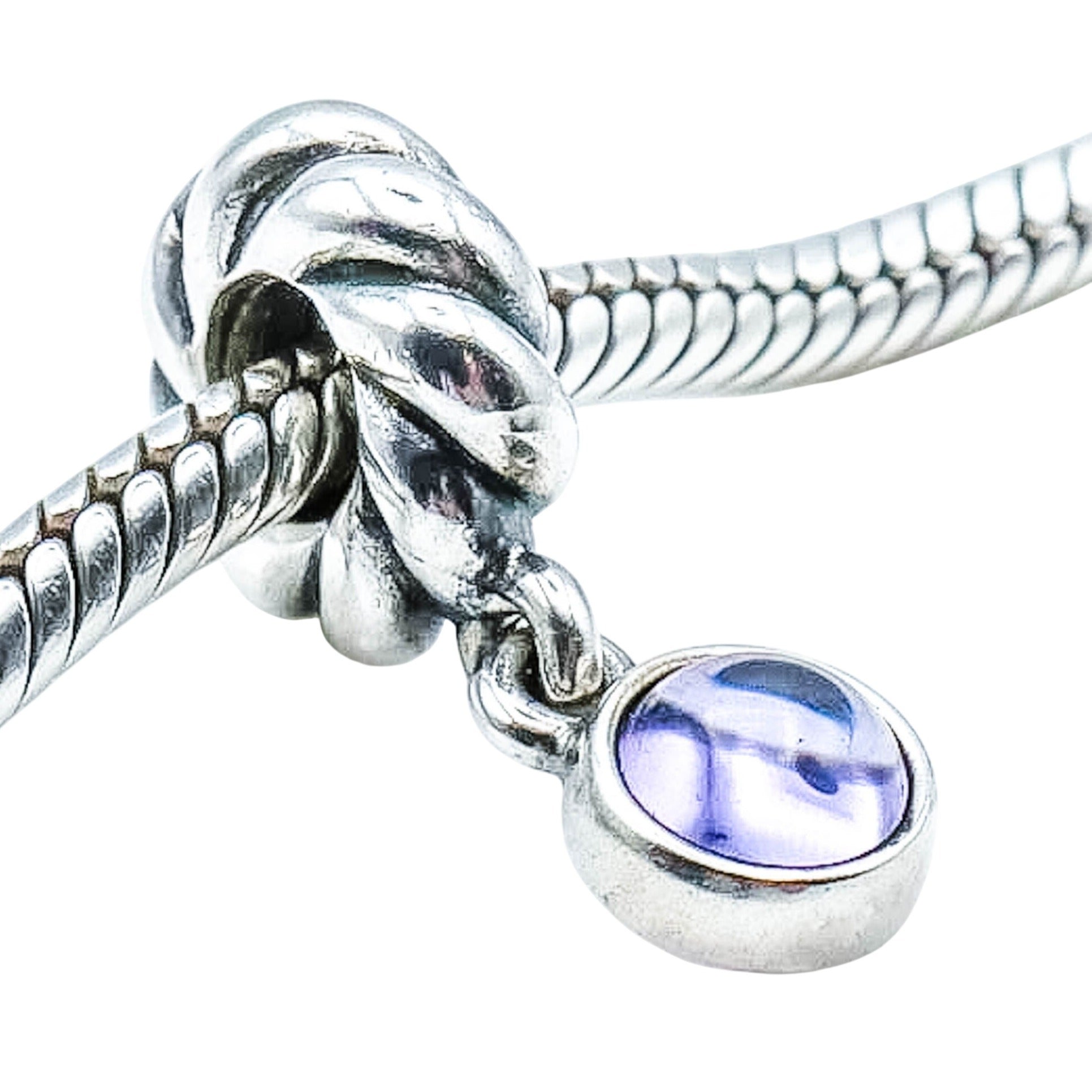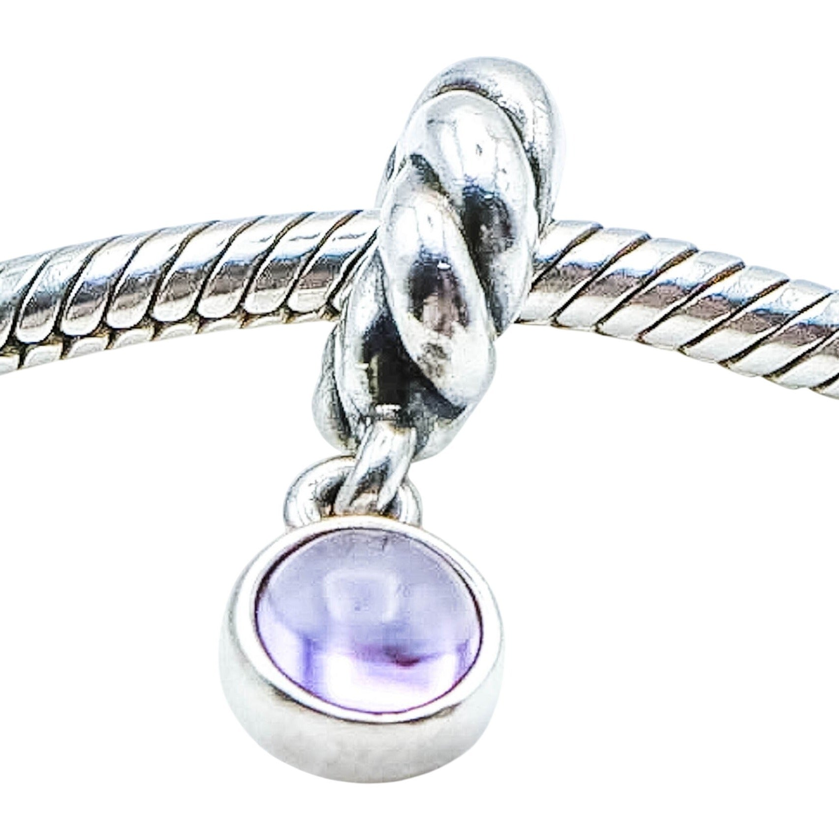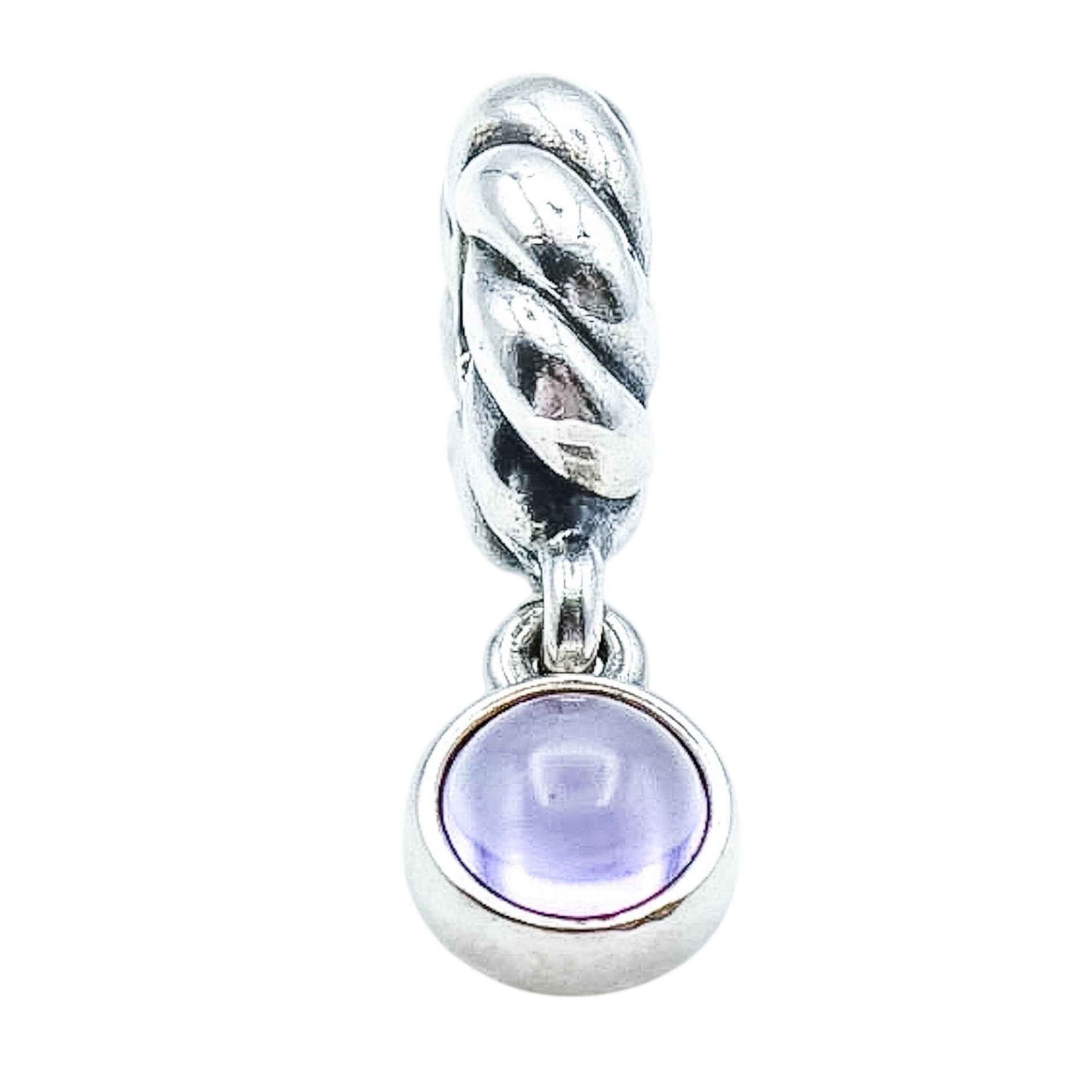 This elegant, retired Pandora dangle charm features a genuine amethyst cabochon set in sterling silver. The classic bezel-set disk design is suspended from a sculptural twisted bail, creating graceful movement and timeless style on any bracelet.