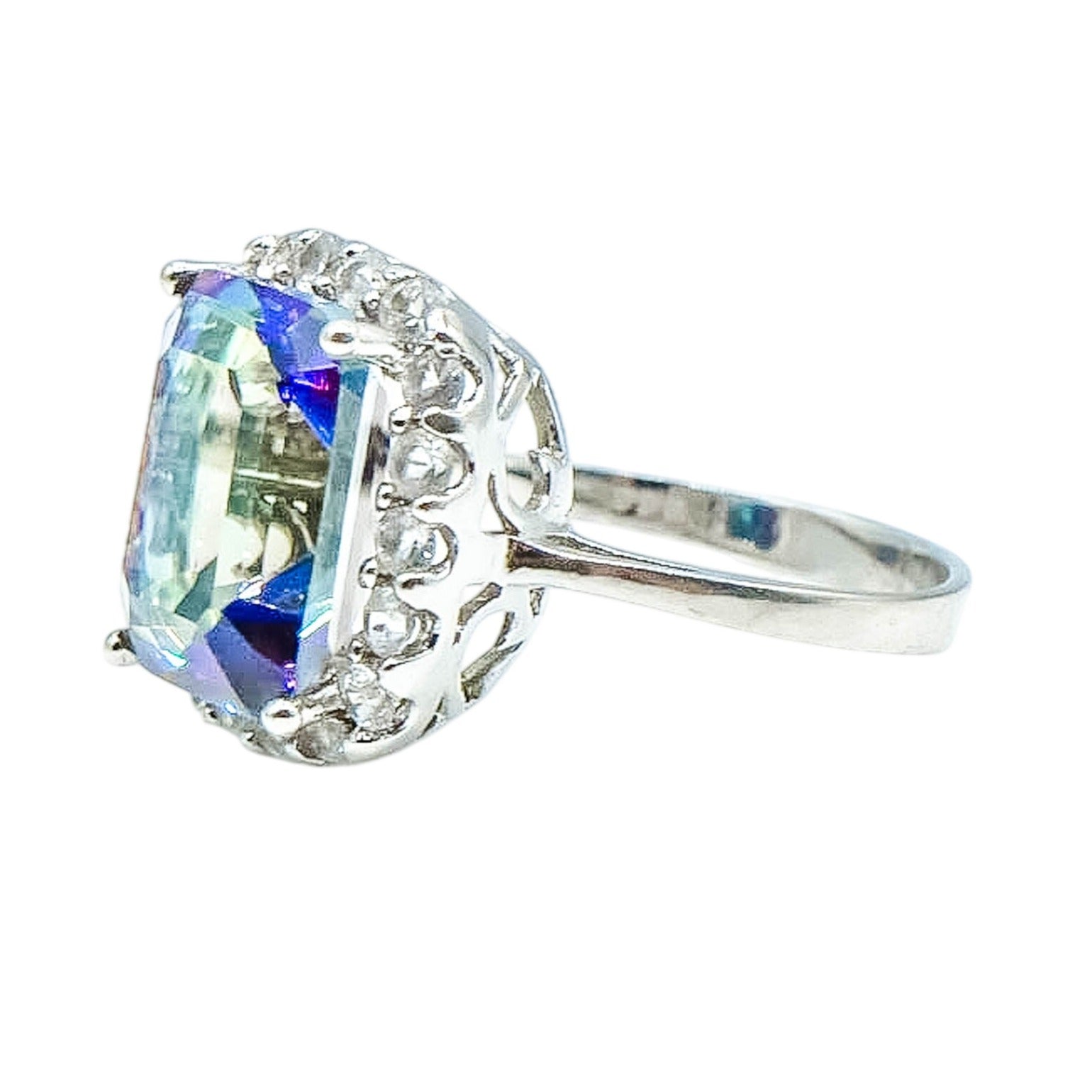 The allure of this ring lies in its dazzling Ocean Mystic Topaz centerpiece, a 6.2 ct stone radiating hues of blue and green. Encircled by a stunning 1.14 ctw White Topaz halo, the sterling silver band enhances the brilliance, making this an elegant and timeless accessory.