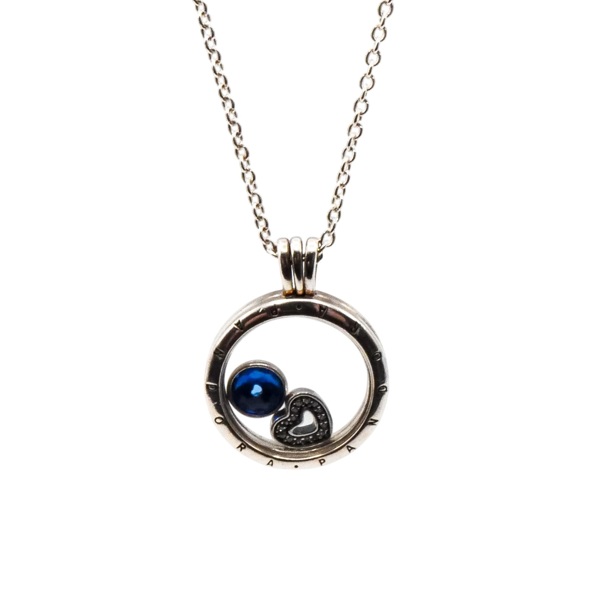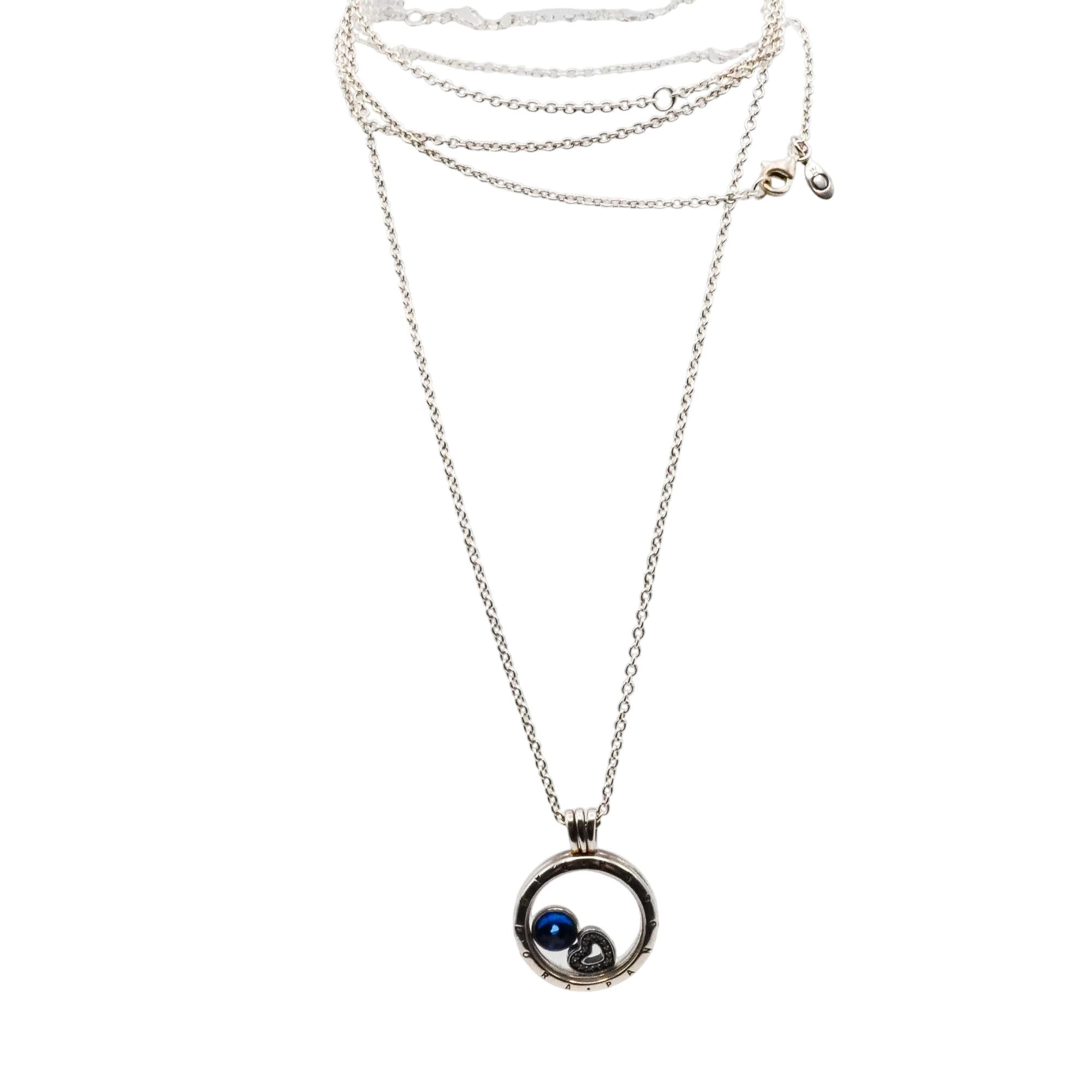 Authentic Retired Pandora Floating Locket Sterling Silver Necklace With Pandora London Blue Cubic Zirconia December Birthstone & Pandora Captured Heart Petite Locket Charms - 590629-60, 590200, 792175NLB and 792163CZ. This beautiful 35-Inch Sterling Silver cable chain necklace is the classic Pandora necklace. Very versatile, it can be worn alone or layered. The pendant is a round locket with Pandora logo that can be opened when the chain is removed and petite charms can be added. This makes the perfect gift for that special someone.