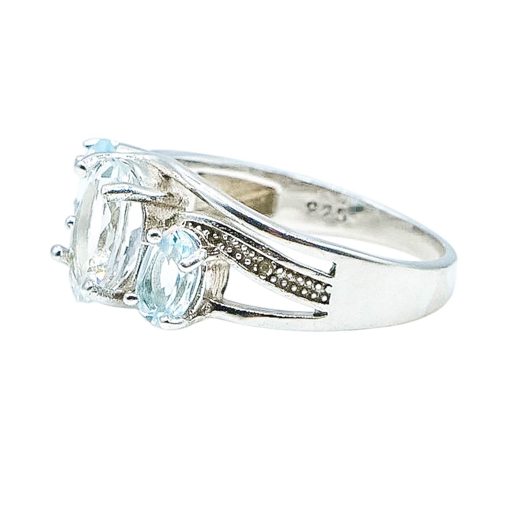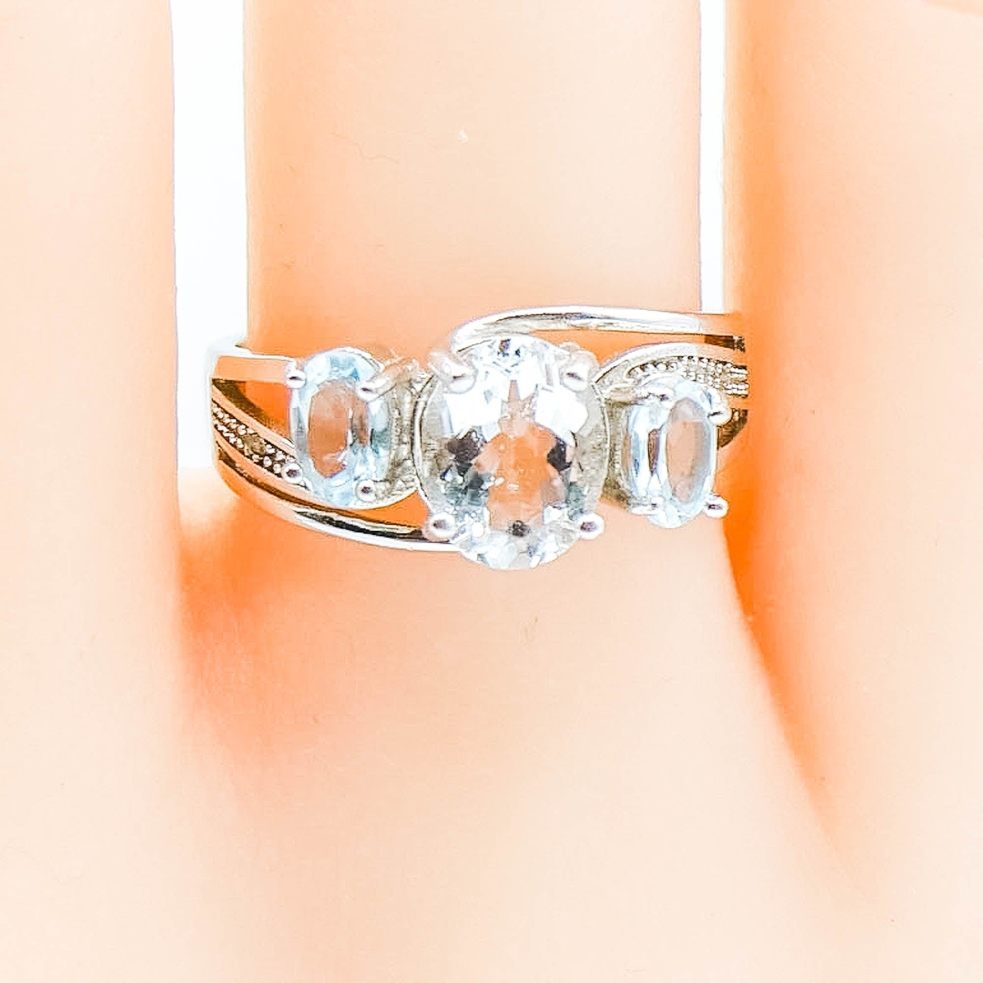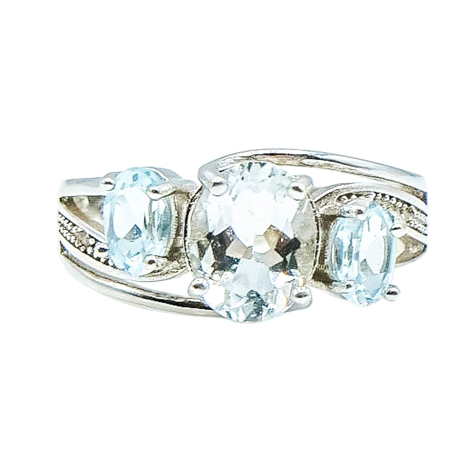 This exquisitely designed ring highlights a captivating 2 carat oval-cut aquamarine at its center. It's flanked by two sky-blue topaz stones of 1.2 carats combined, offering a harmonious blend of elegance and brilliance. Accented with genuine diamonds, the platinum over sterling silver band adds a touch of timeless sophistication.