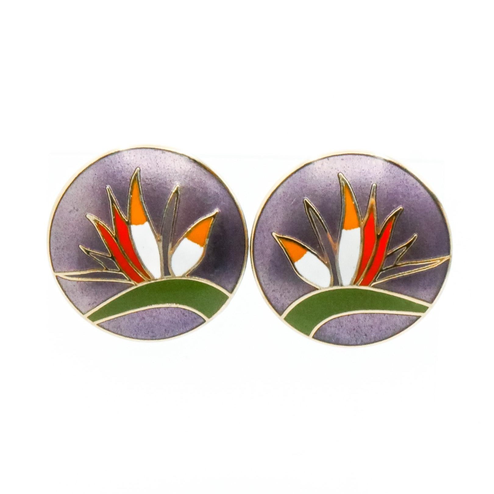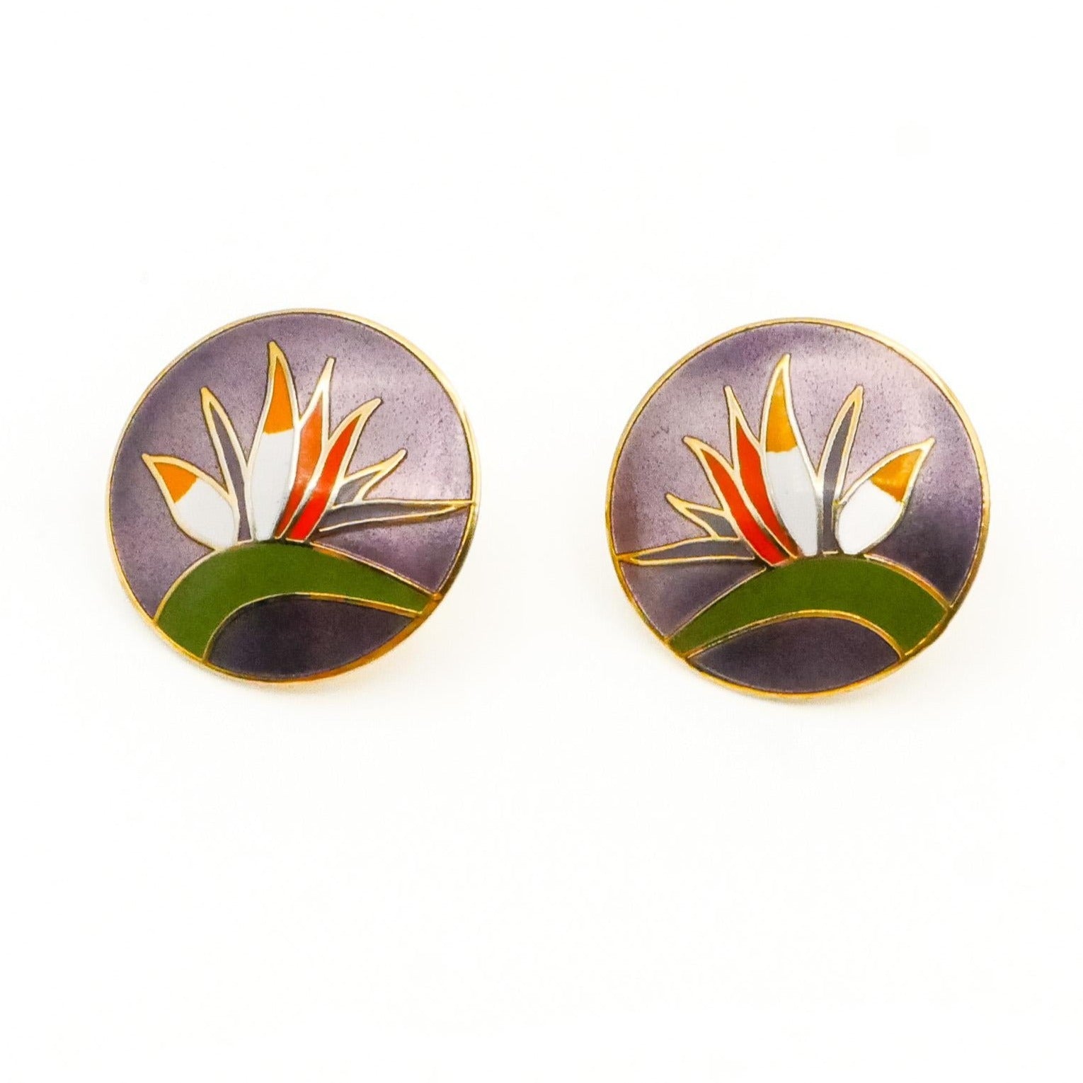 These striking vintage Laurel Burch cloisonné stud earrings feature a vibrant Bird of Paradise blossom rendered in rich enamel atop a purple background, framed by a gold-plated disc. Bold, colorful, and symbolic, the design reflects Laurel Burch’s unmistakable artistic style and love of expressive nature motifs.