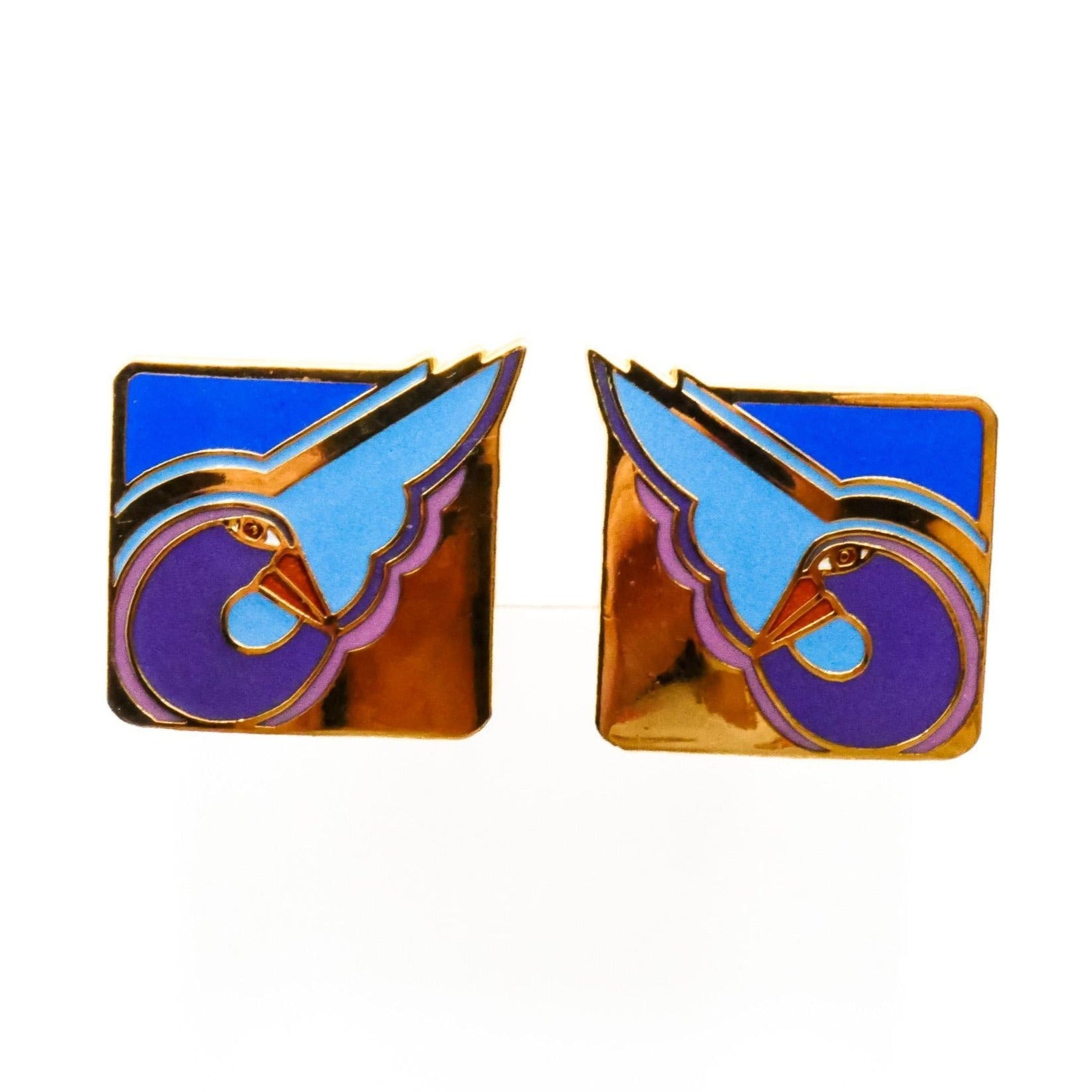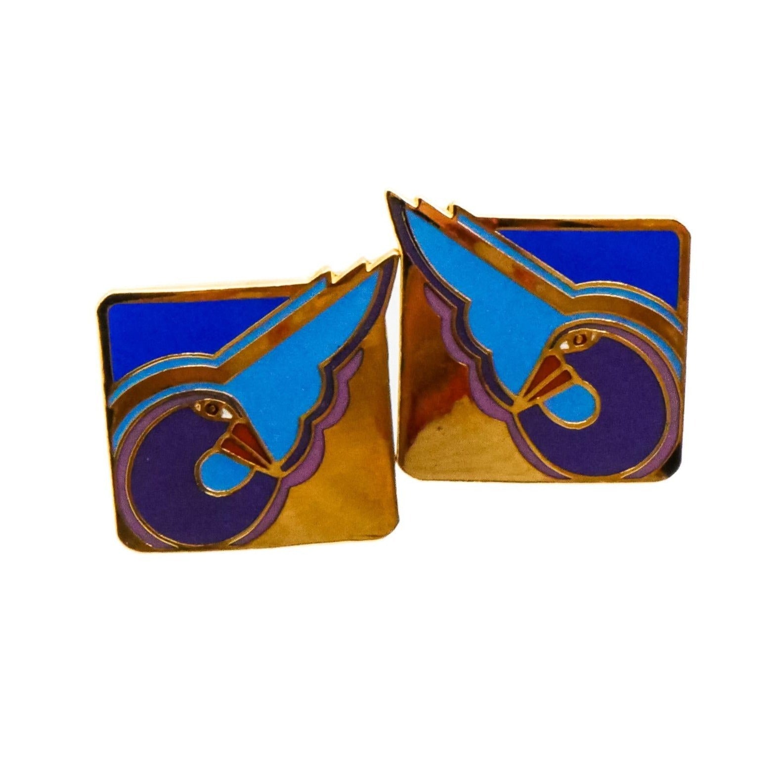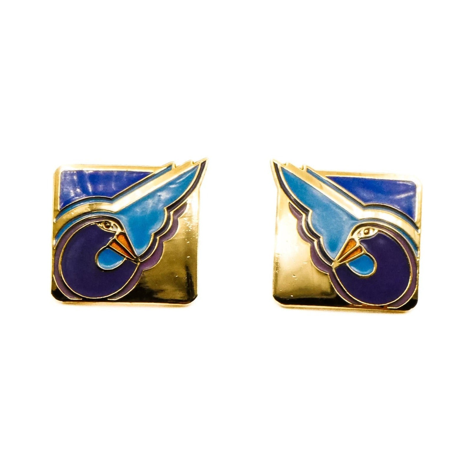These striking vintage Laurel Burch “Shabird” cloisonné stud earrings feature a bold bird motif rendered in vibrant blue, purple, and orange enamel, set within a gold-plated square frame. Rich color, symbolic imagery, and sculptural form reflect Laurel Burch’s unmistakable artistic style.