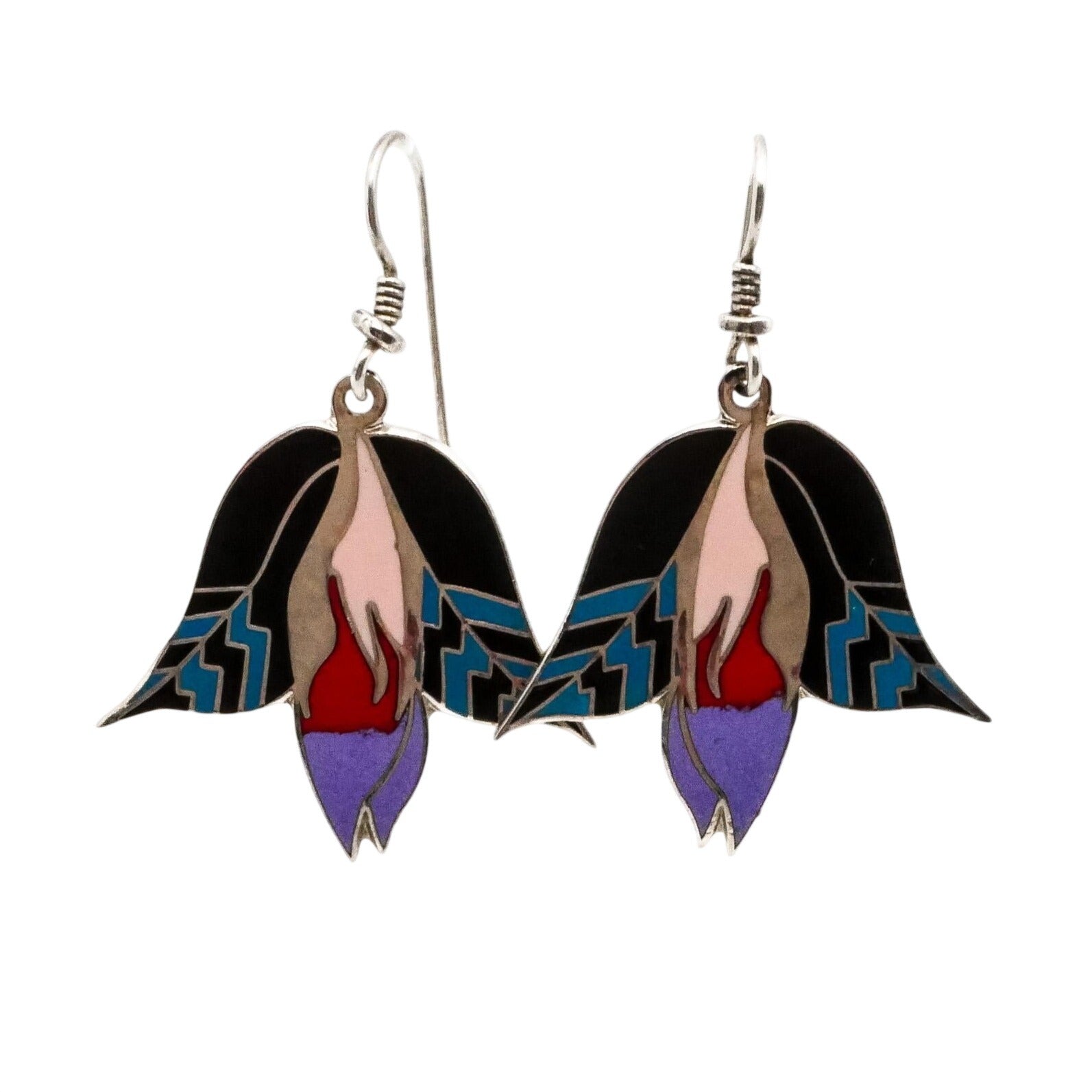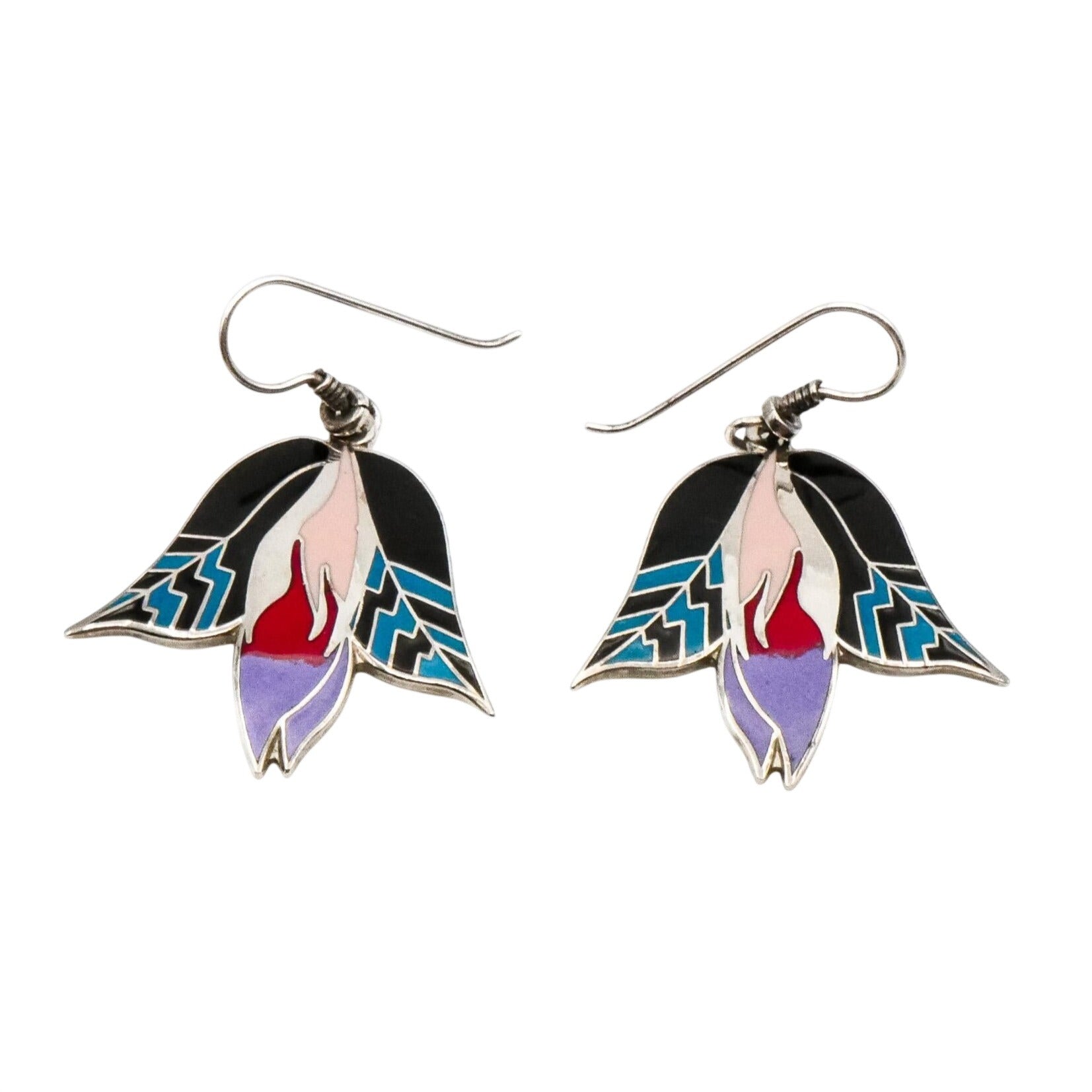 These vintage rare Laurel Burch “Jungle Jasmine” dangle earrings showcase her iconic cloisonné artistry in a bold floral design. Featuring a vibrant mix of black, lavender, red, turquoise, and pink, the richly enameled flower motif reflects Laurel Burch’s unmistakable love of color and symbolism.