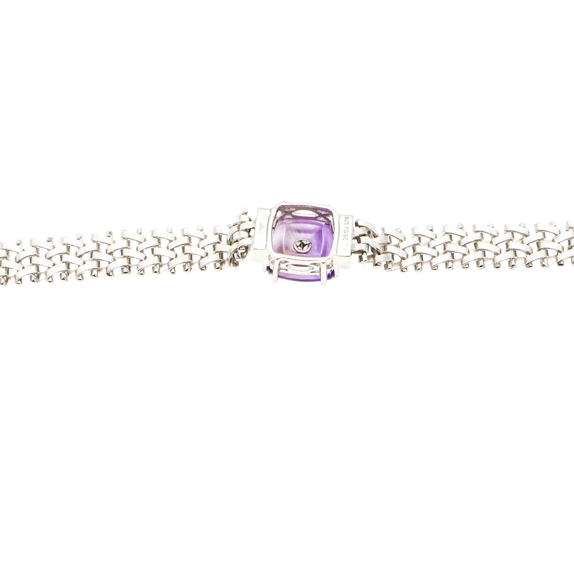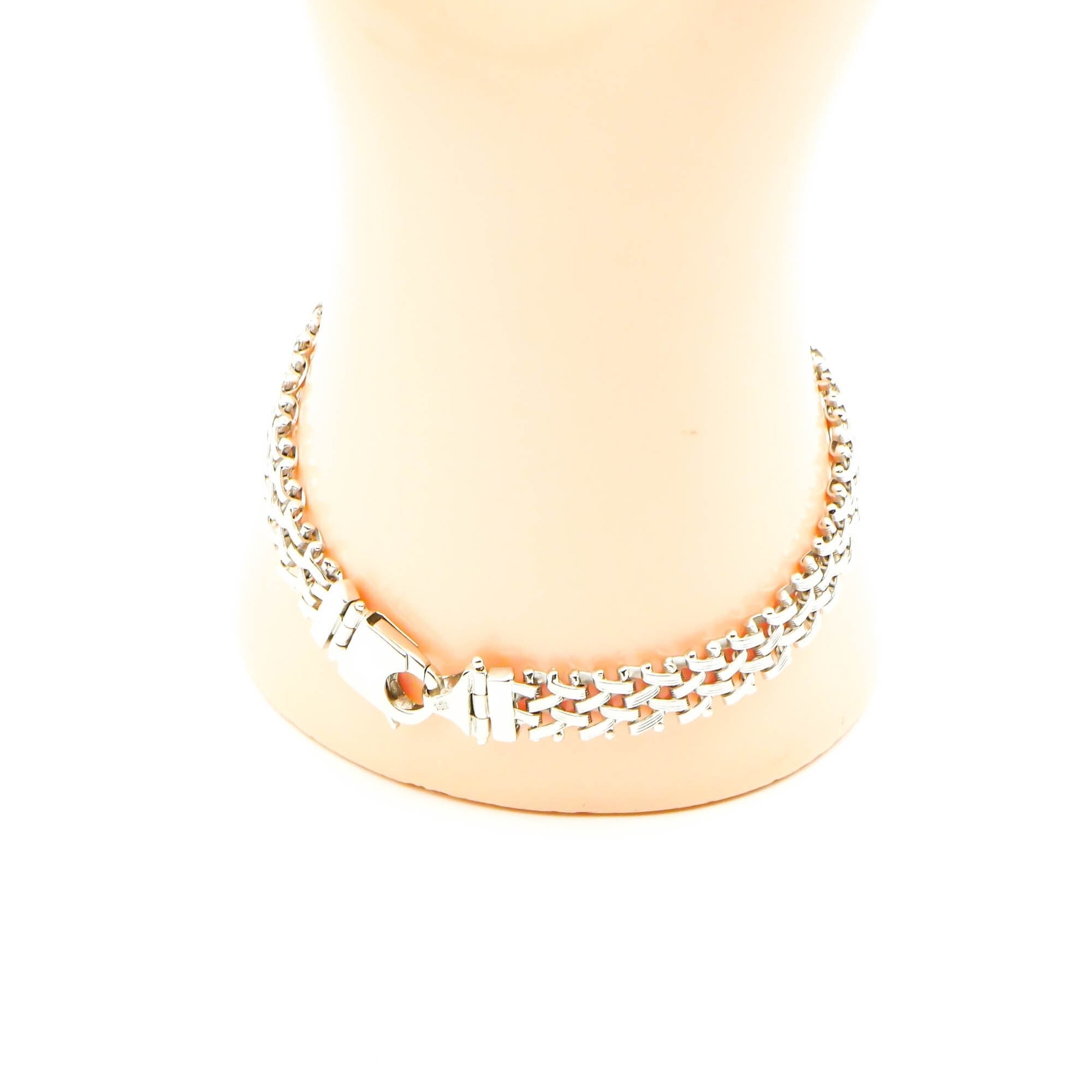 The sterling silver bracelet measures 7.5 inches and is crafted in a distinctive 8mm wide woven construction, designed to move fluidly and conform comfortably to the wrist. This advanced engineering allows the bracelet to drape naturally, creating a luxurious, glove-like feel against the skin.