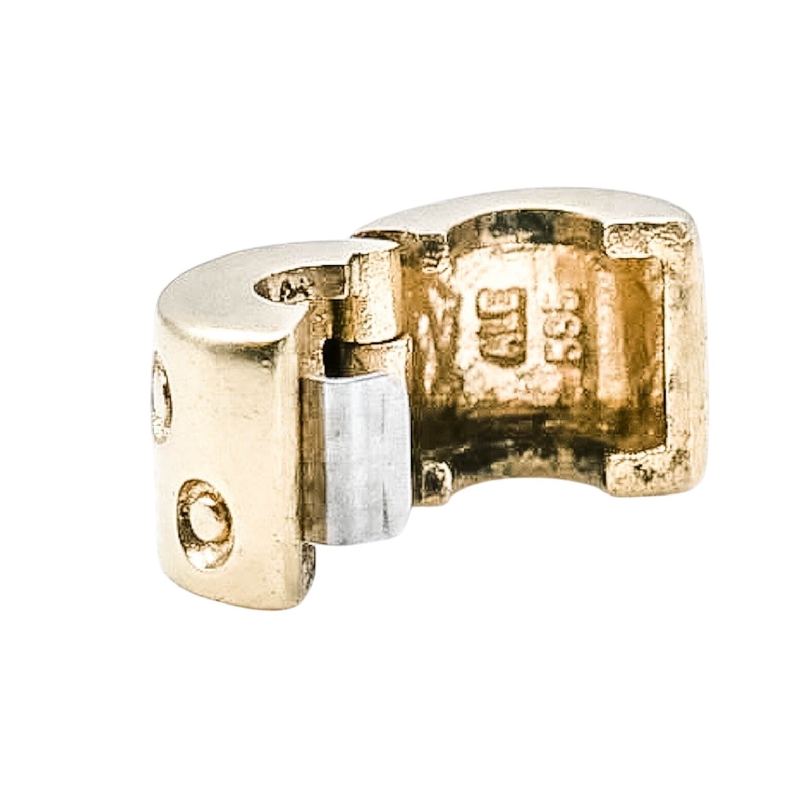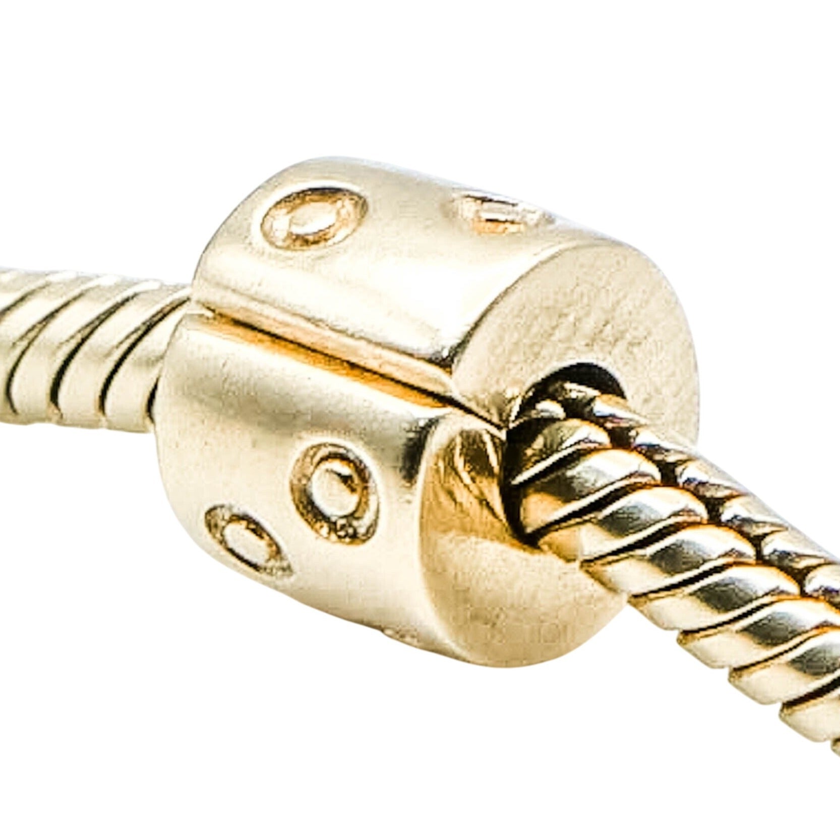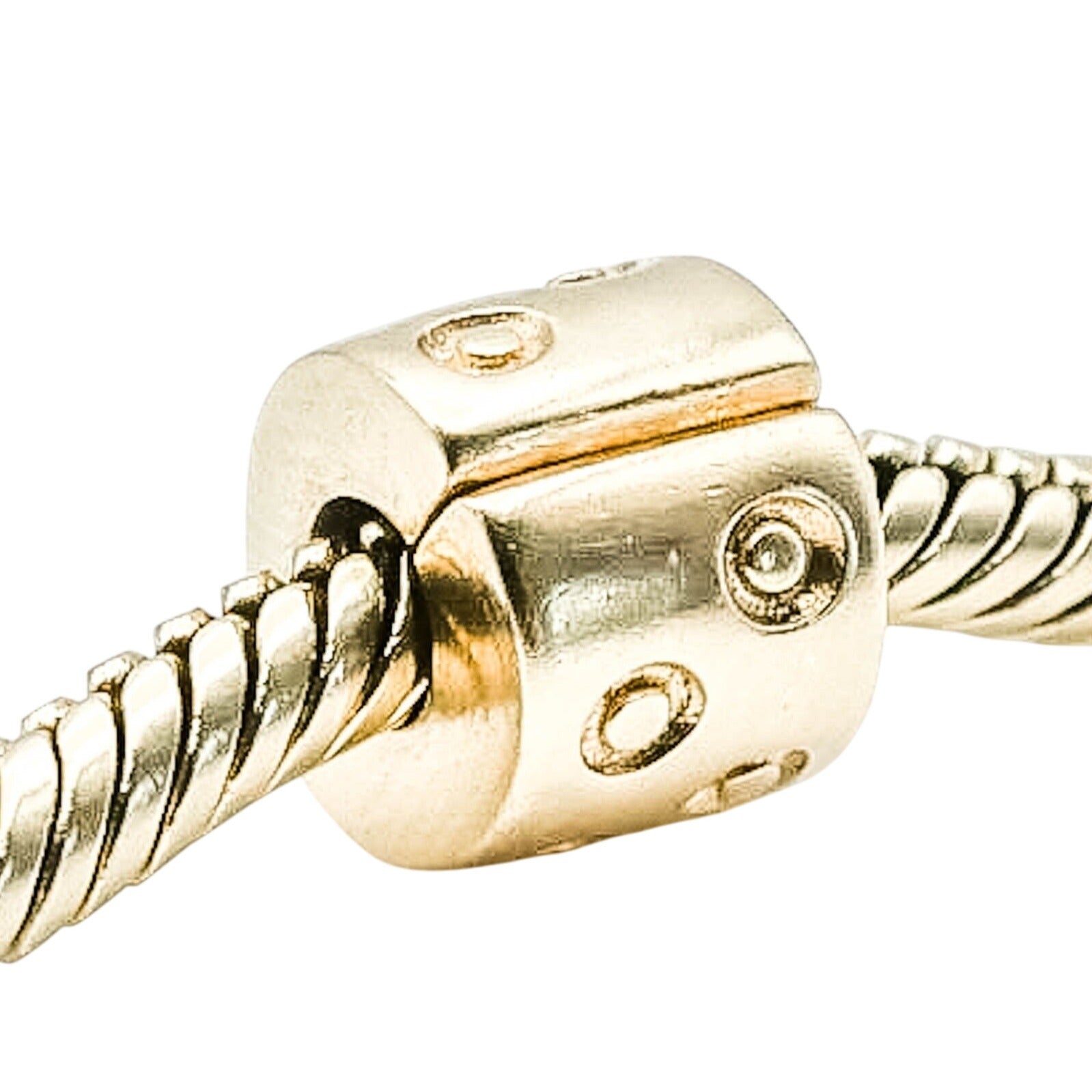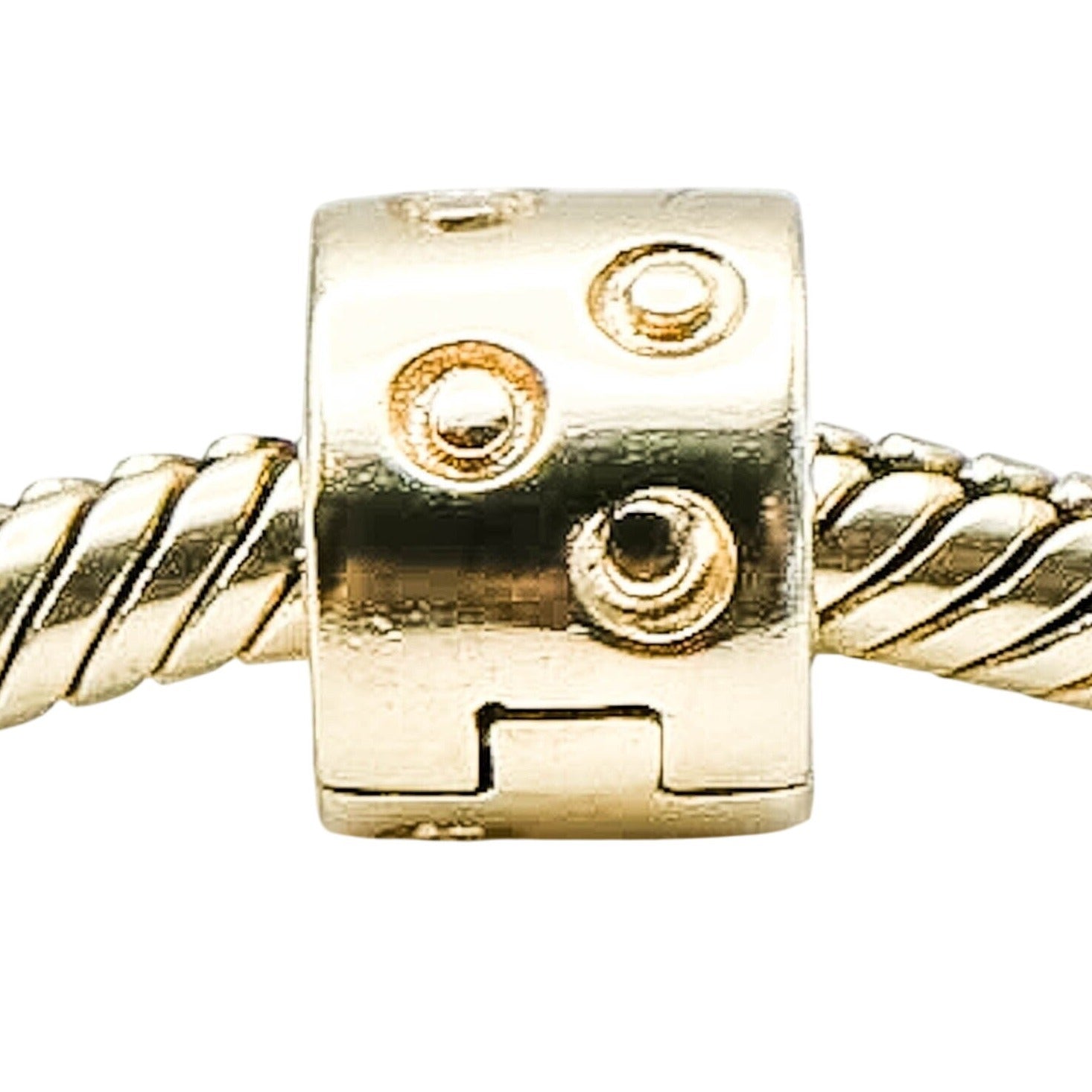 Authentic PANDORA 14K Gold Seeing Spots Clip 750345 - Retired. Pandora's clips are an easy way for you to divide your bracelet into thirds. They're useful in bracketing whatever pattern of beads you choose. This elegant 14K gold clip features a smooth exterior with small carved circles throughout.