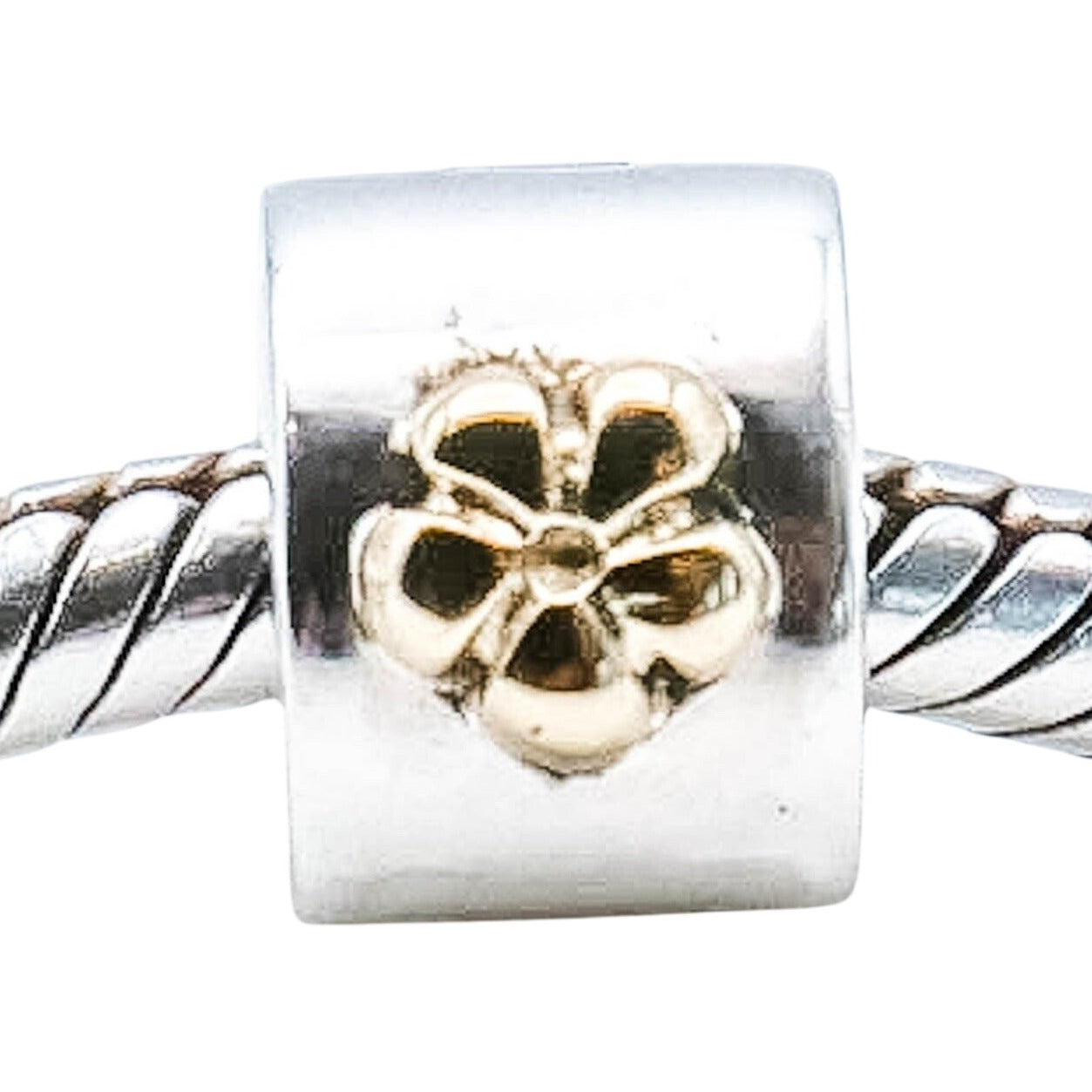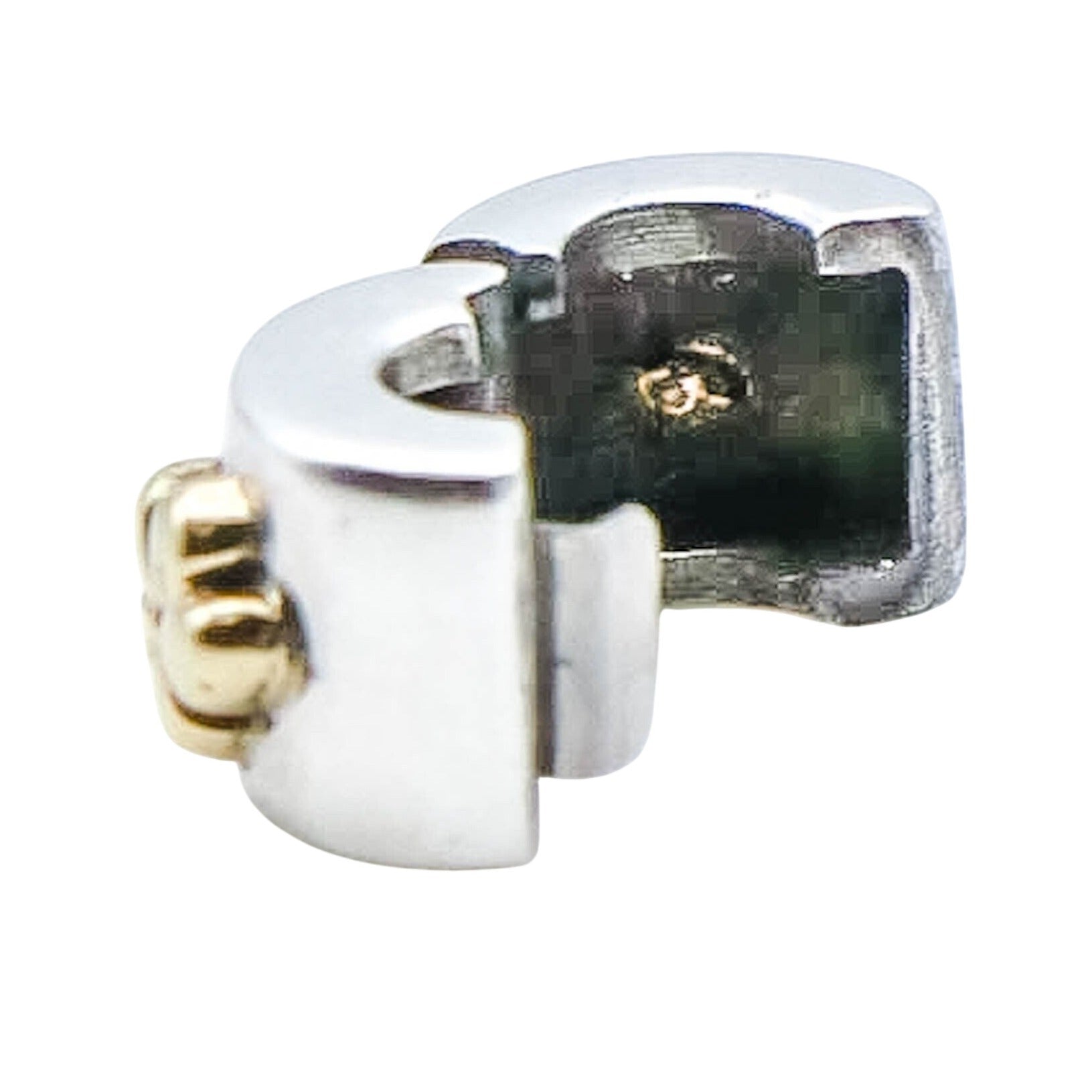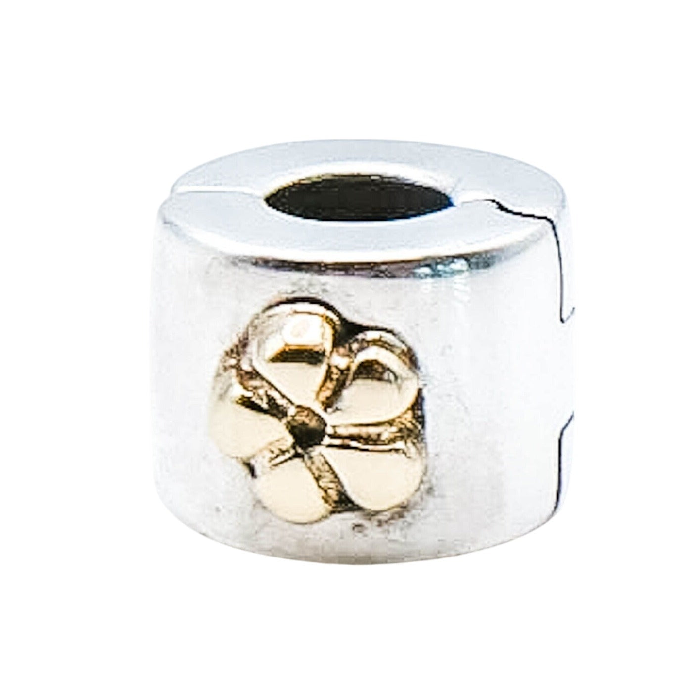 Authentic PANDORA Flower CLIP CHARM #790140 Sterling Silver With 14K Gold Flowers, 925 ALE, Retired. Pandora's clips are an easy way for you to divide your bracelet into thirds. They're useful in bracketing whatever pattern of beads you choose. This clip features sterling silver with two 14K gold flowers.