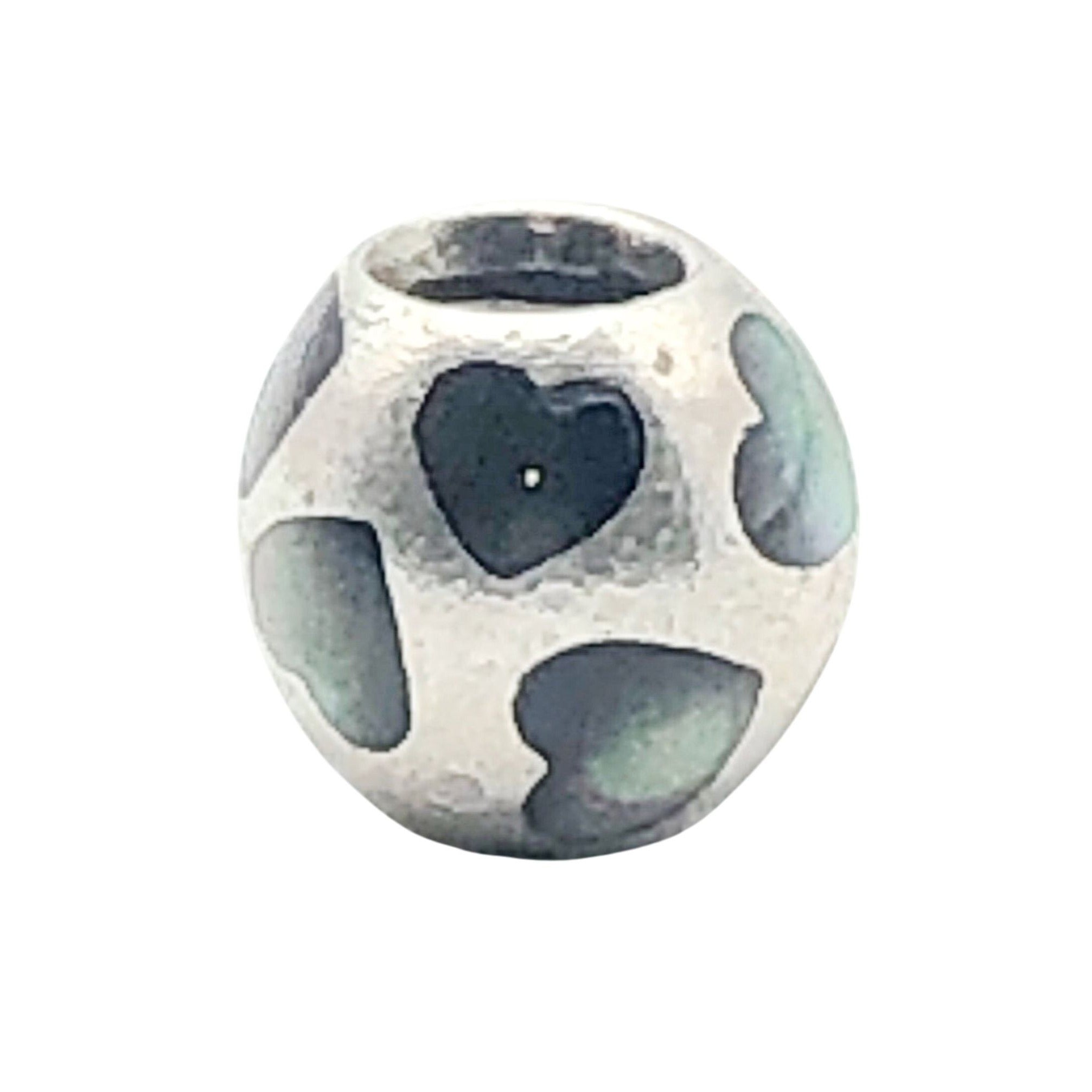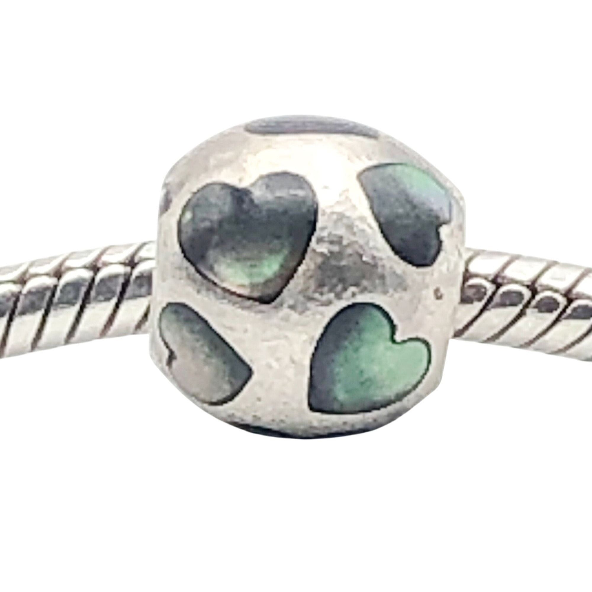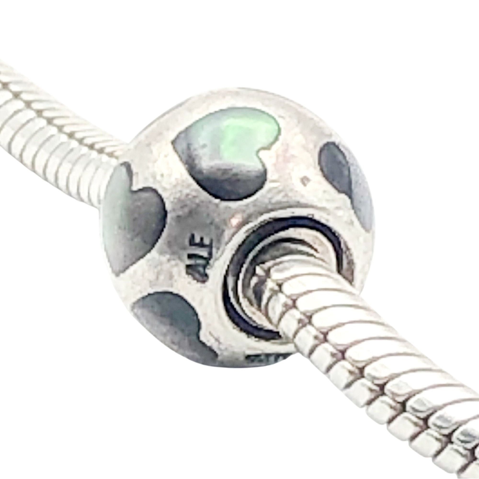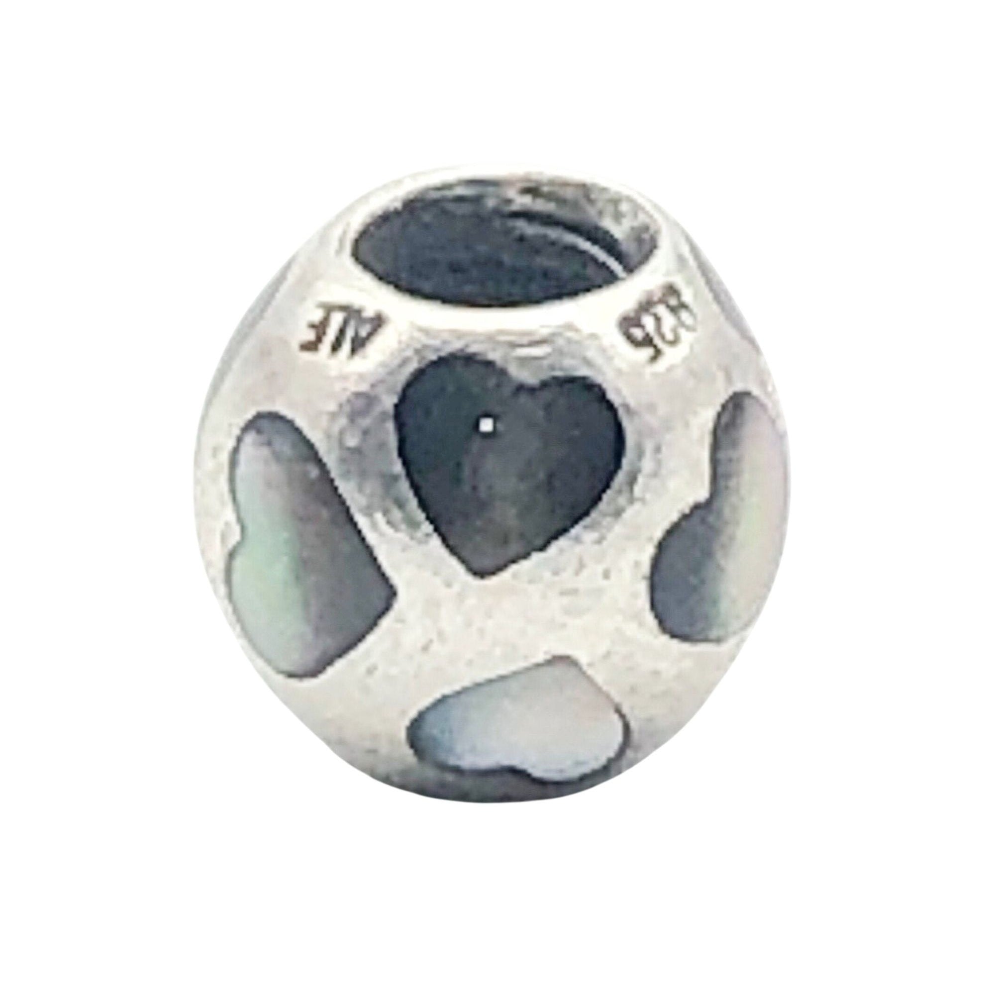 Authentic PANDORA Love Me Sterling Silver Charm With Black Mother of Pearl 790398MPB - Retired. This round Sterling Silver charm is embedded with black mother-of-pearl hearts that glisten in the light in many different shades. A beautiful way to say "I Love You!"