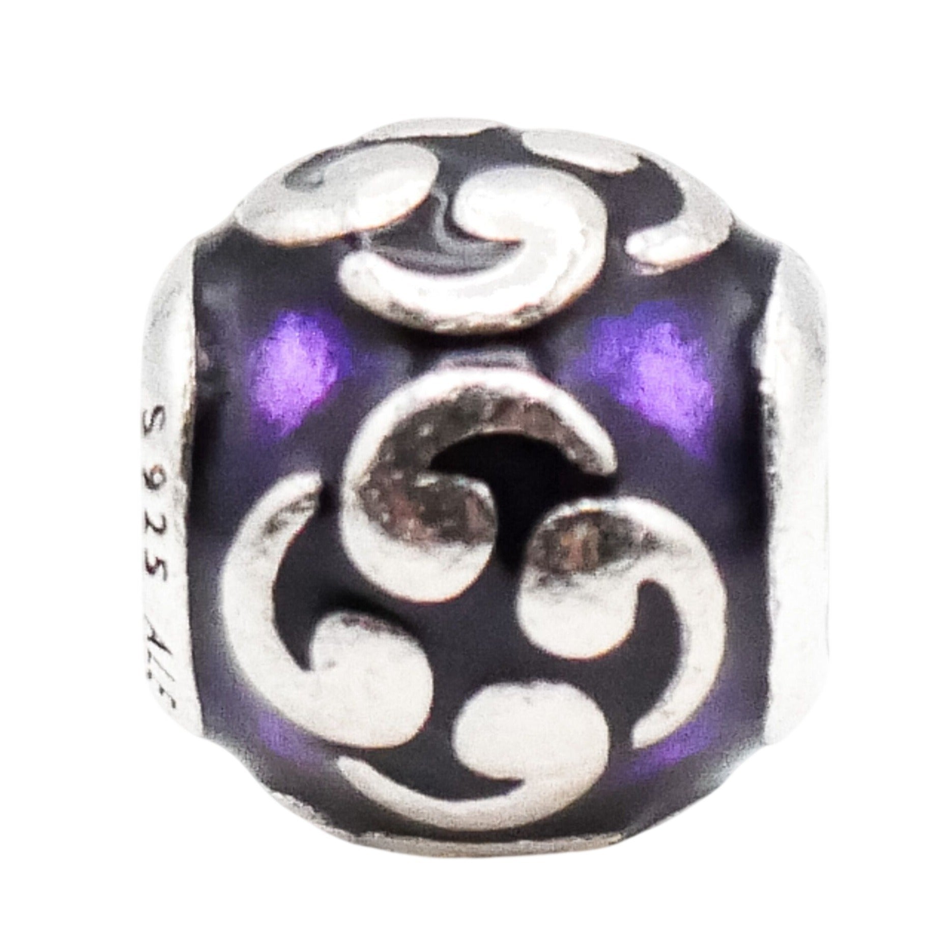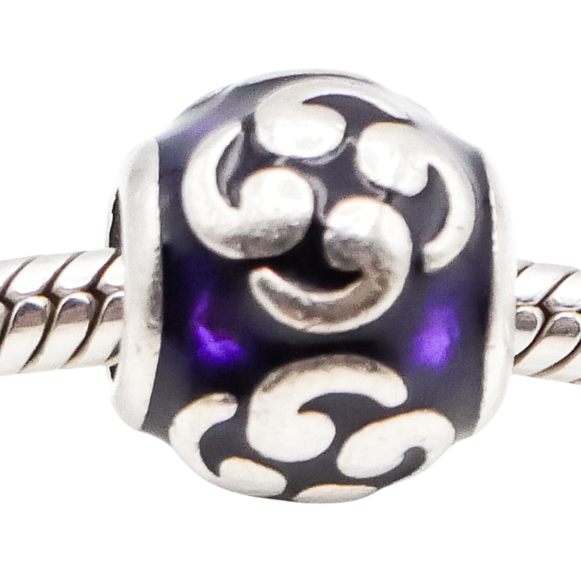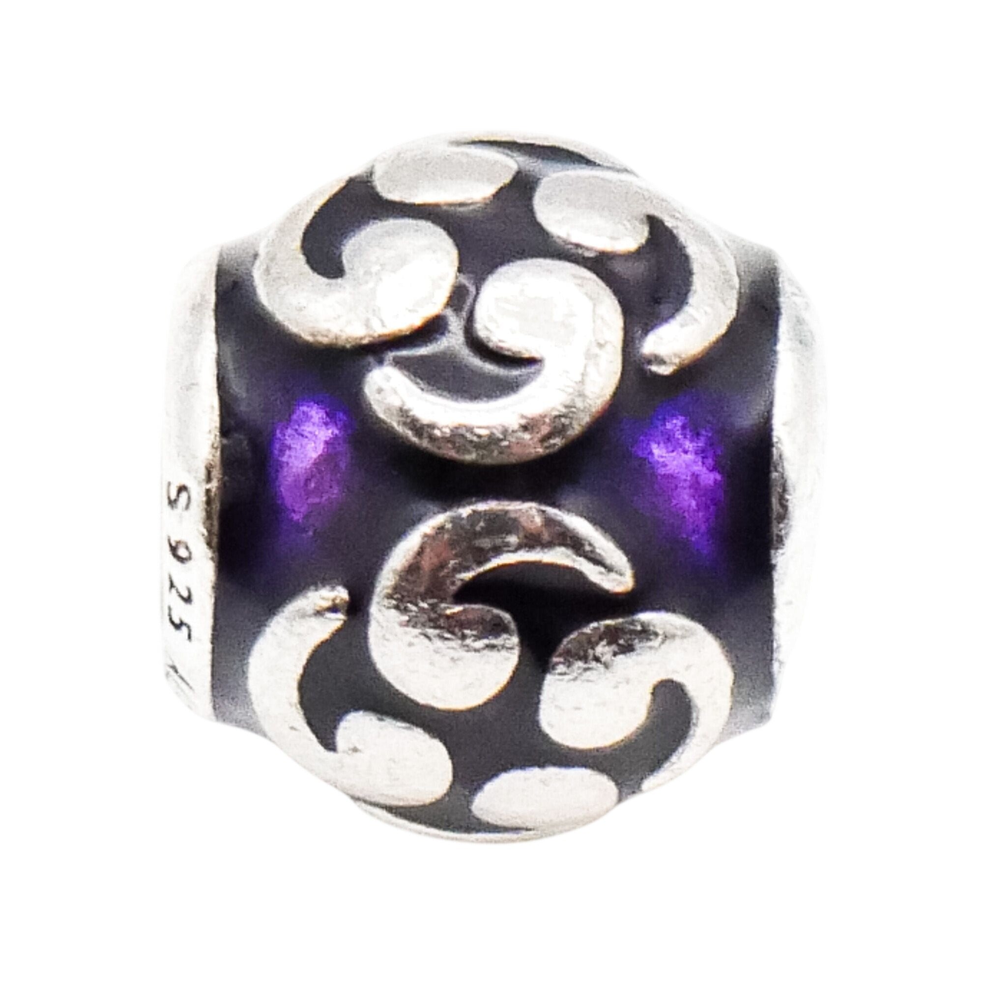 This serene Pandora Purple Zen charm features a graceful flowing sterling silver design accented with rich purple enamel. The calming curves and vibrant color create a balanced, meditative look that adds depth and meaning to any charm bracelet.