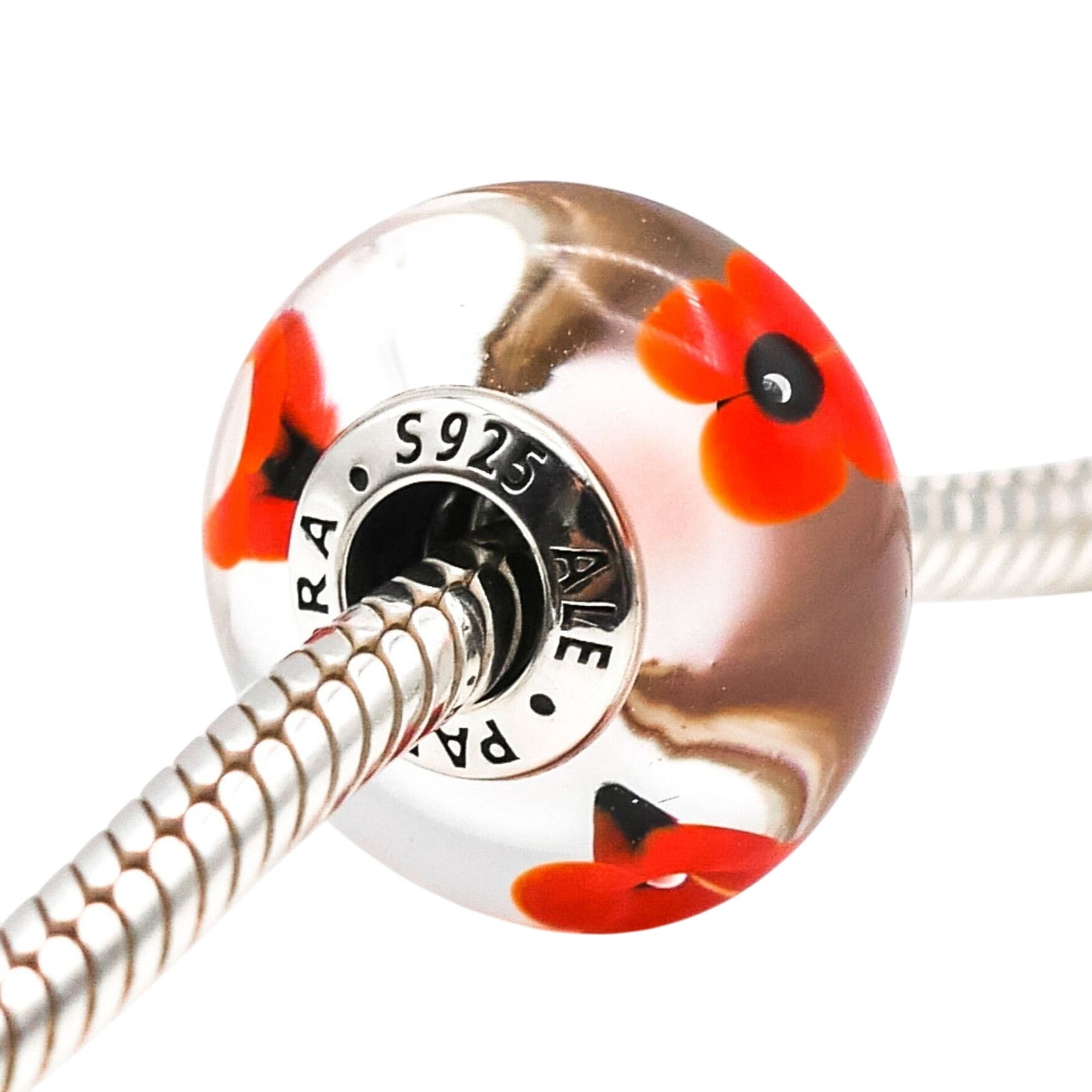 Authentic PANDORA RARE Wild Flower Tribute Murano Glass Sterling Silver Charm 791636 - Retired. This gorgeous Murano Glass bead features wildflowers in bright red on a white clear background. Beautiful from every angle. Red is the color of passion and draws attention like no other, radiating a strong and powerful energy that invokes us to take action.