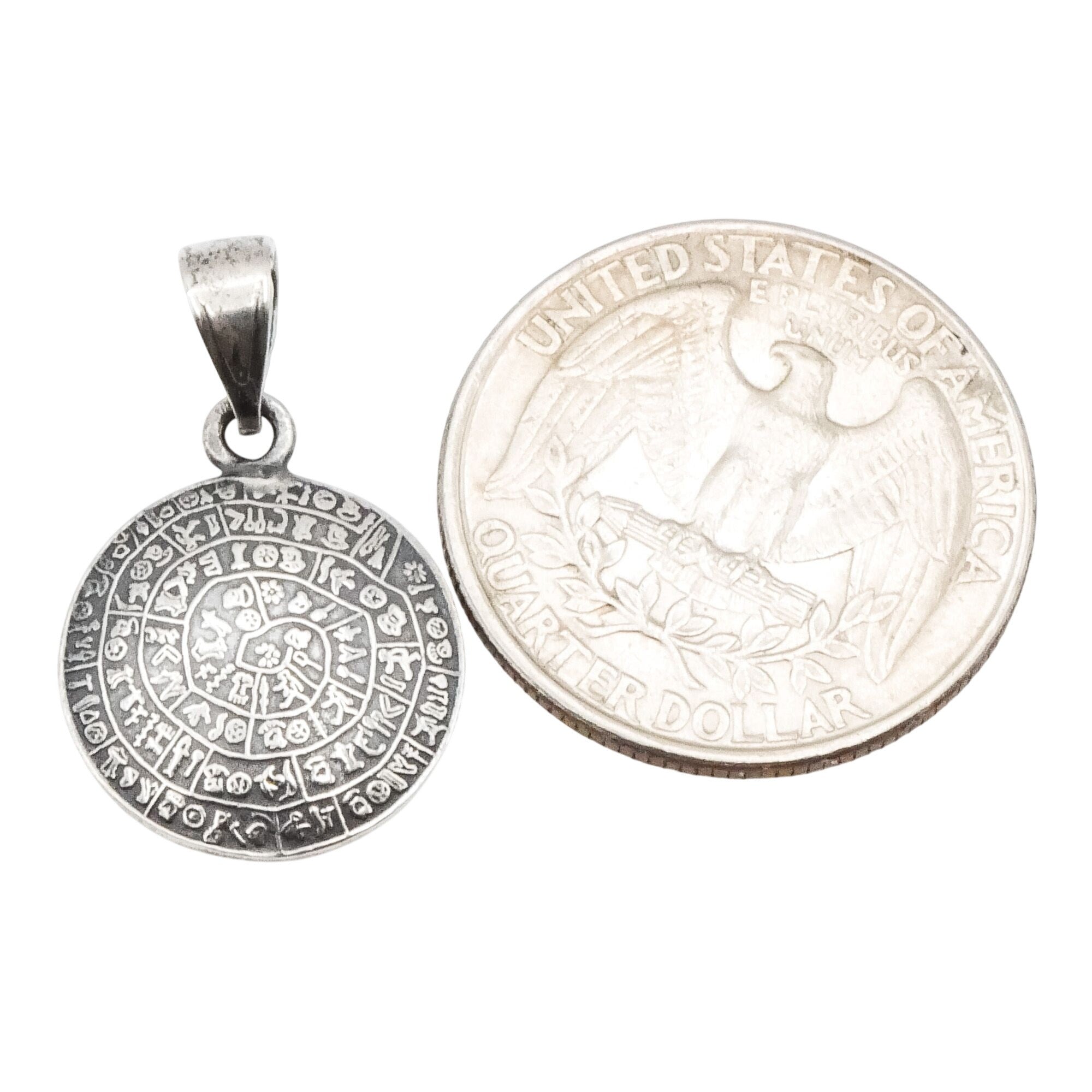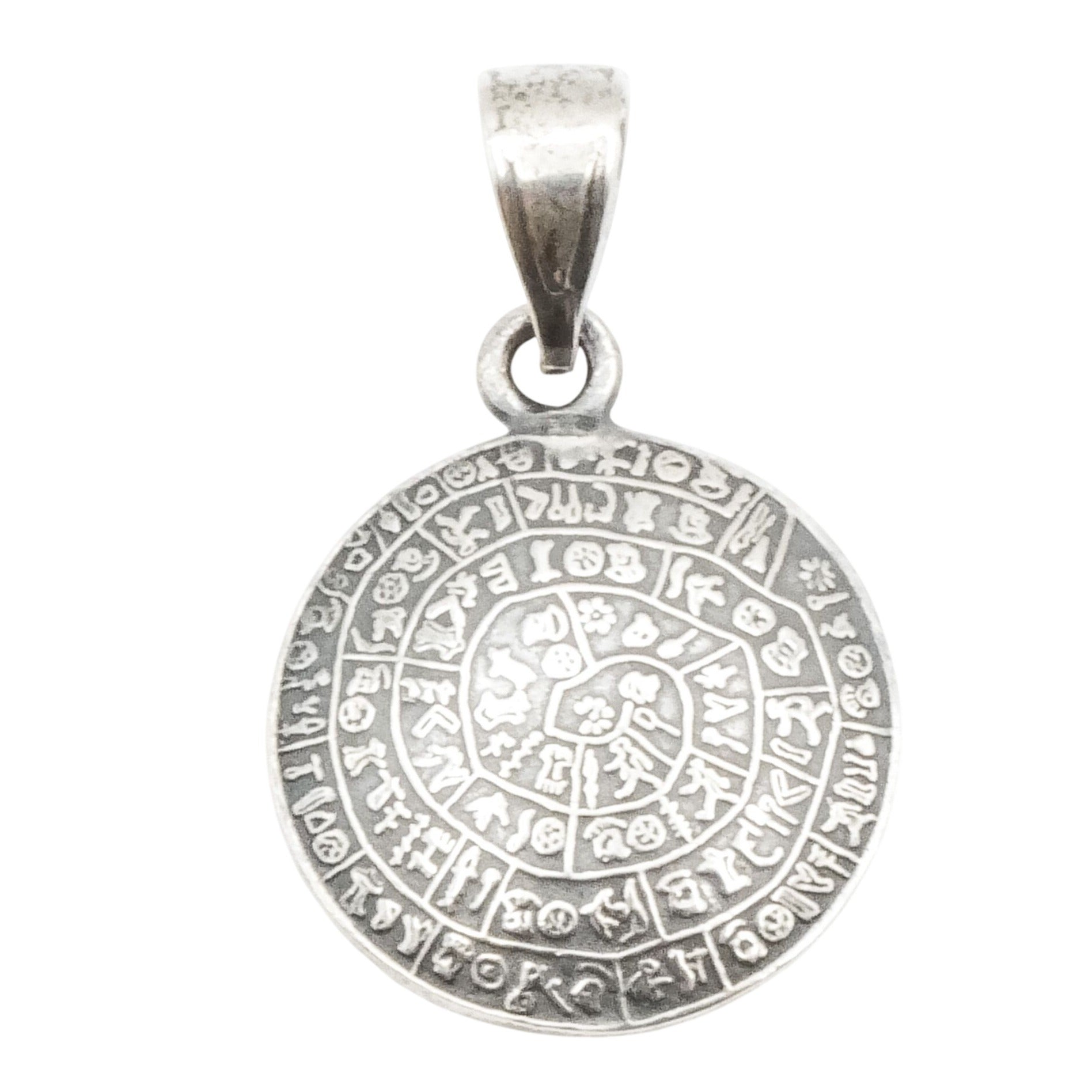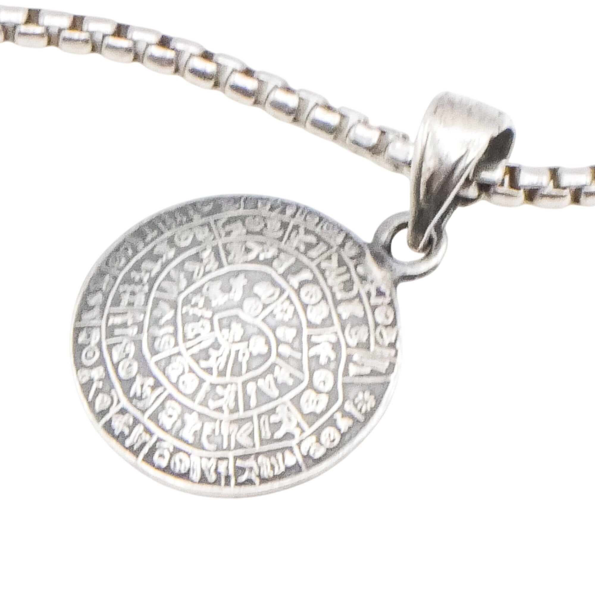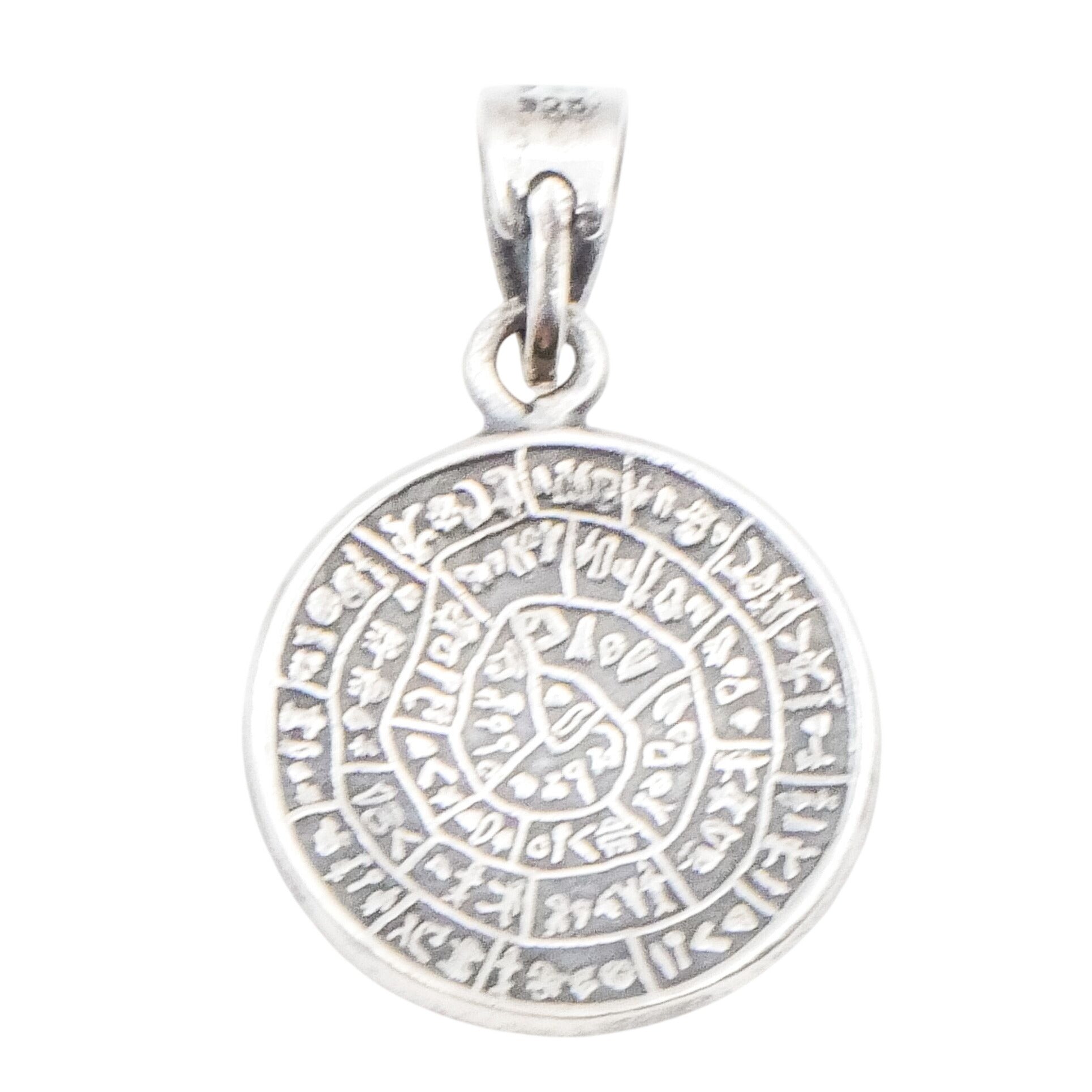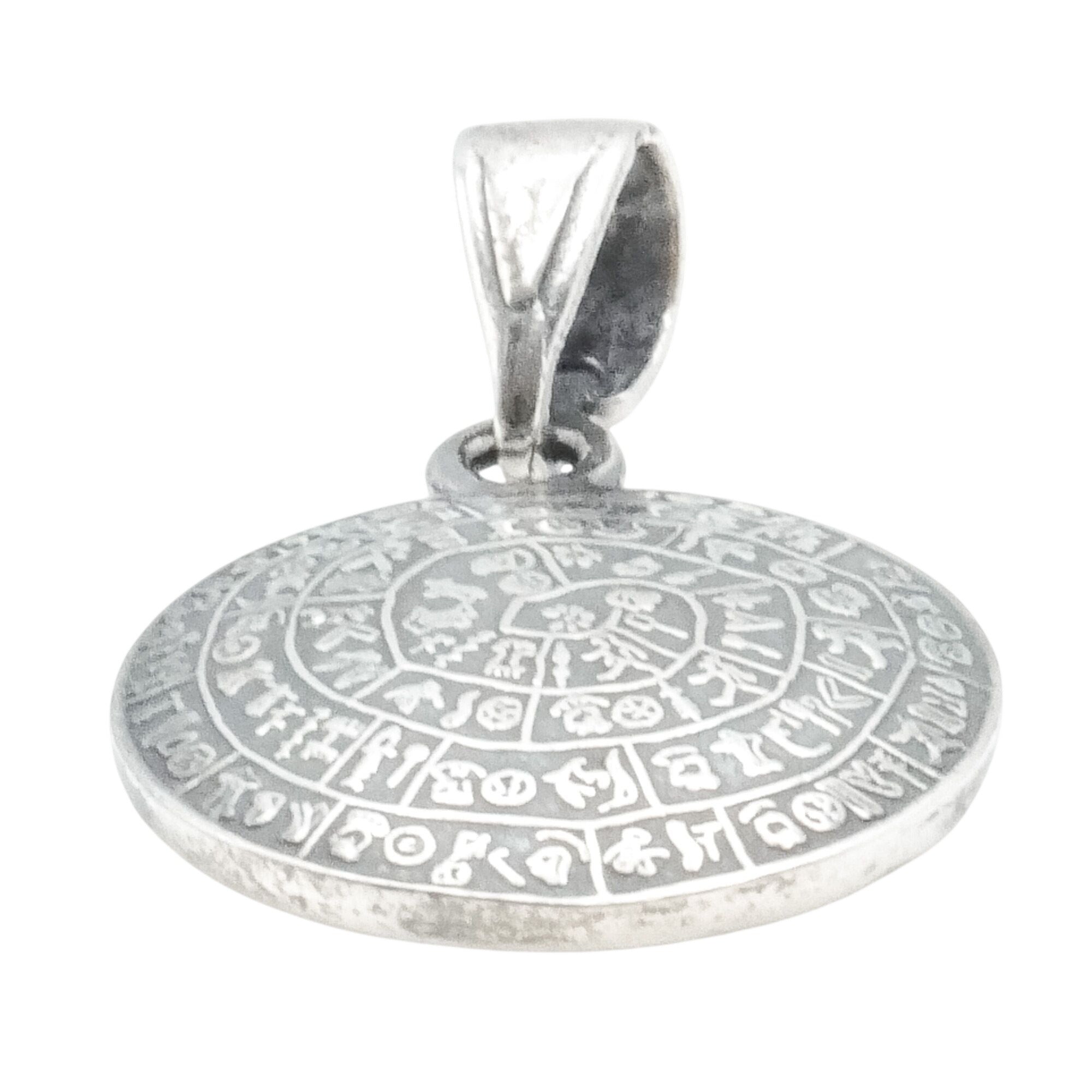 This sterling silver pendant is inspired by the ancient Phaistos Disc, one of the most intriguing artifacts of Minoan civilization. The round pendant features detailed spiral symbols reminiscent of the original clay disc discovered in Crete, dating back to the Bronze Age. Rich in history and symbolism, this piece makes a striking statement for lovers of archaeology, mythology, and ancient cultures.