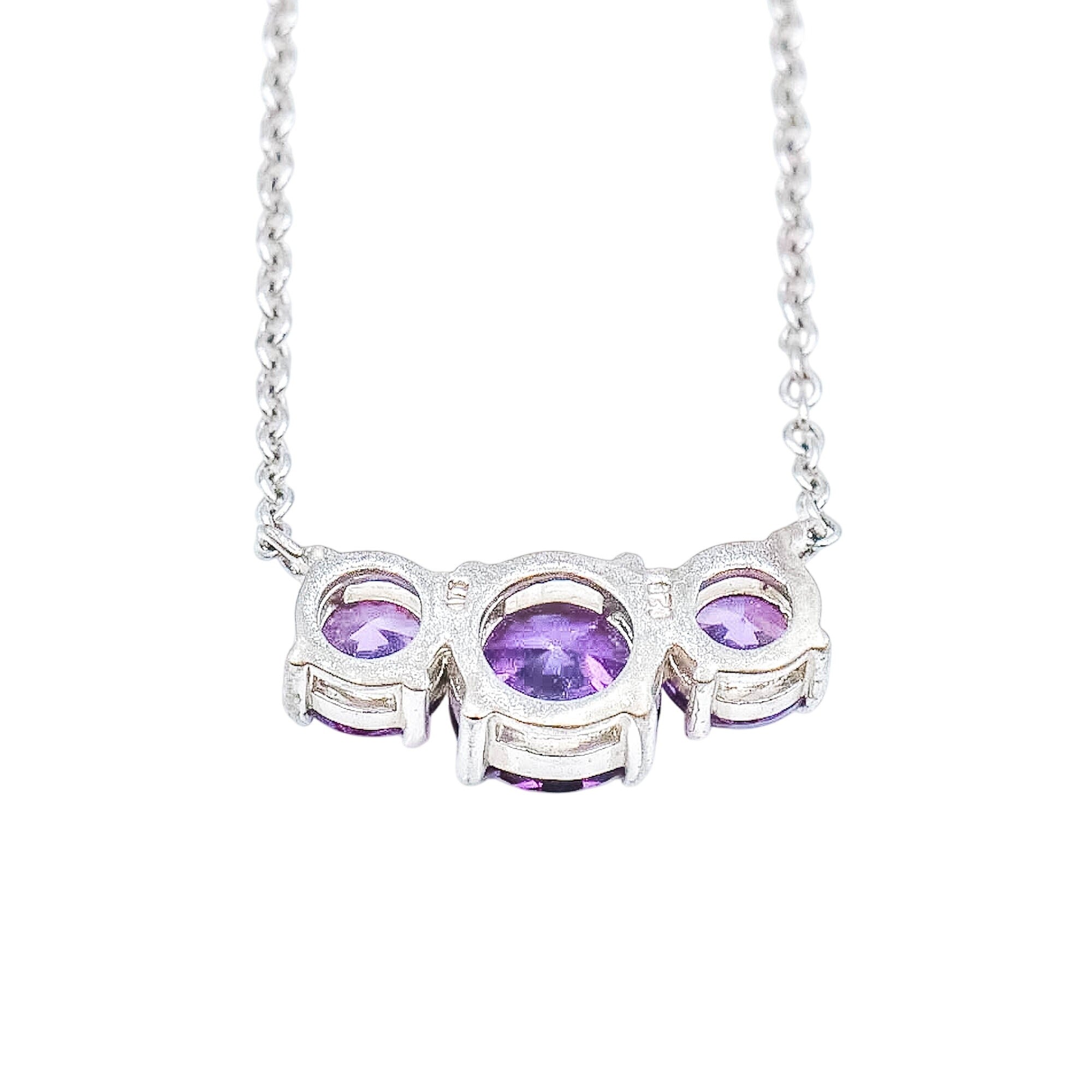This elegant vintage necklace features three round faceted Amethyst gemstones in graduated sizes, set along a 16-inch sterling silver chain. A timeless design perfect for everyday wear or meaningful gifting.