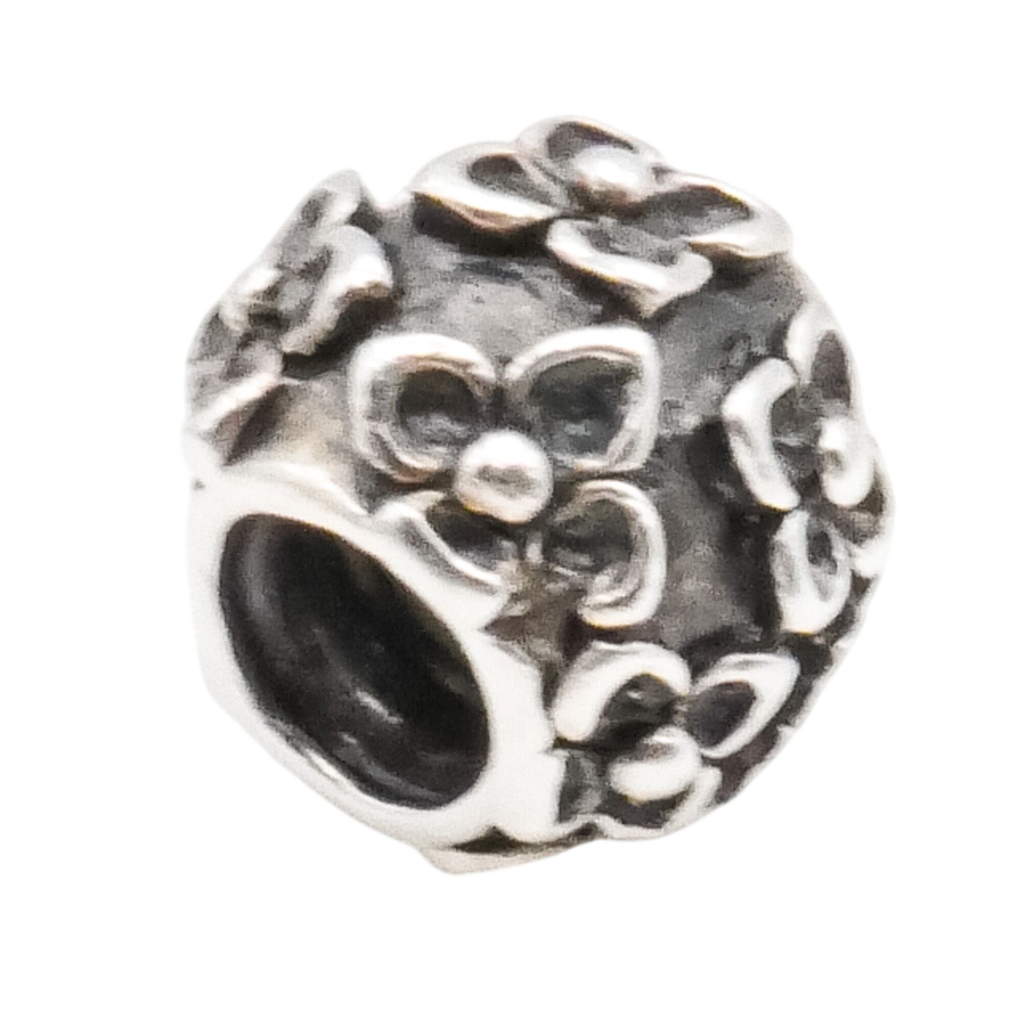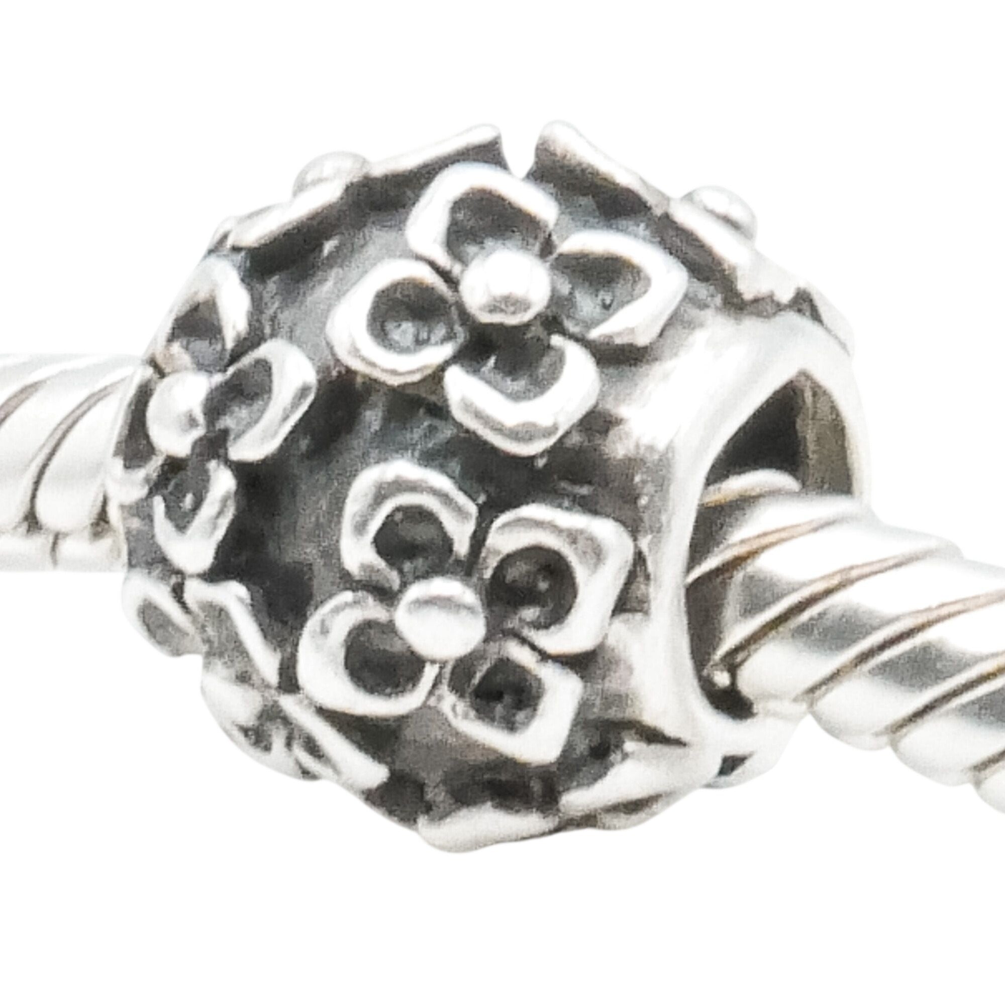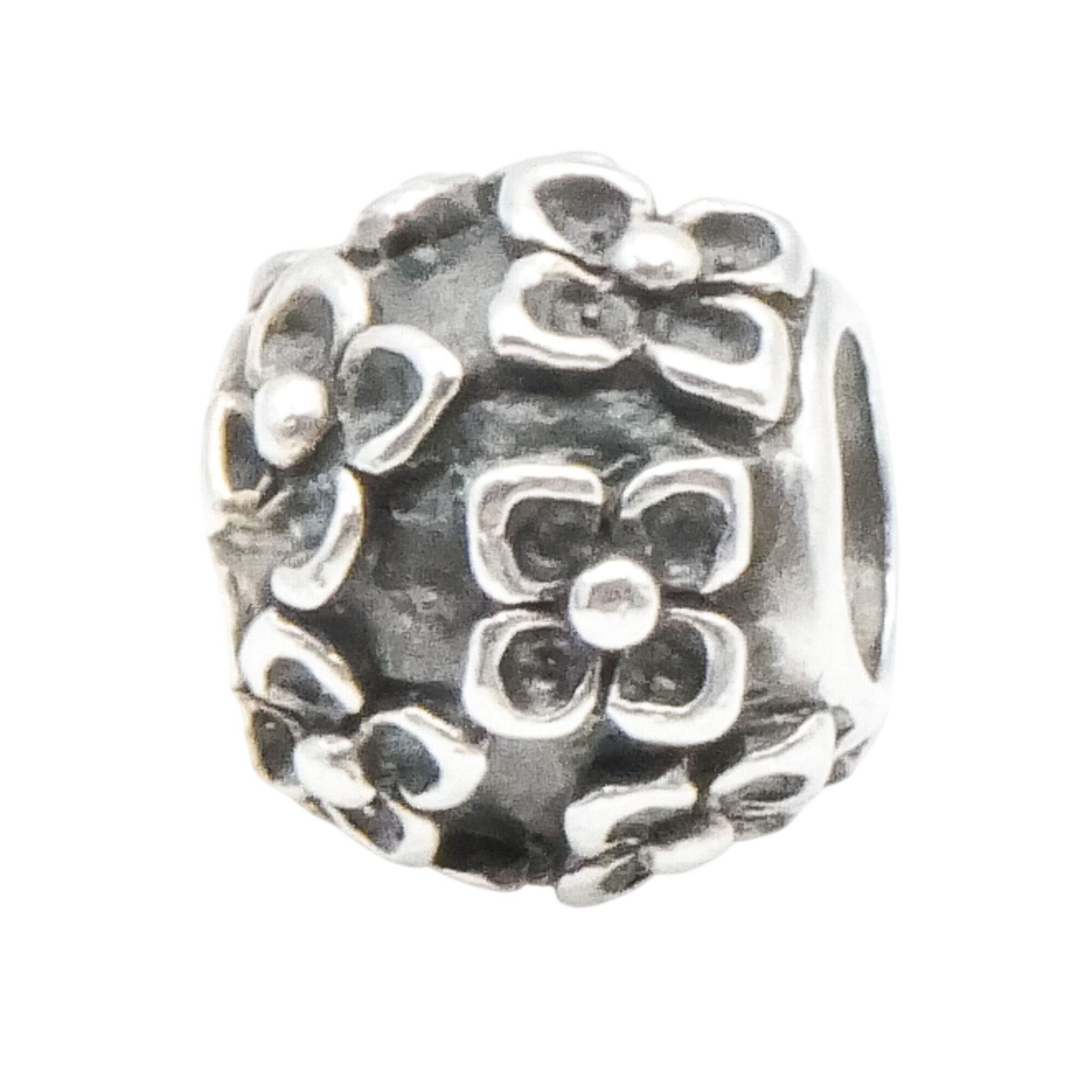 This charming Chamilia Small Flowers charm is crafted in genuine .925 sterling silver and features a continuous pattern of delicate raised floral motifs encircling the bead. The softly oxidized background highlights each flower, giving the charm depth, texture, and timeless appeal.