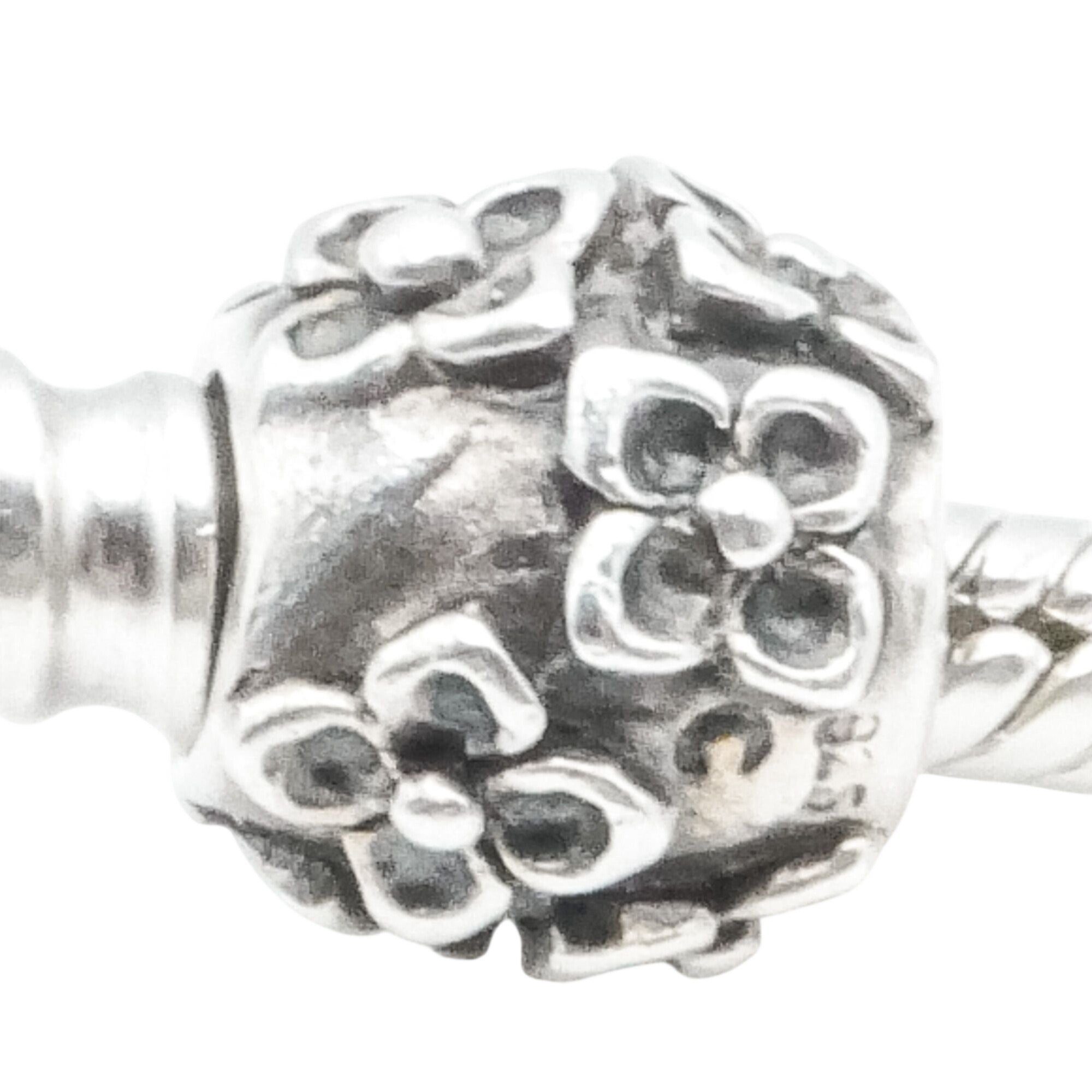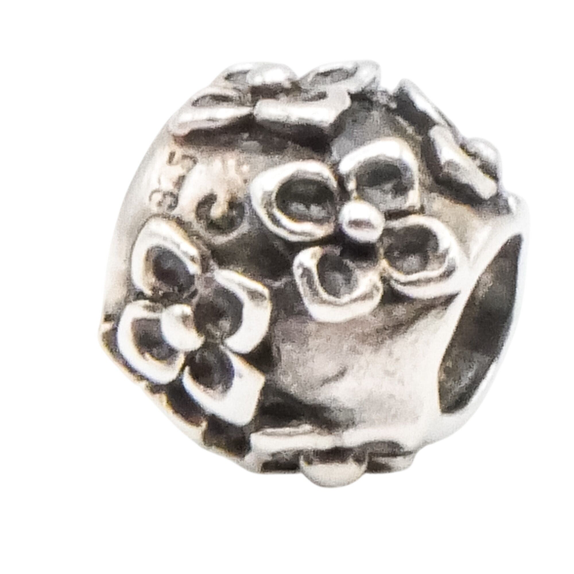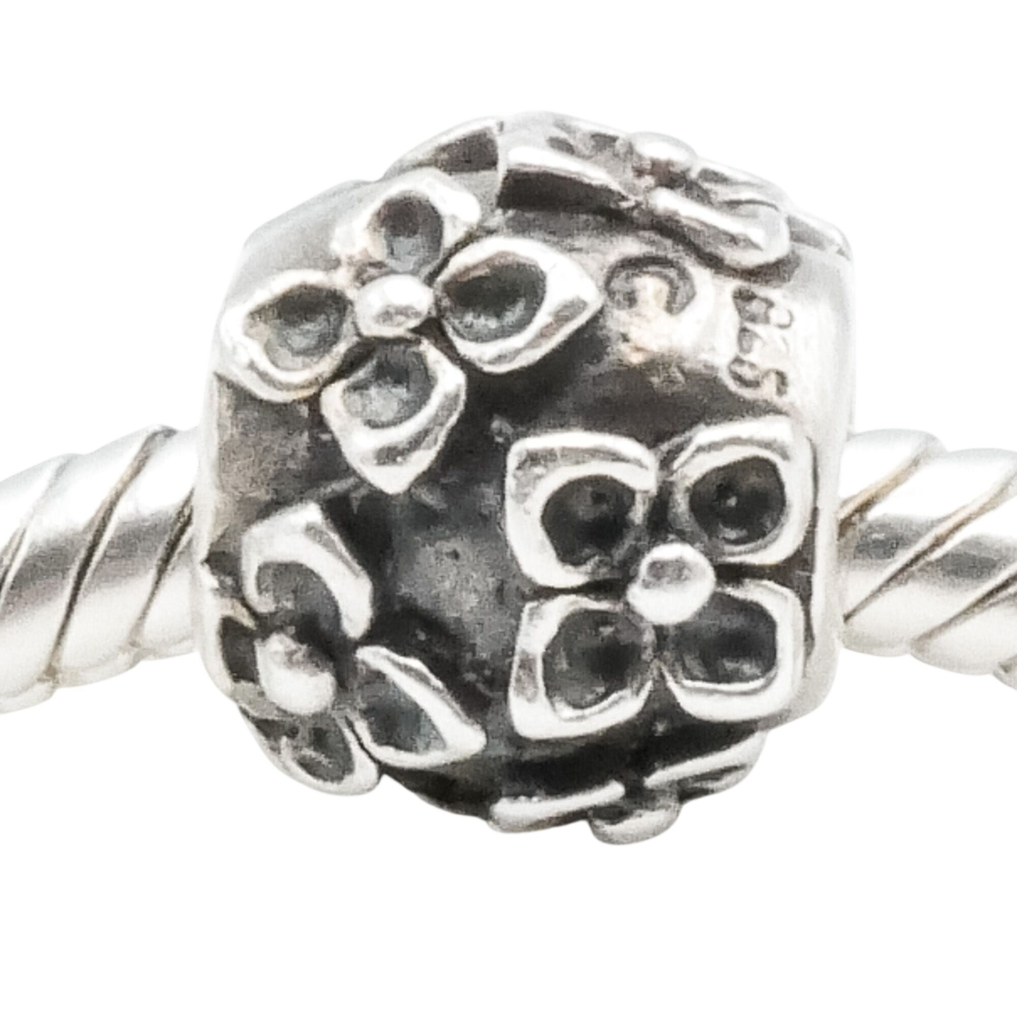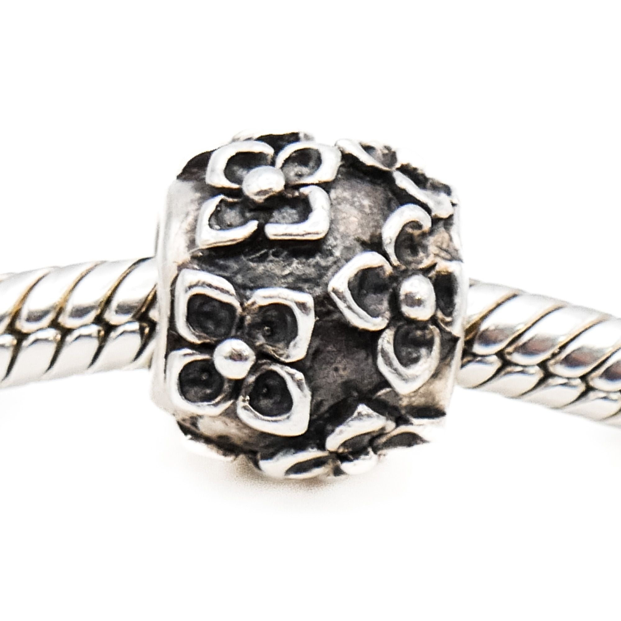 This charming Chamilia Small Flowers charm is crafted in genuine .925 sterling silver and features a continuous pattern of delicate raised floral motifs encircling the bead. The softly oxidized background highlights each flower, giving the charm depth, texture, and timeless appeal.