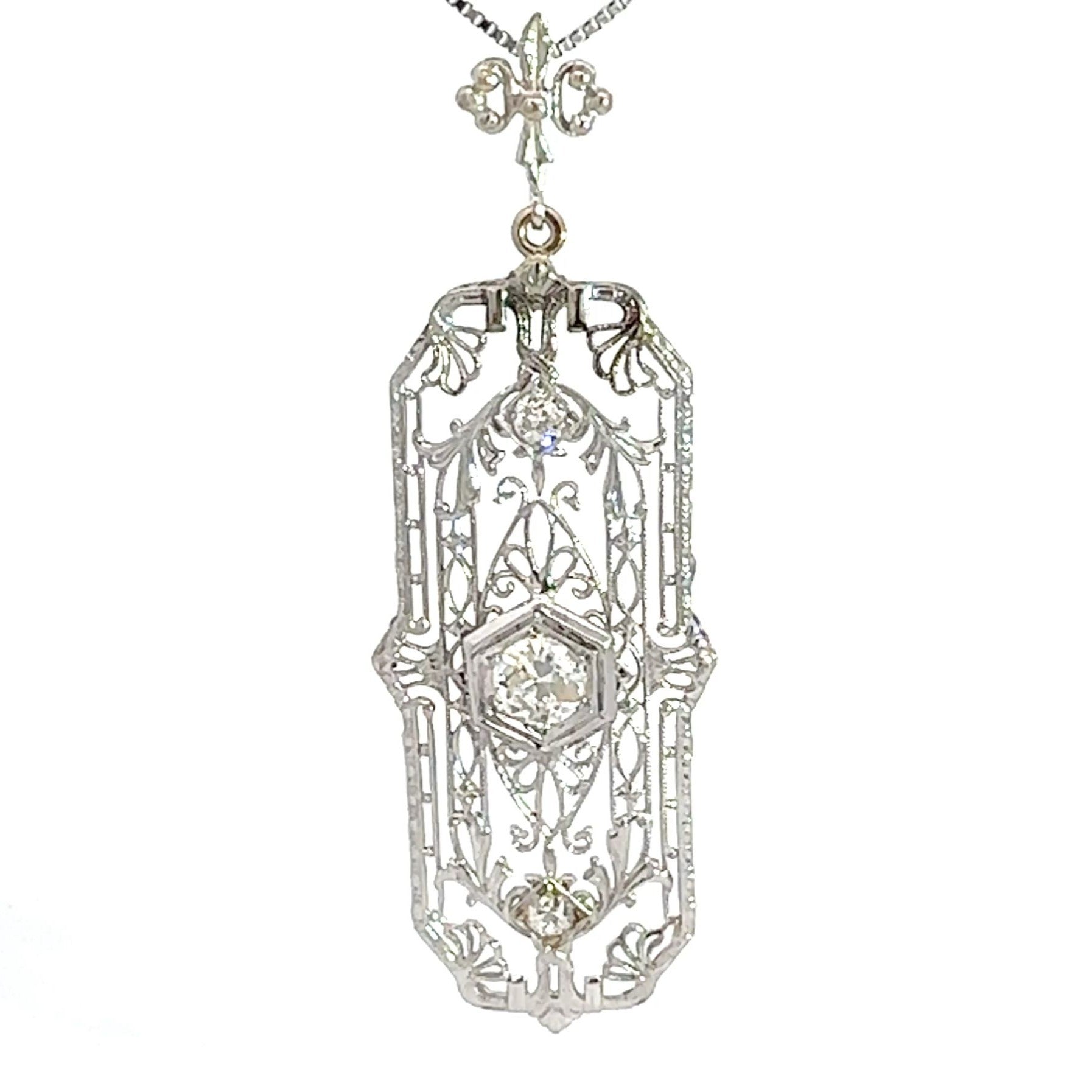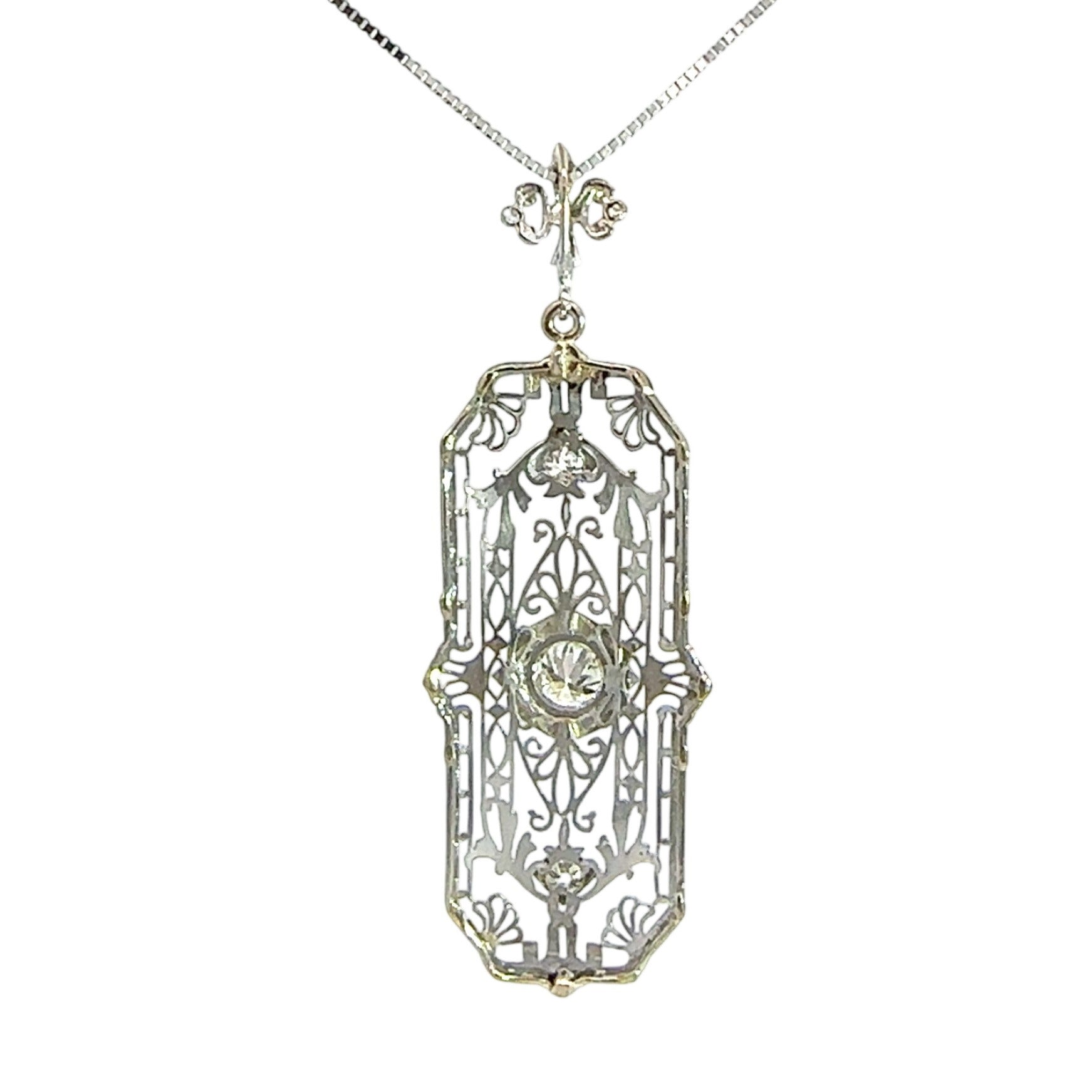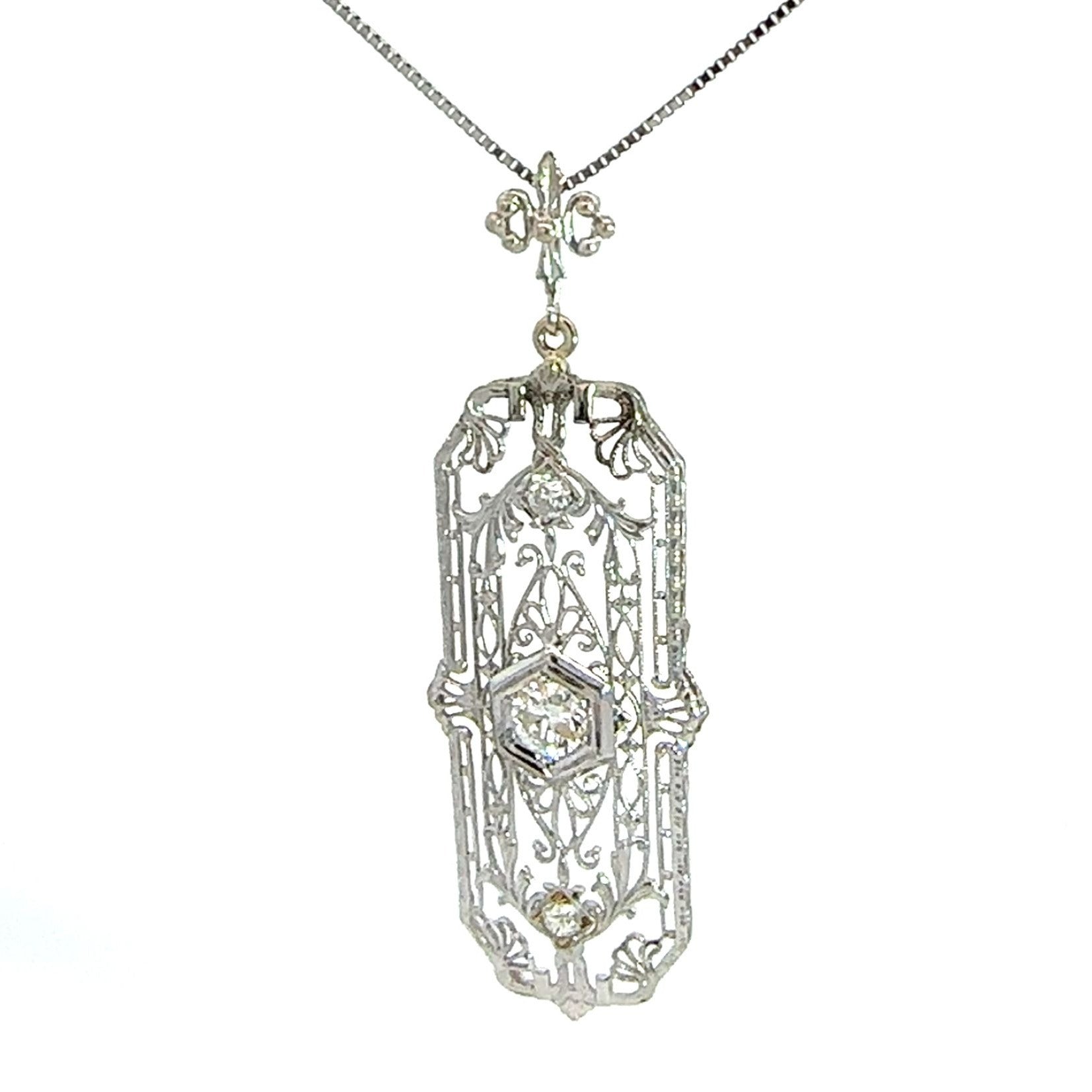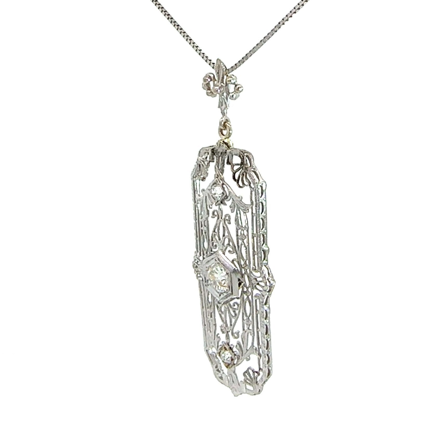 14K White Gold Filigree Pendant with Old European Cut Diamonds on 24-Inch Box Chain