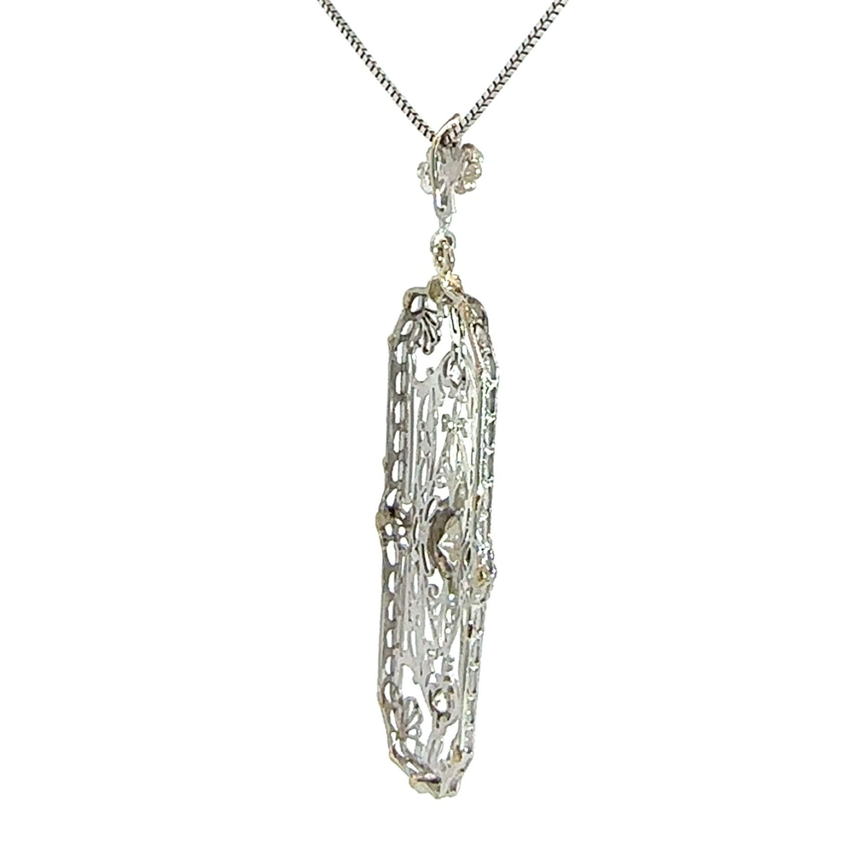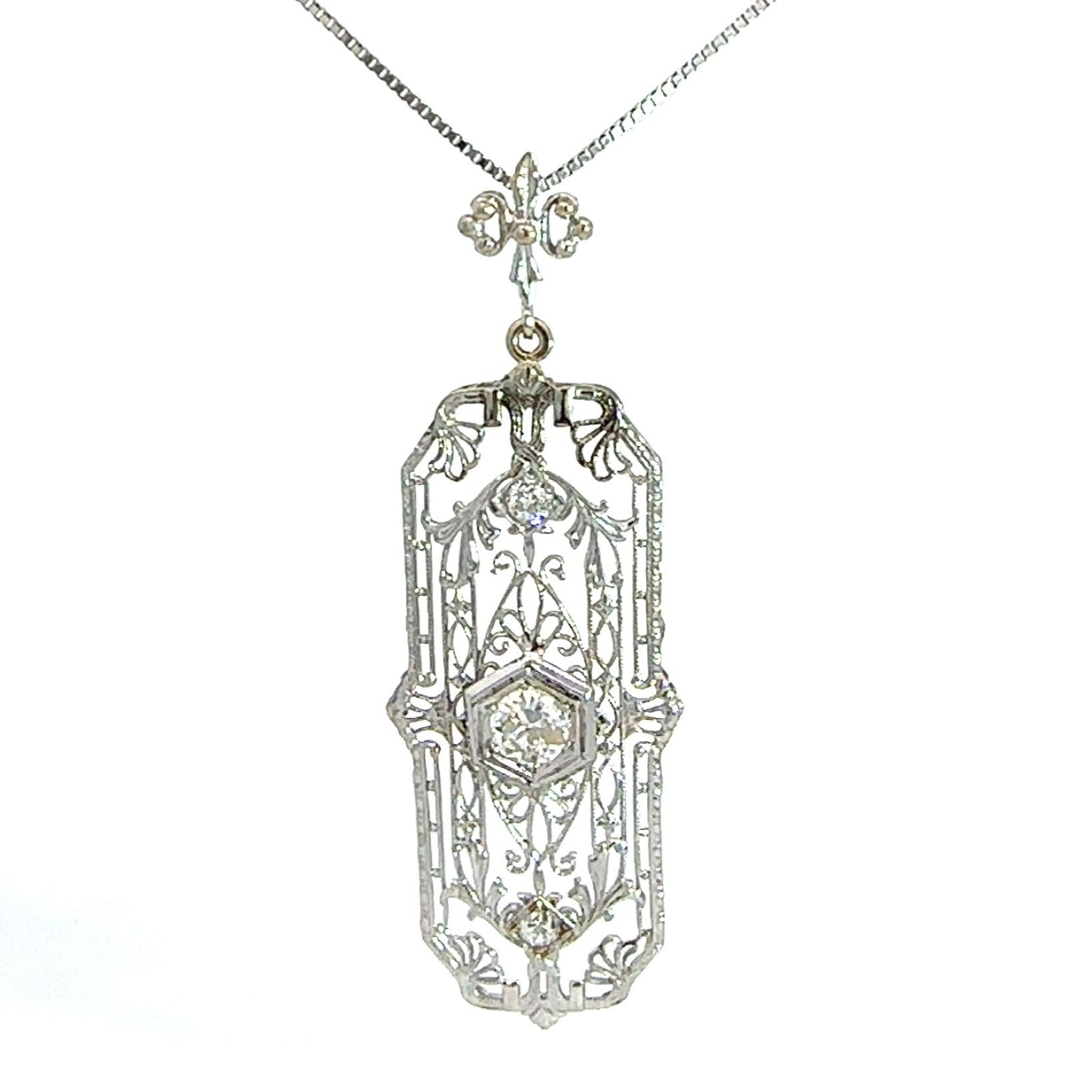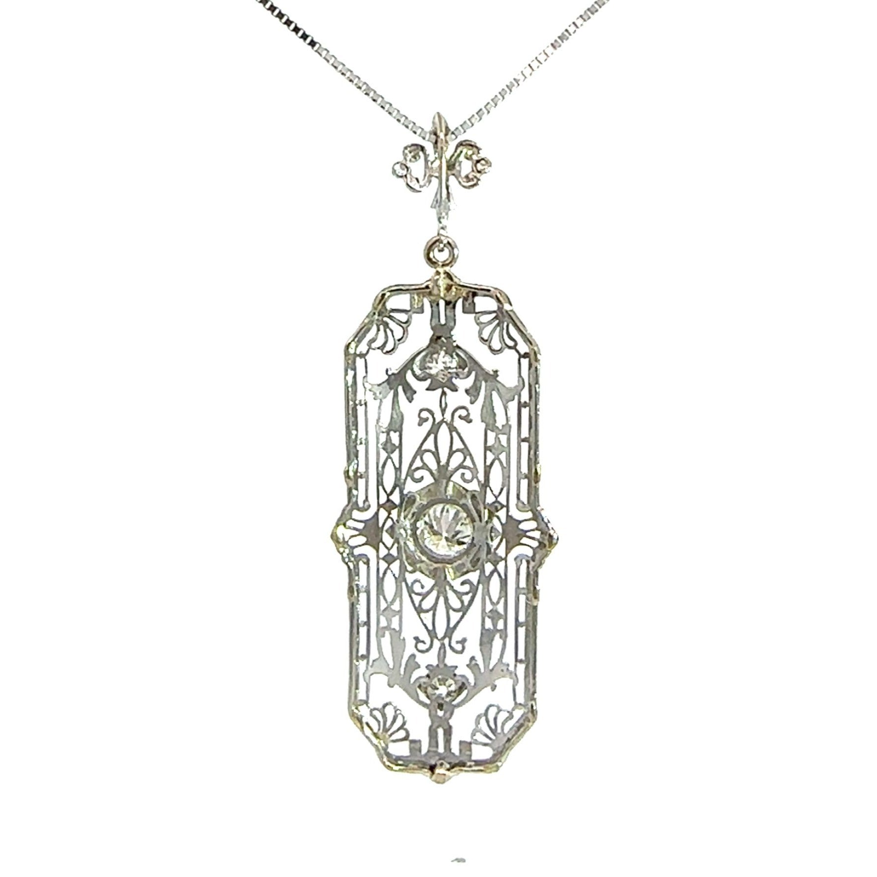 14K White Gold Filigree Pendant with Old European Cut Diamonds on 24-Inch Box Chain