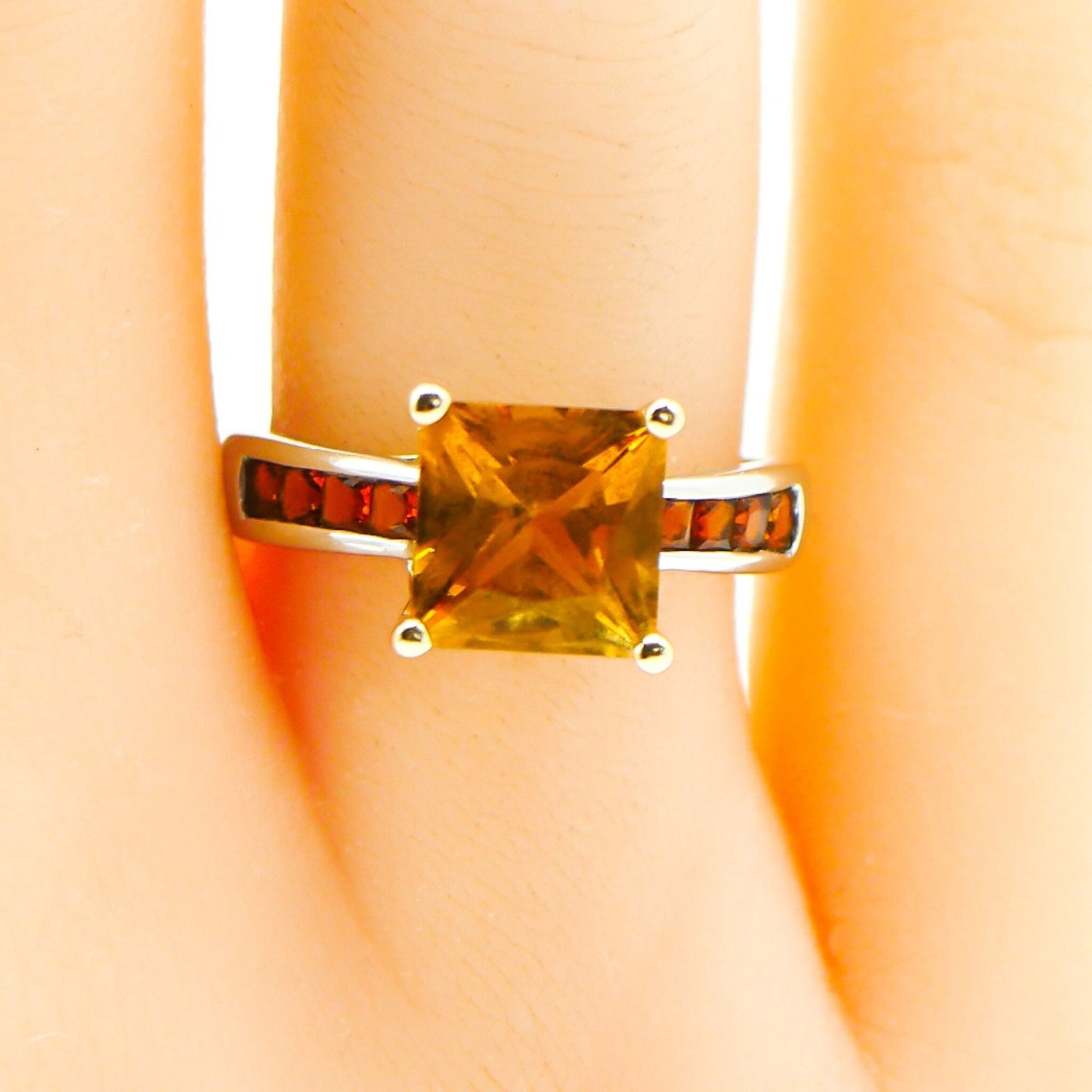 The center Madeira citrine is prong set in 14K yellow gold, highlighting its deep amber tone and exceptional clarity. The 14K white gold band is adorned with four square-cut channel-set cognac citrine gemstones on each side, adding depth and symmetry to the design.