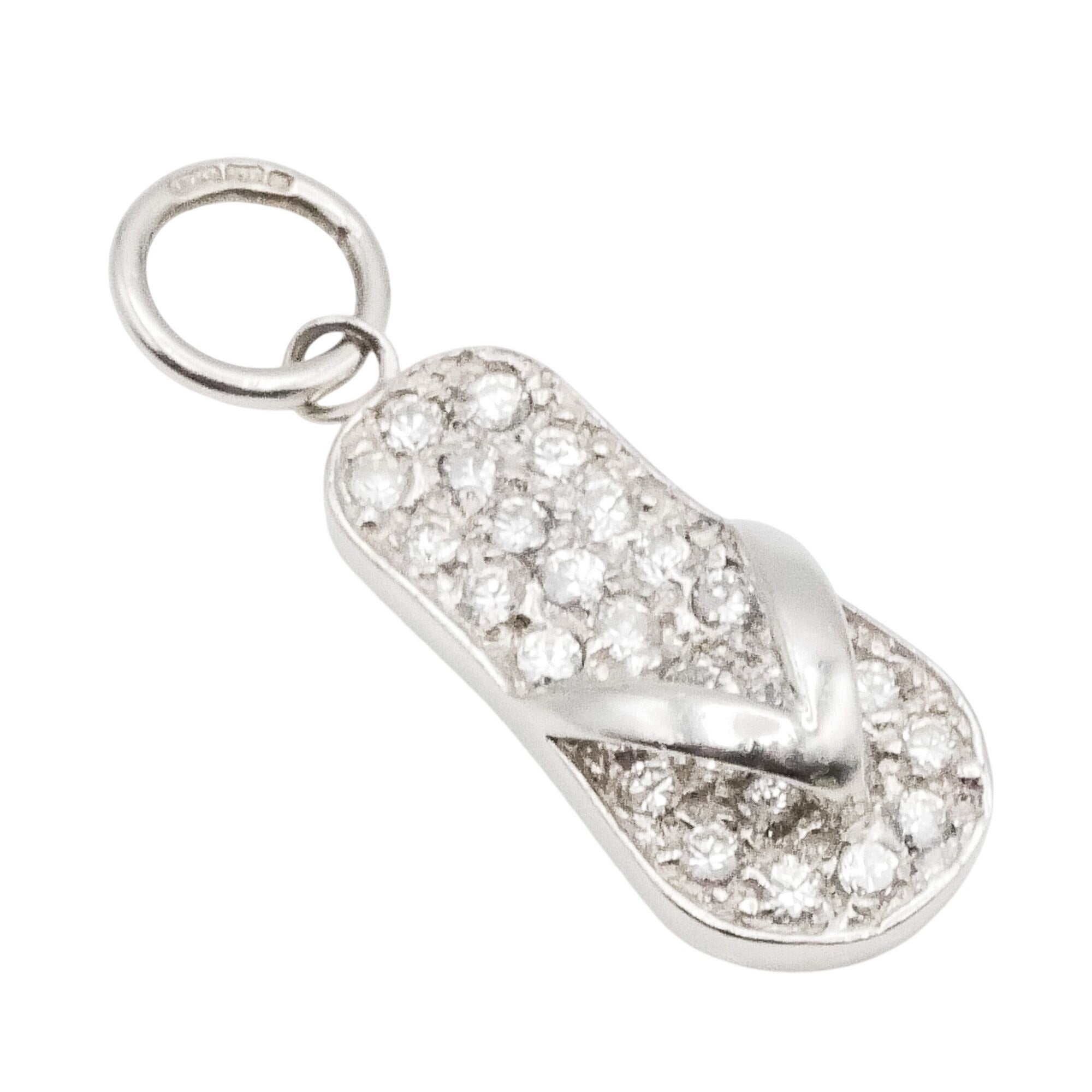 This elegant 9K white gold flip flop charm pendant features a playful yet refined design accented with clear cubic zirconia stones that add brilliant sparkle across the sandal motif. Crafted in solid 9K white gold, this charm offers a beautiful balance of luxury and whimsy.