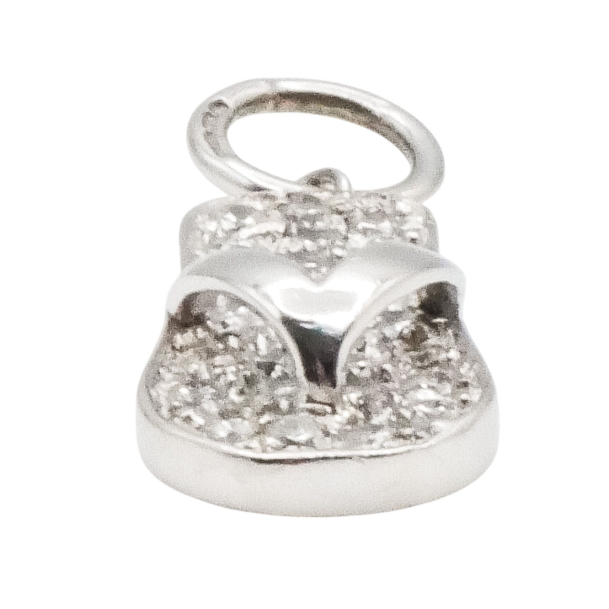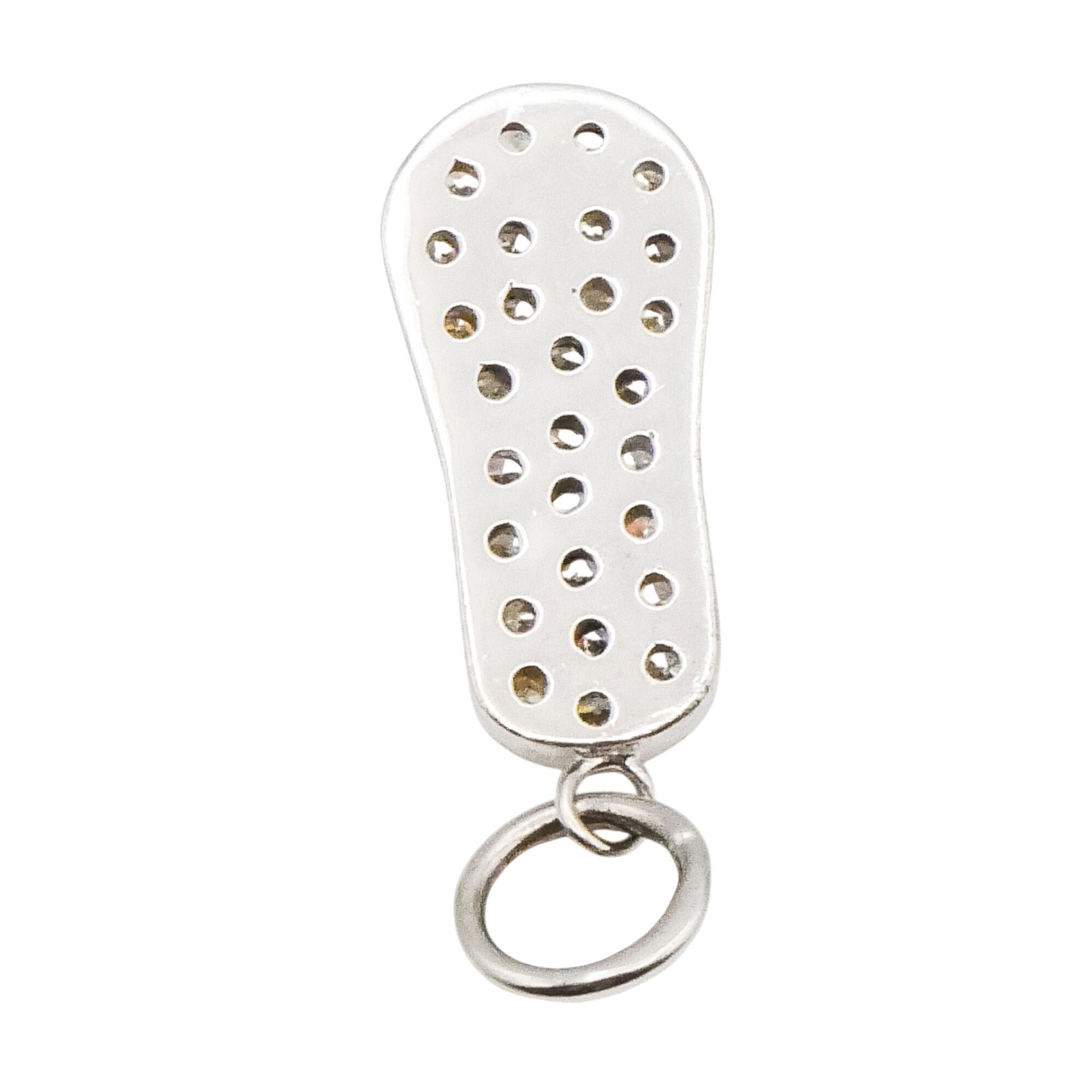 The pavé-style CZ detailing enhances the flip flop shape, making it a perfect charm for beach lovers, summer jewelry collections, or anyone who appreciates finely crafted novelty charms. Its petite size makes it ideal for wear on a charm bracelet or necklace chain.