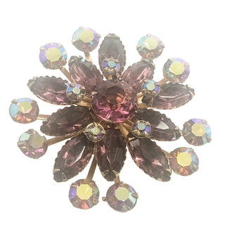 Vintage Unsigned Gold Tone Flower Brooch With Unfoiled Purple and AB Rhinestones