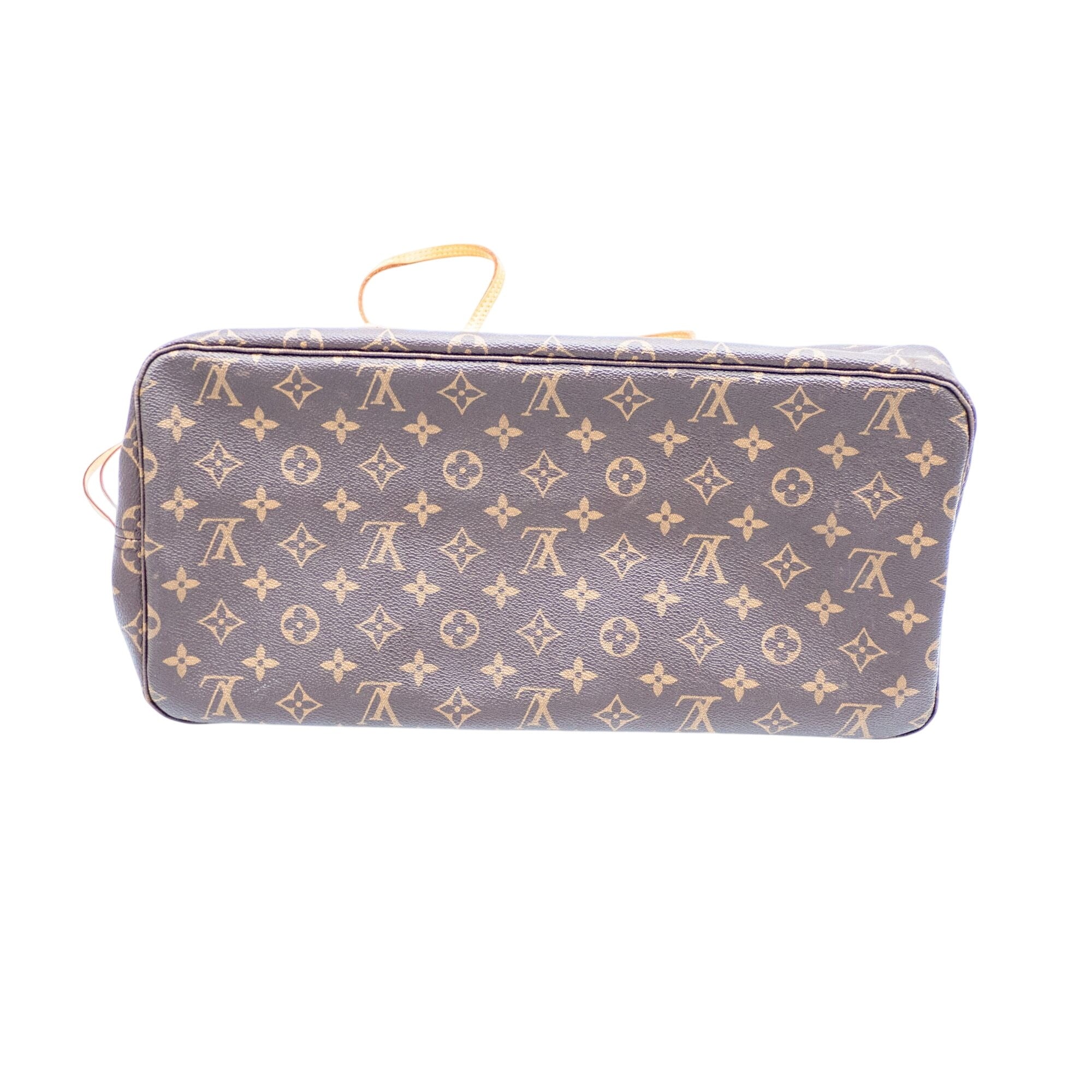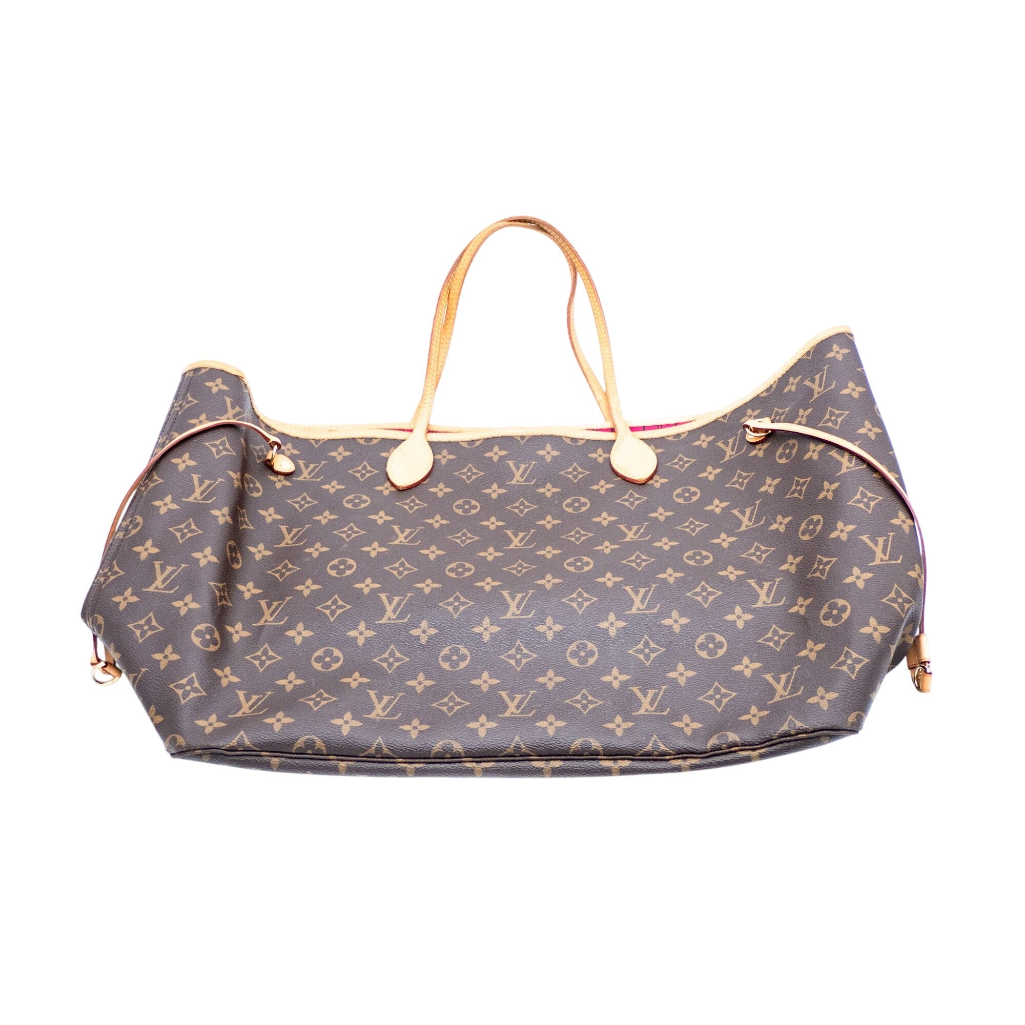 This authentic Louis Vuitton Neverfull GM tote bag in the iconic Monogram coated canvas is the largest of the Neverfull line, offering both fashion and function in one highly coveted piece. This stunning tote comes with the matching removable pouch and features fuchsia interior lining, natural cowhide leather trim, and gold-tone hardware.